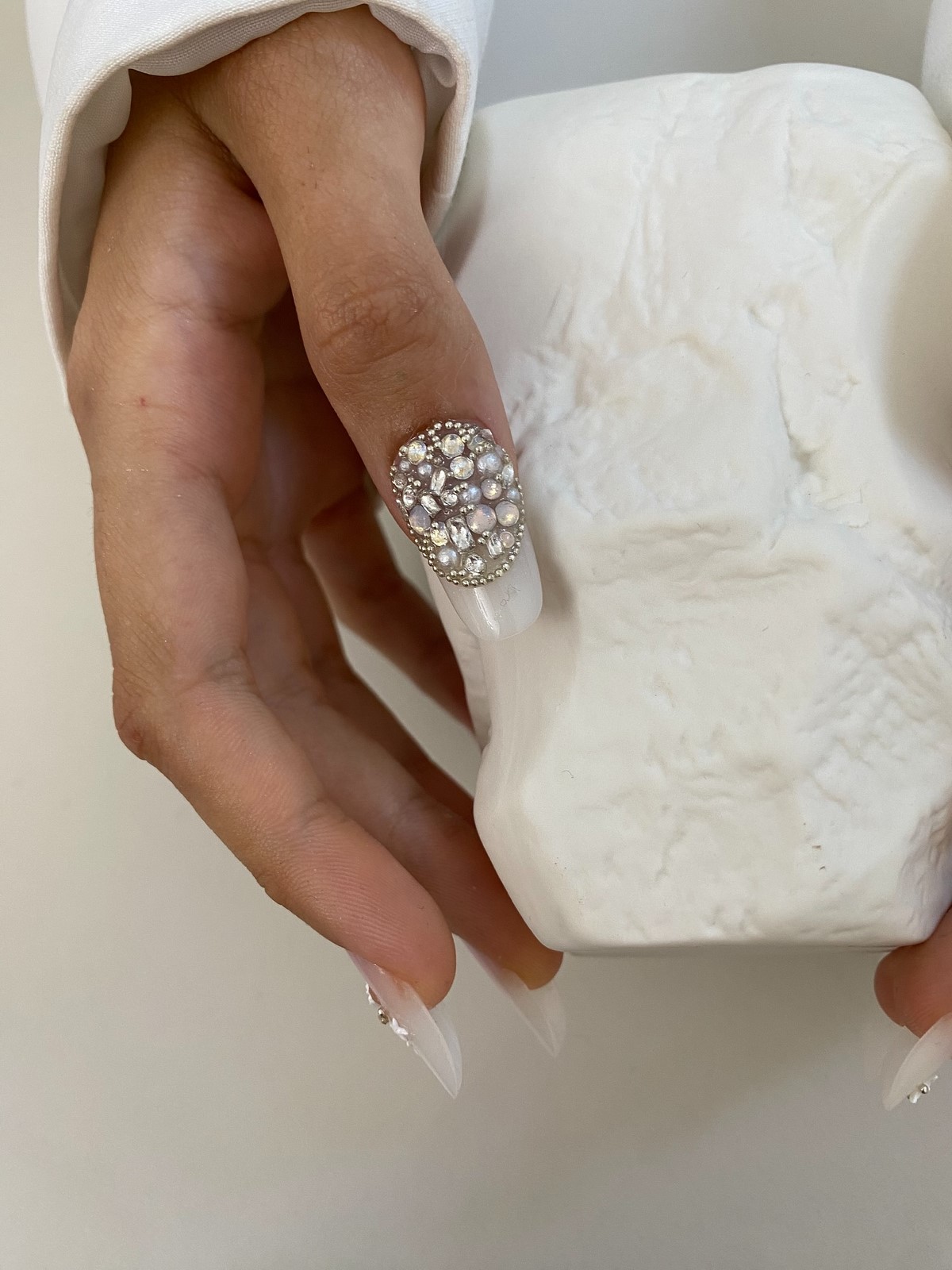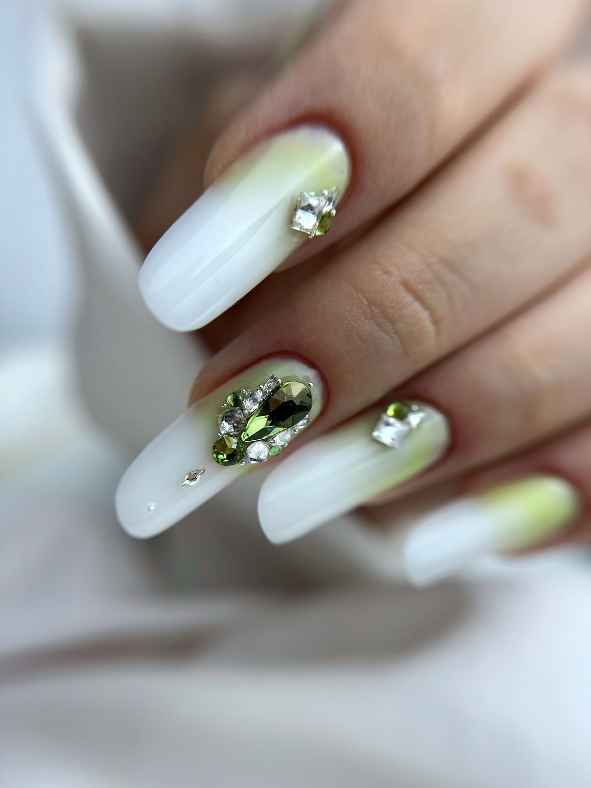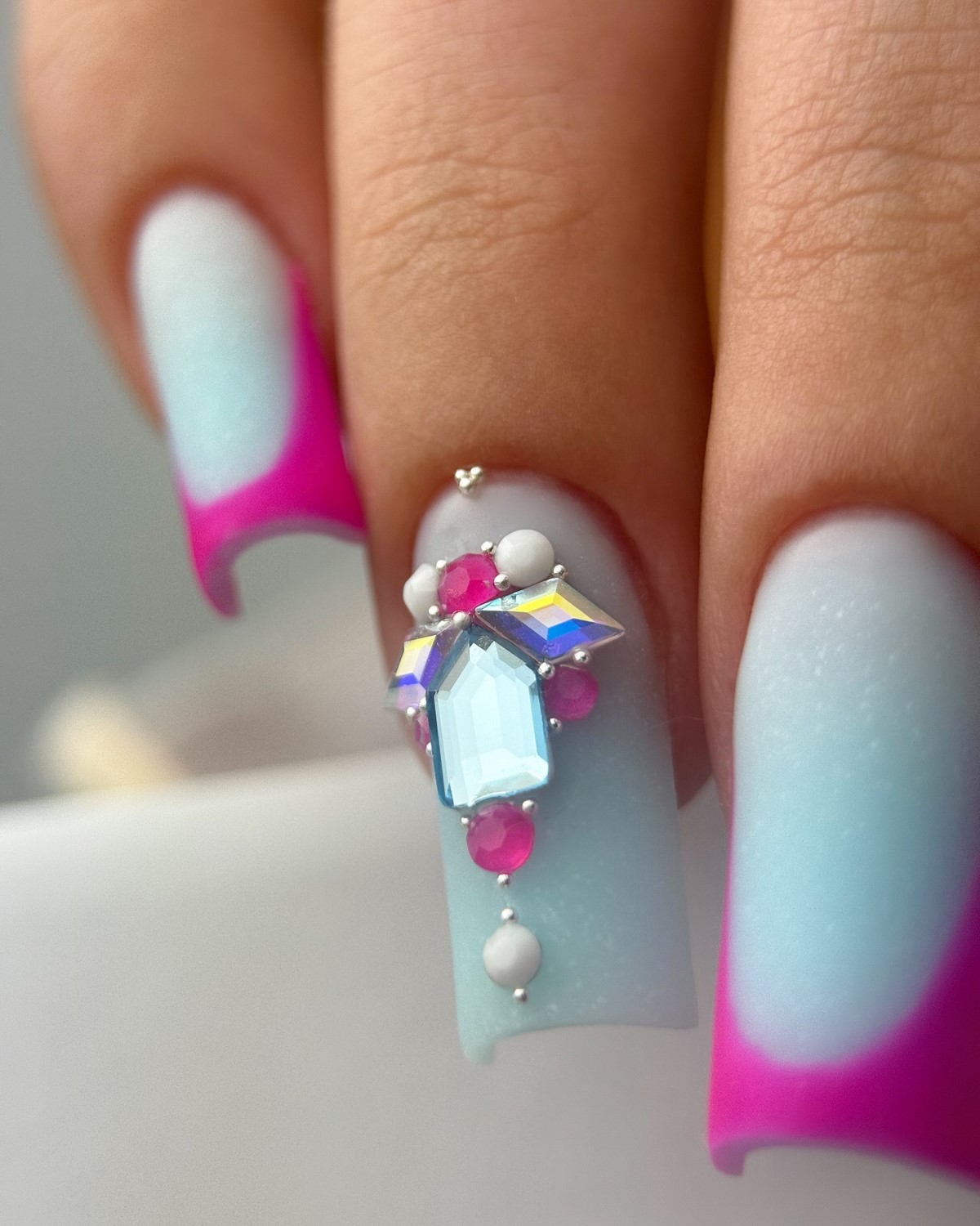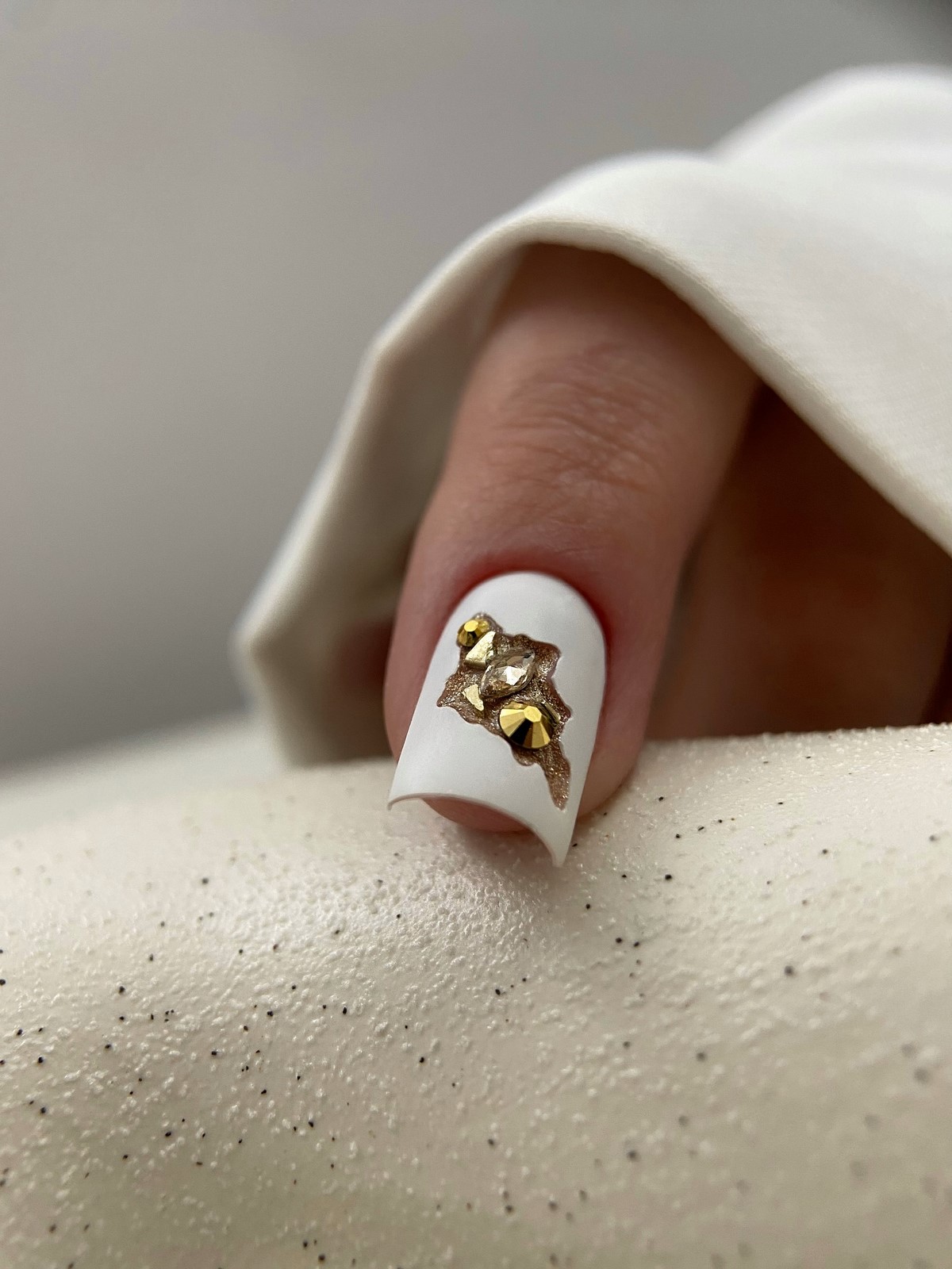 Монохромный подход с использованием крупных страз того же оттенка, что и основное покрытие, создает элегантный тон-в-тон эффект. Такой дизайн выглядит дорого и изысканно. Крупные элементы становятся центральным акцентом композиции, не перегружая общий вид.