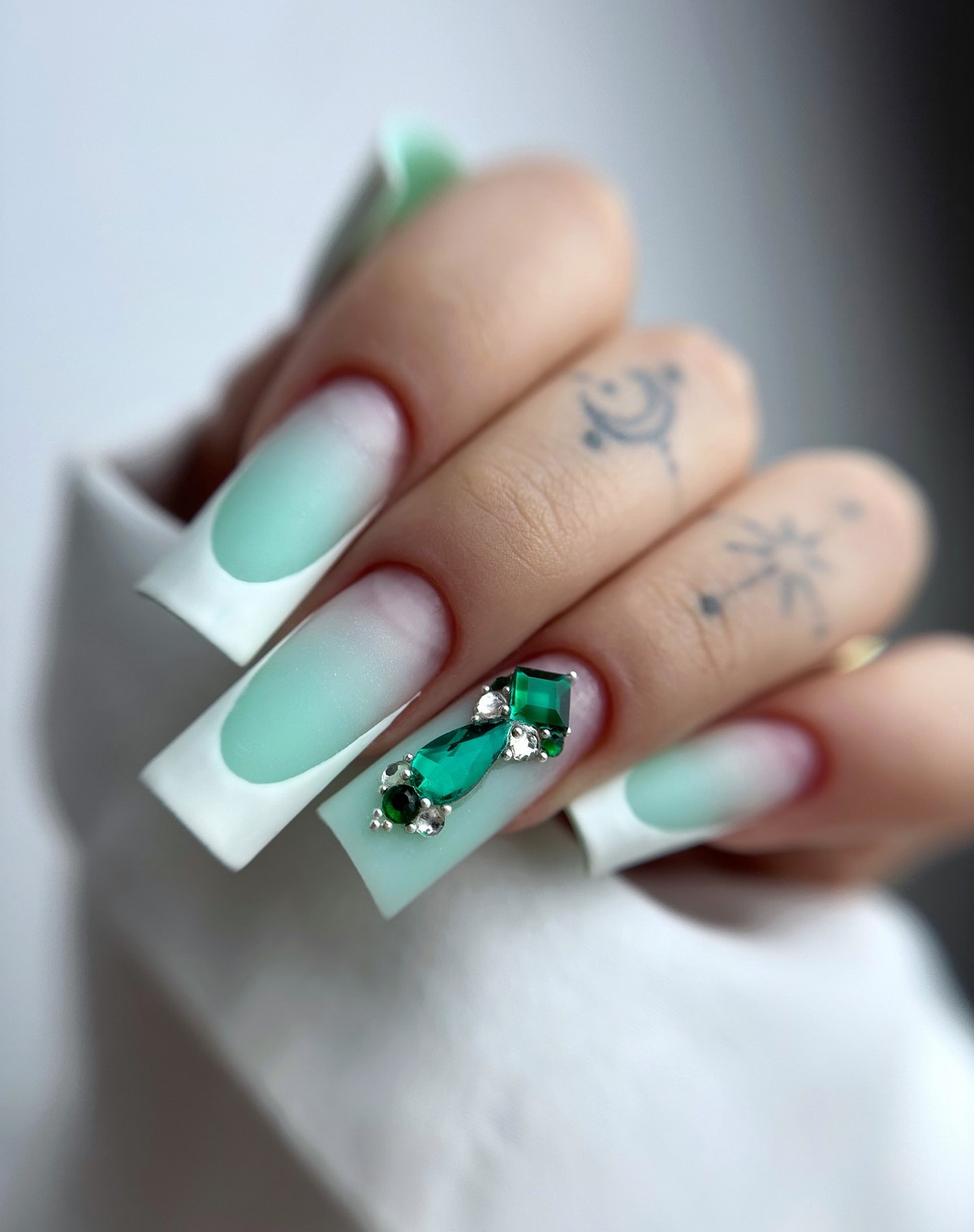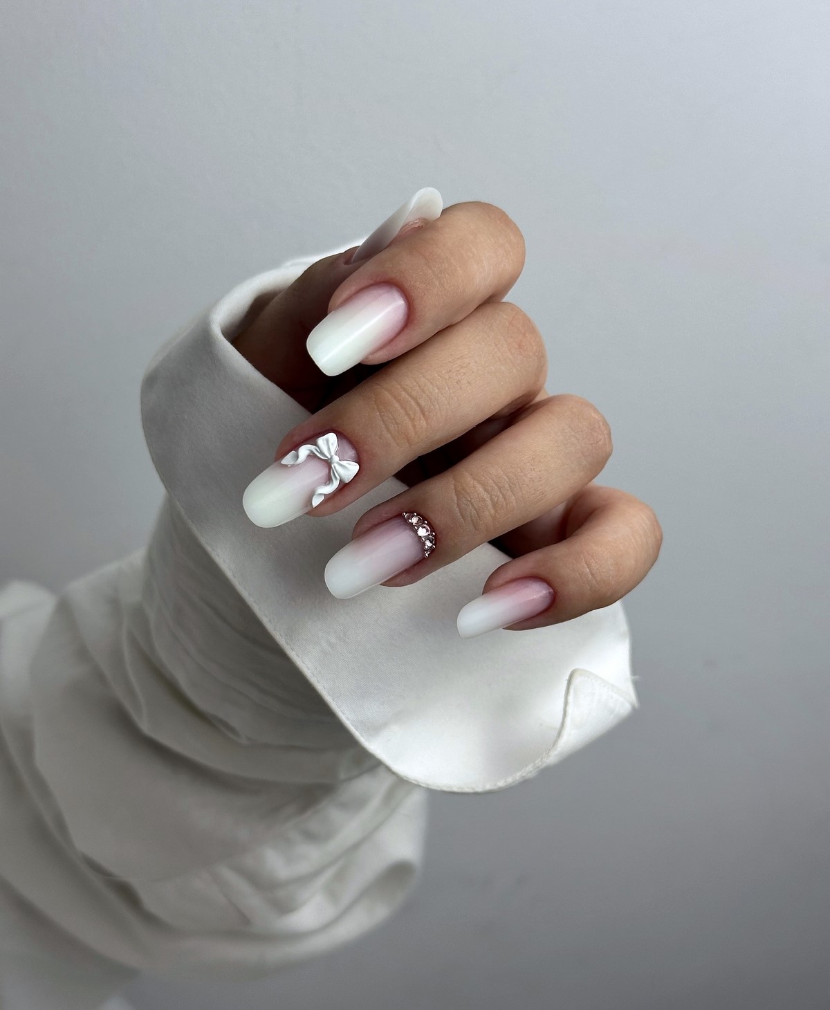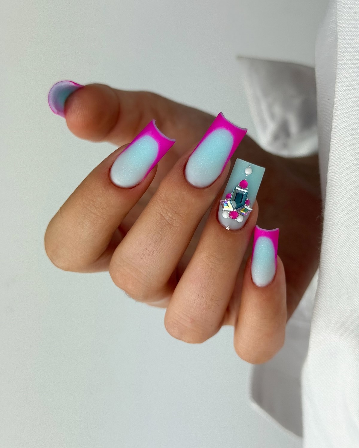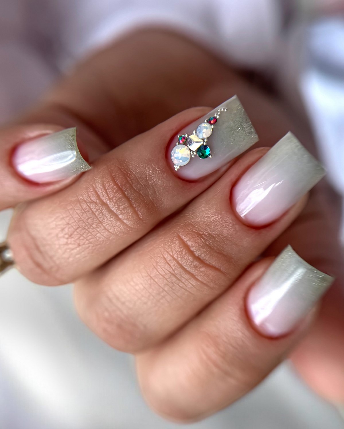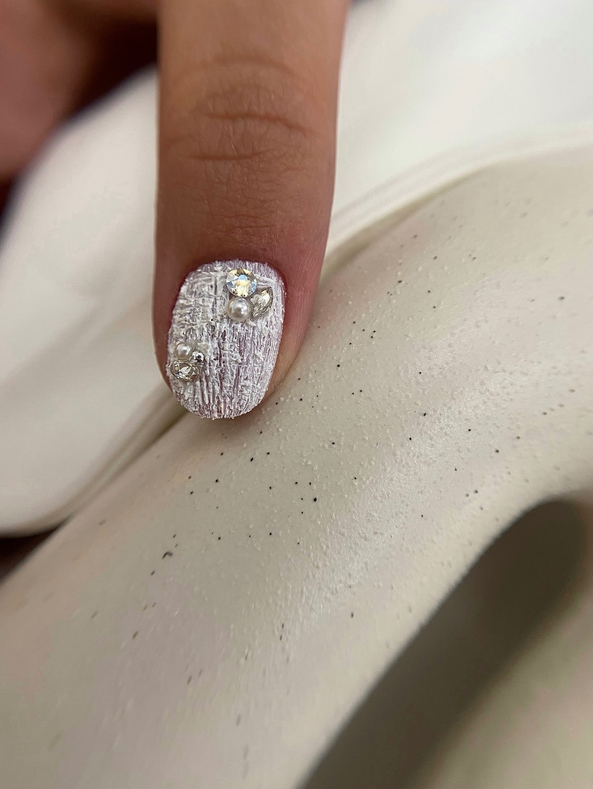 Монохромный подход с использованием крупных страз того же оттенка, что и основное покрытие, создает элегантный тон-в-тон эффект. Такой дизайн выглядит дорого и изысканно. Крупные элементы становятся центральным акцентом композиции, не перегружая общий вид.
