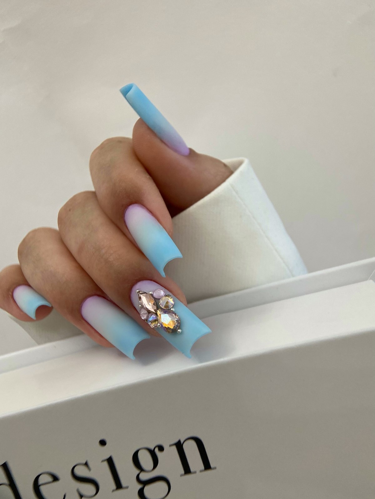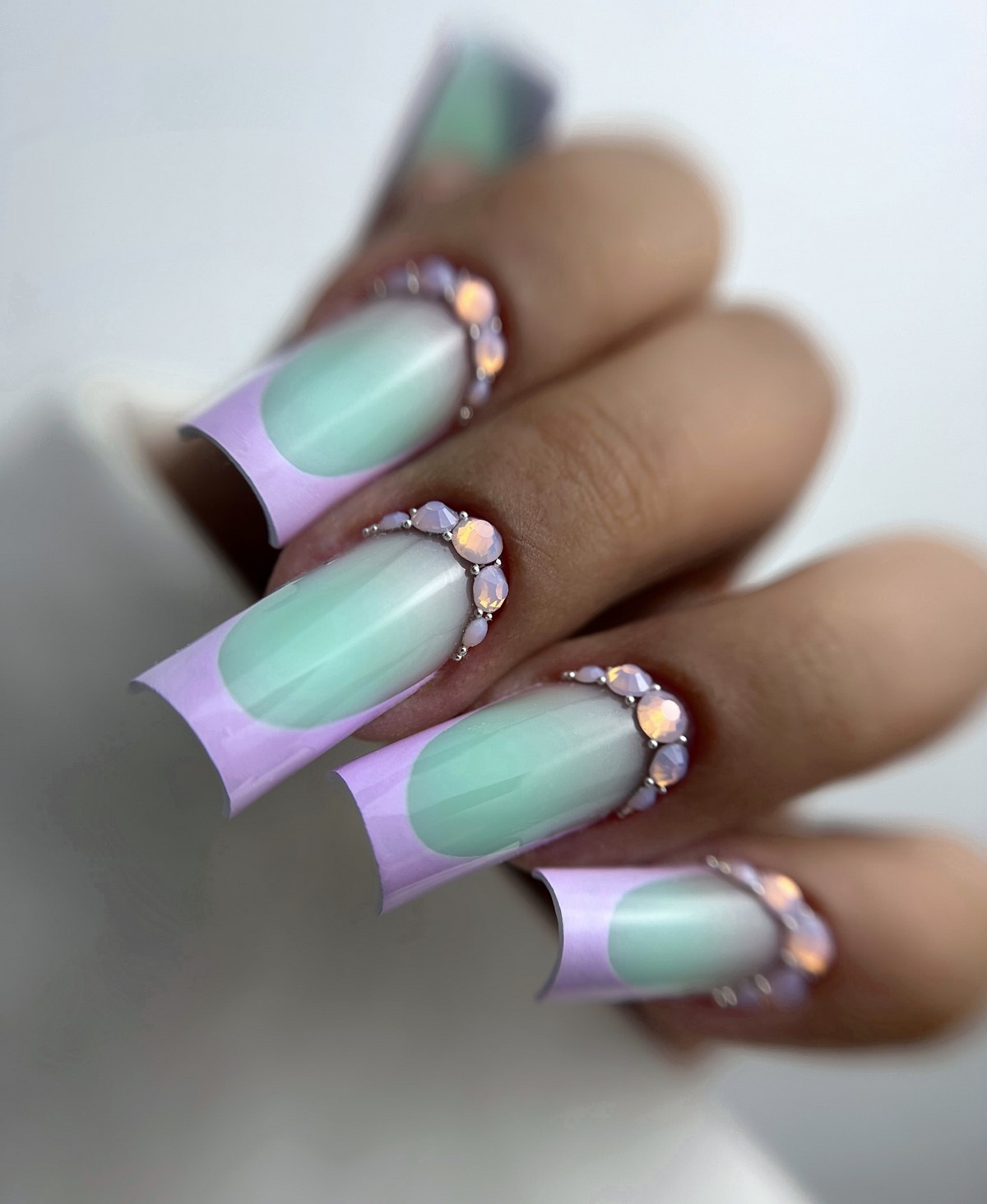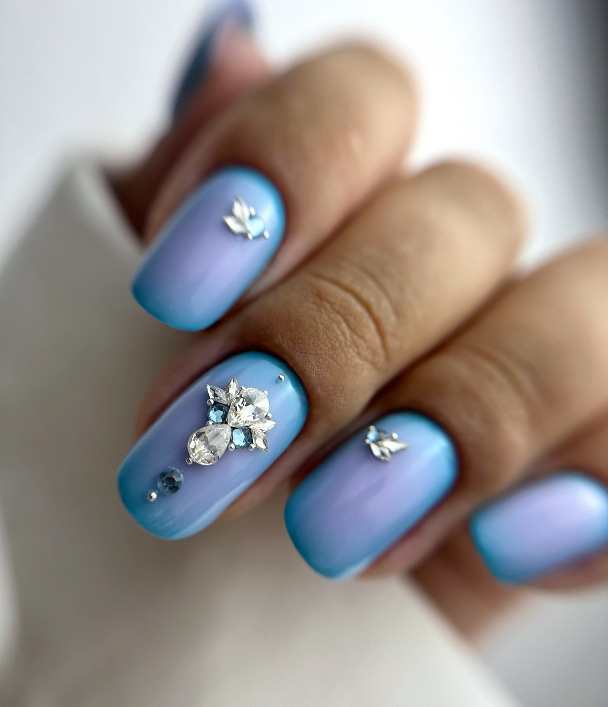 Плавный переход цвета дополненный стразами создает эффект звездного неба или россыпи драгоценных камней. Градиент может быть выполнен в любой цветовой гамме. Стразы подчеркивают переходы оттенков и добавляют дизайну глубины.