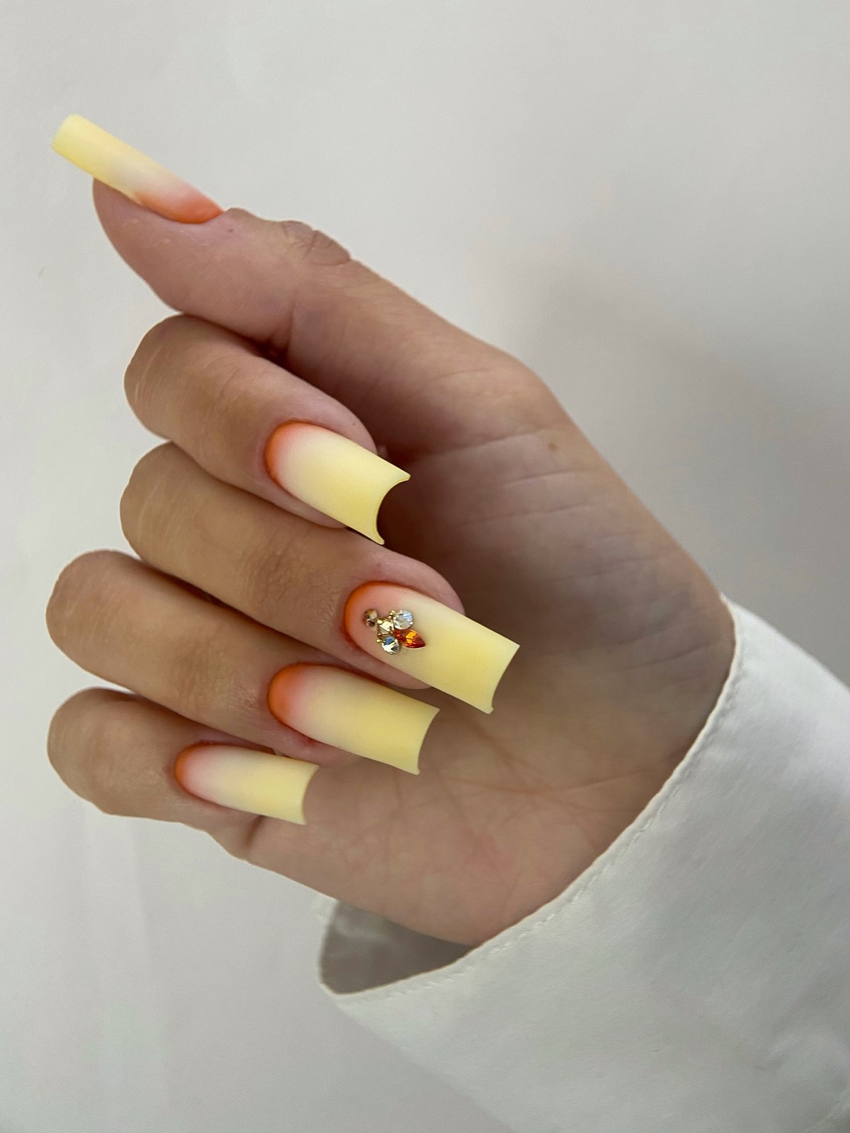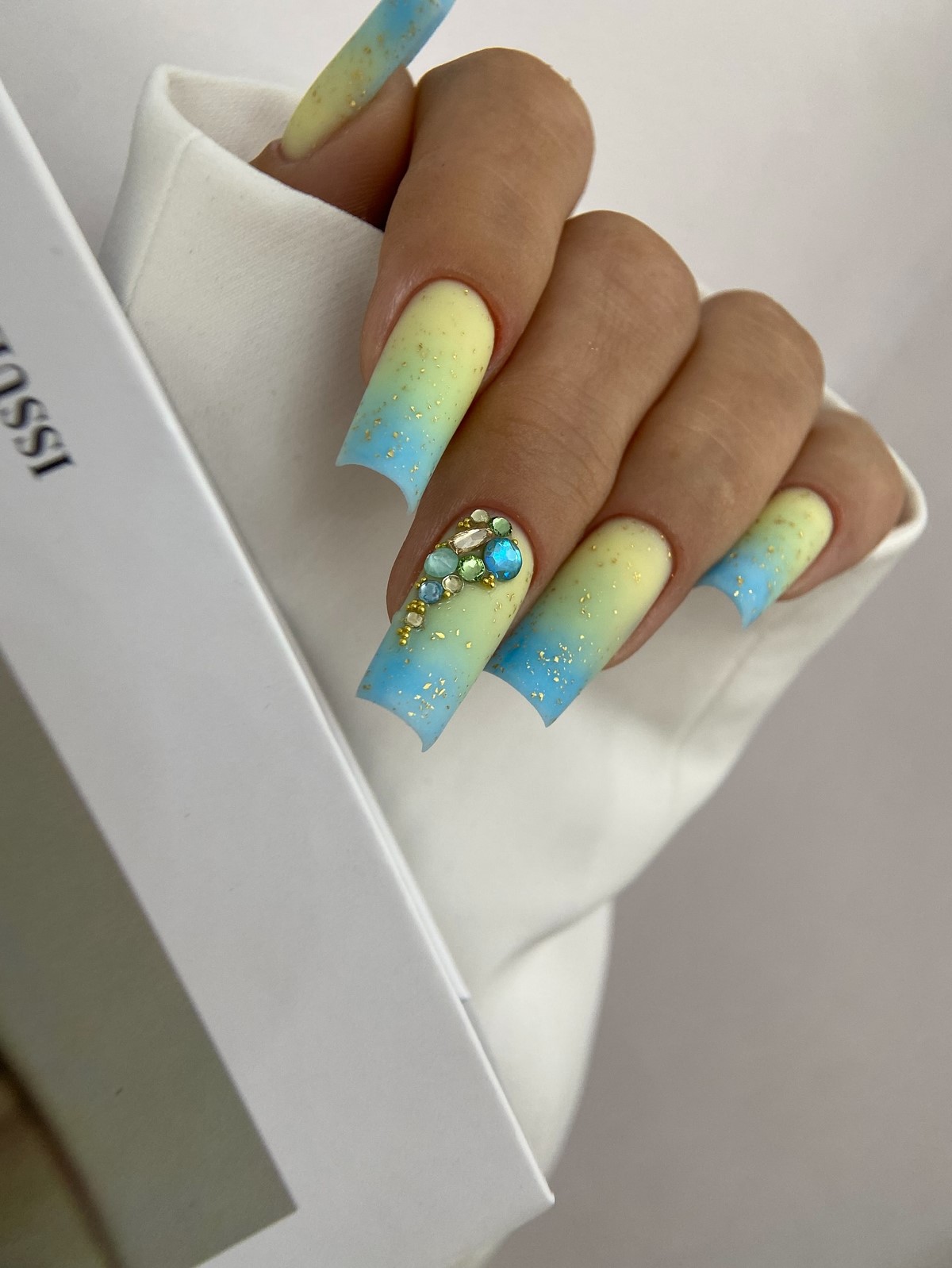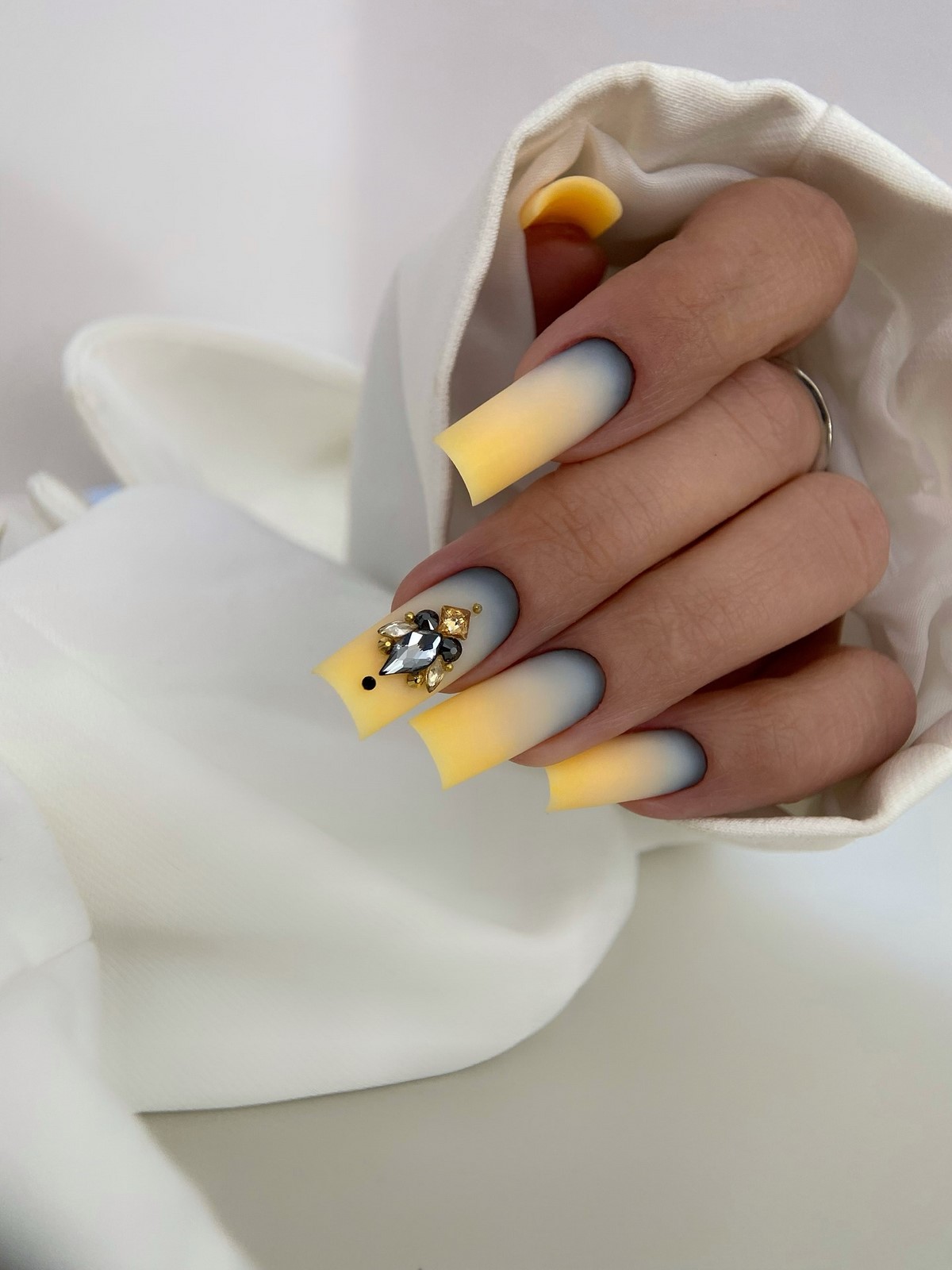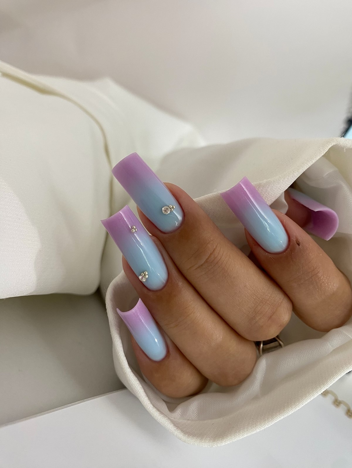 Плавный переход цвета дополненный стразами создает эффект звездного неба или россыпи драгоценных камней. Градиент может быть выполнен в любой цветовой гамме. Стразы подчеркивают переходы оттенков и добавляют дизайну глубины.