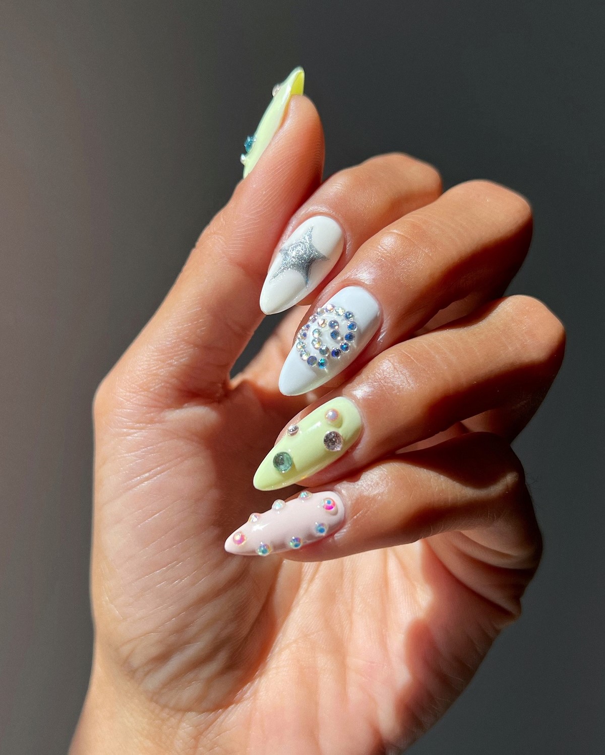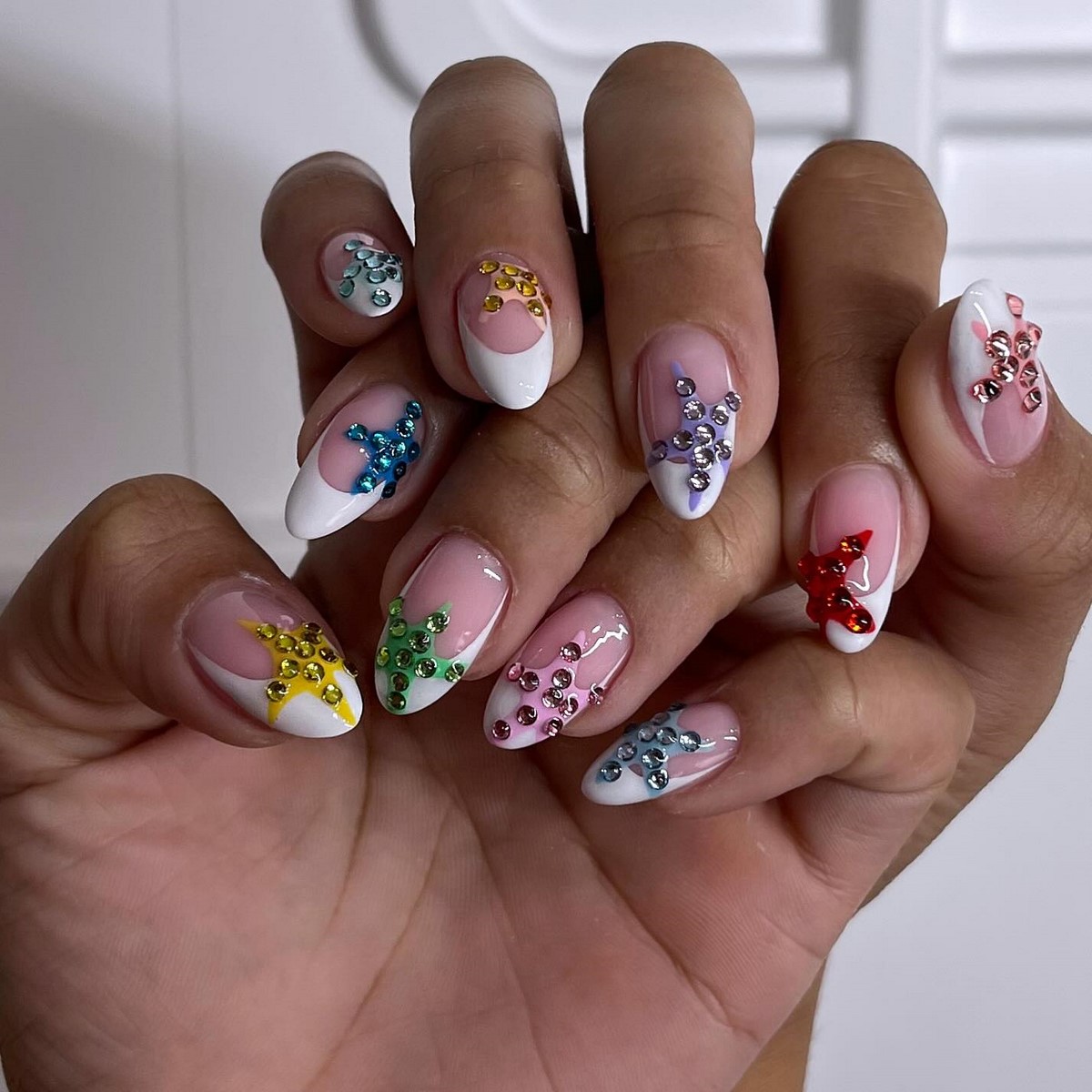 Яркий и игривый тренд, который позволяет экспериментировать с цветовыми сочетаниями. Разноцветные стразы создают радужный эффект и привлекают внимание. Этот дизайн особенно популярен среди молодежи и любительниц смелых решений в стиле.