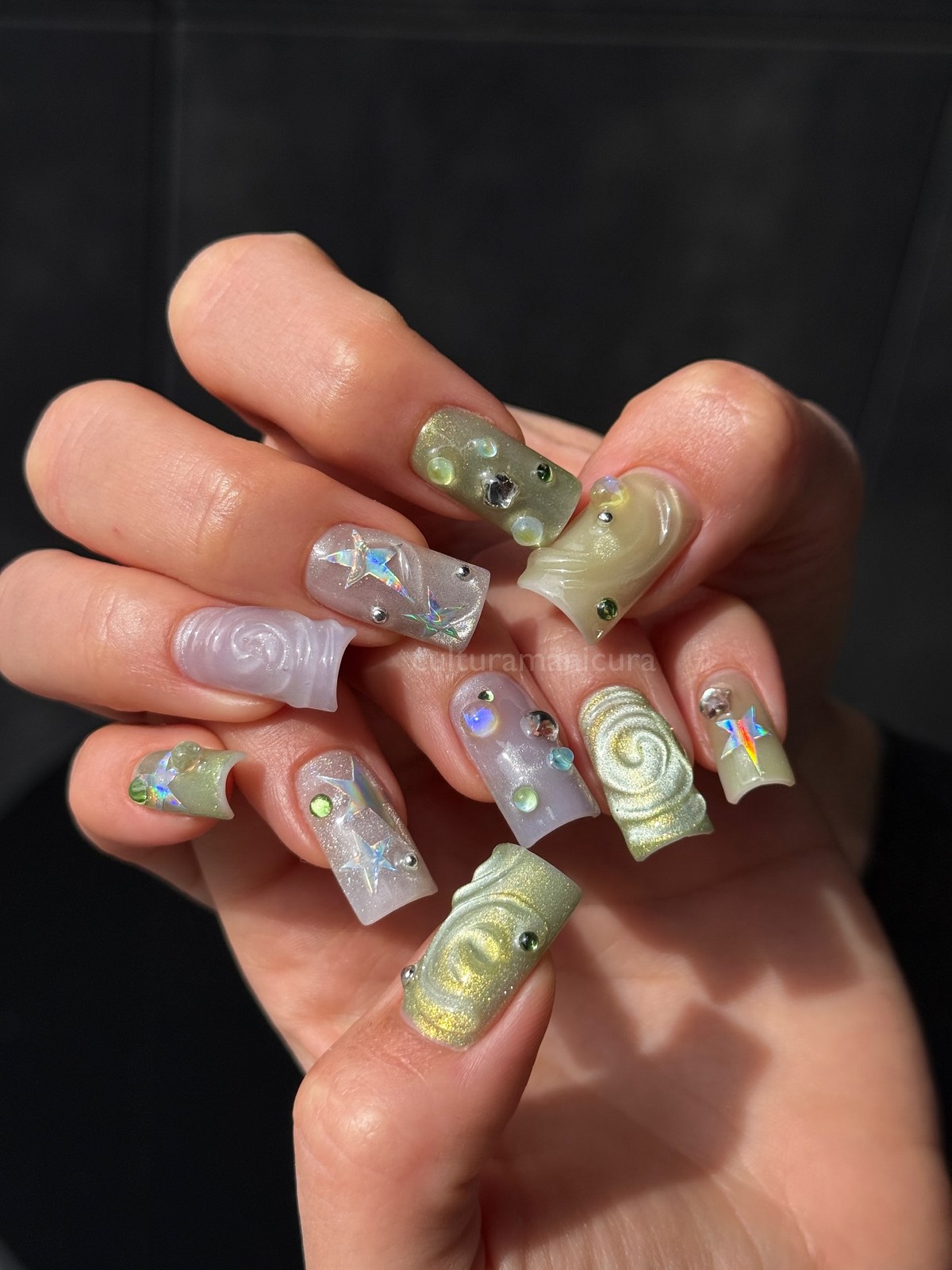 Комбинирование текстурных покрытий со стразами создает многослойный и интересный дизайн. Мраморные разводы или кварцевые вкрапления служат фоном для драгоценных элементов. Такой маникюр выглядит по-настоящему эксклюзивно и художественно.