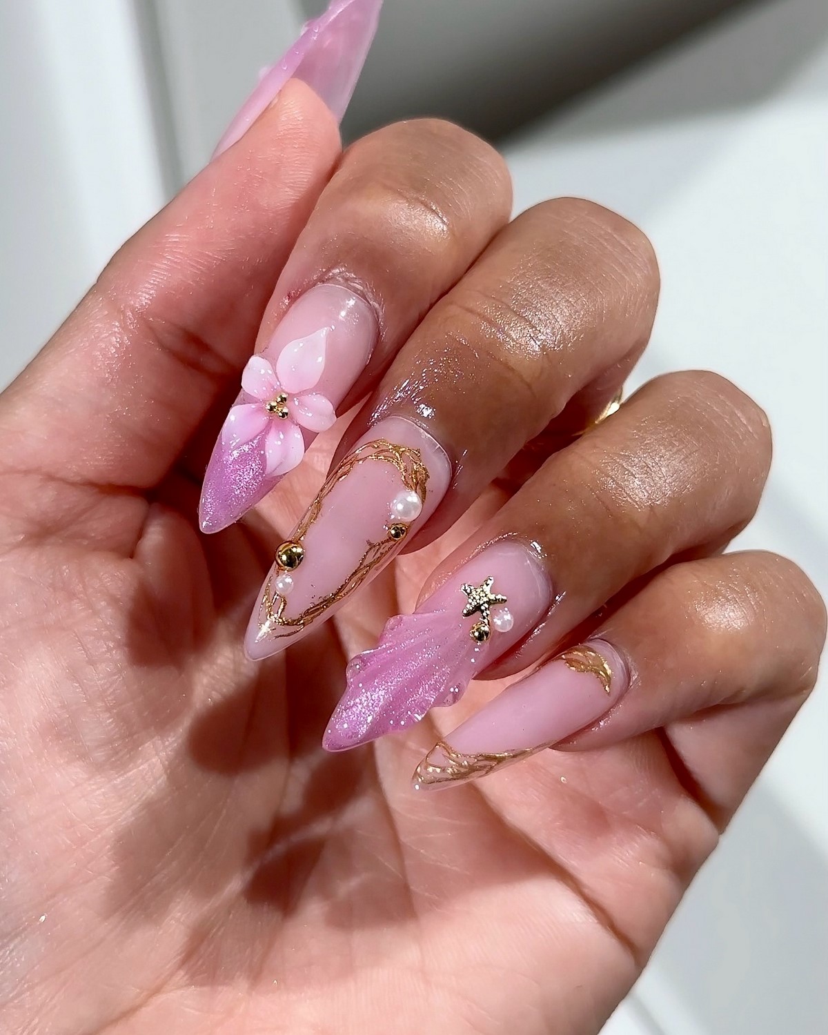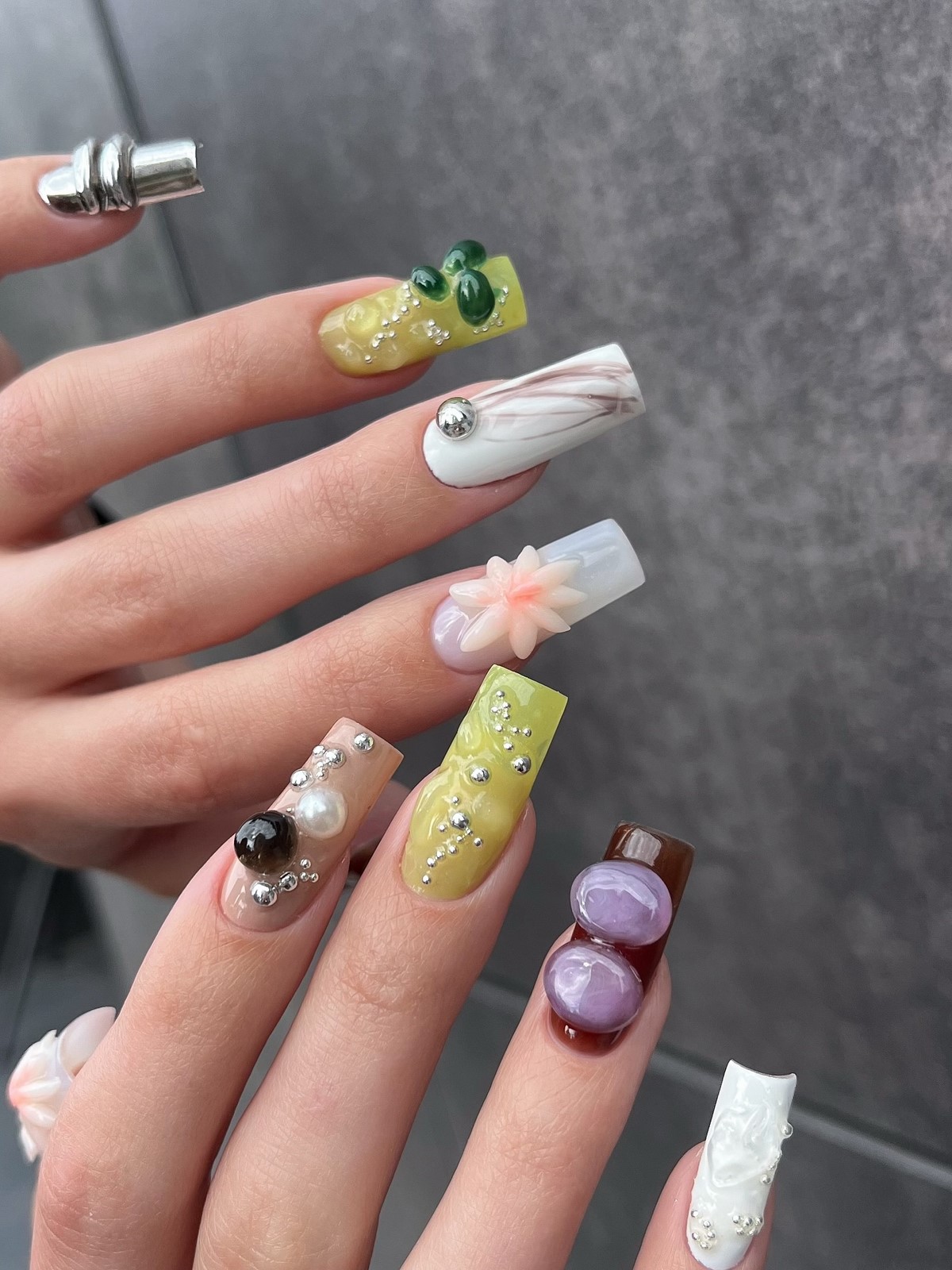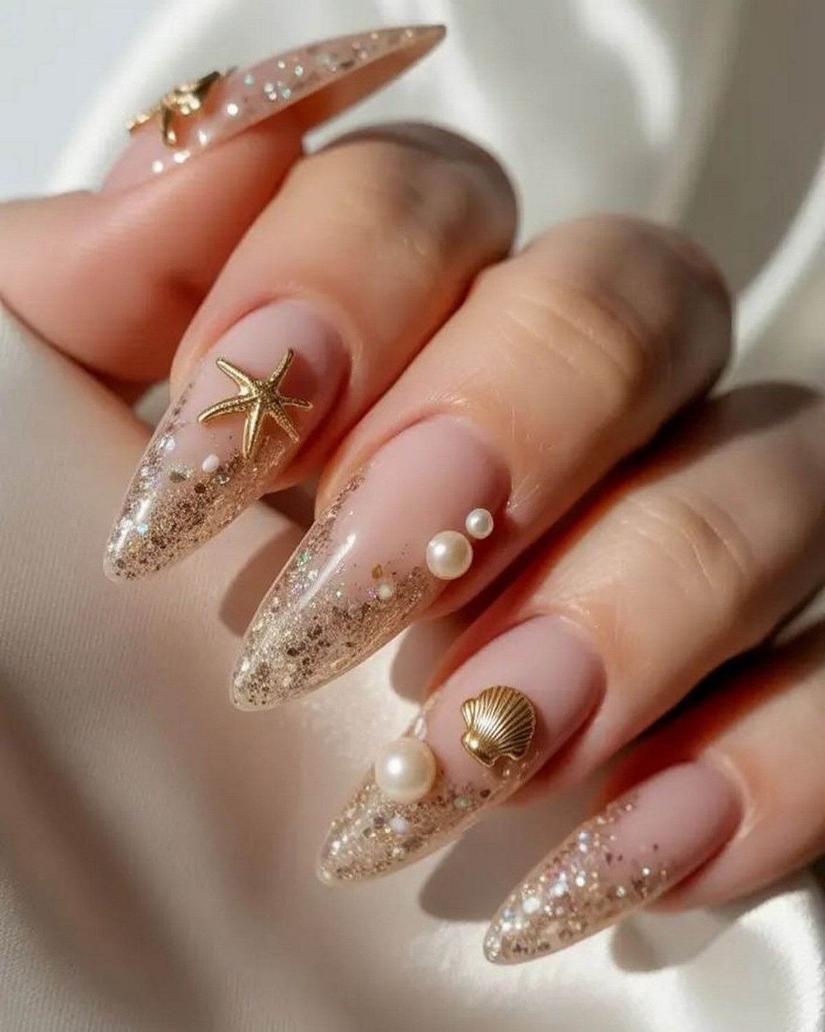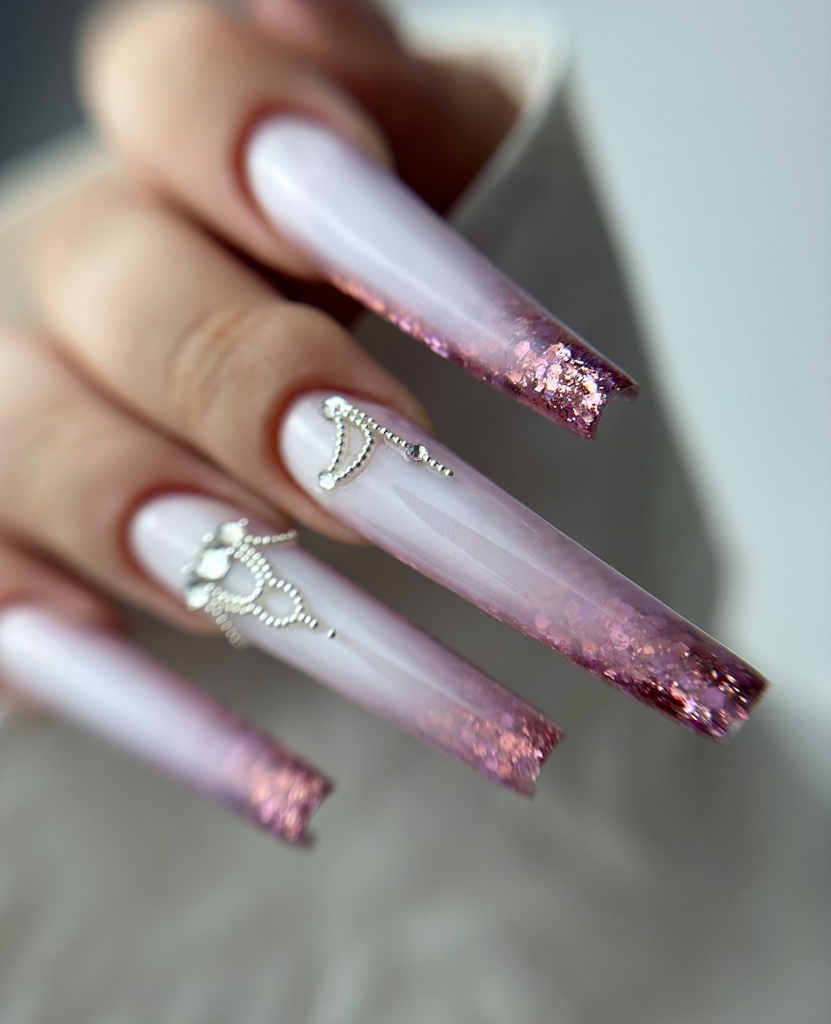 Виды декора. В тренде — разноразмерные стразы, миниатюрные бусины, крошечные и крупные жемчужины, кристаллы в форме капель, звезд, сердец. Также популярны металлические элементы и микс декора (стразы + пайетки).