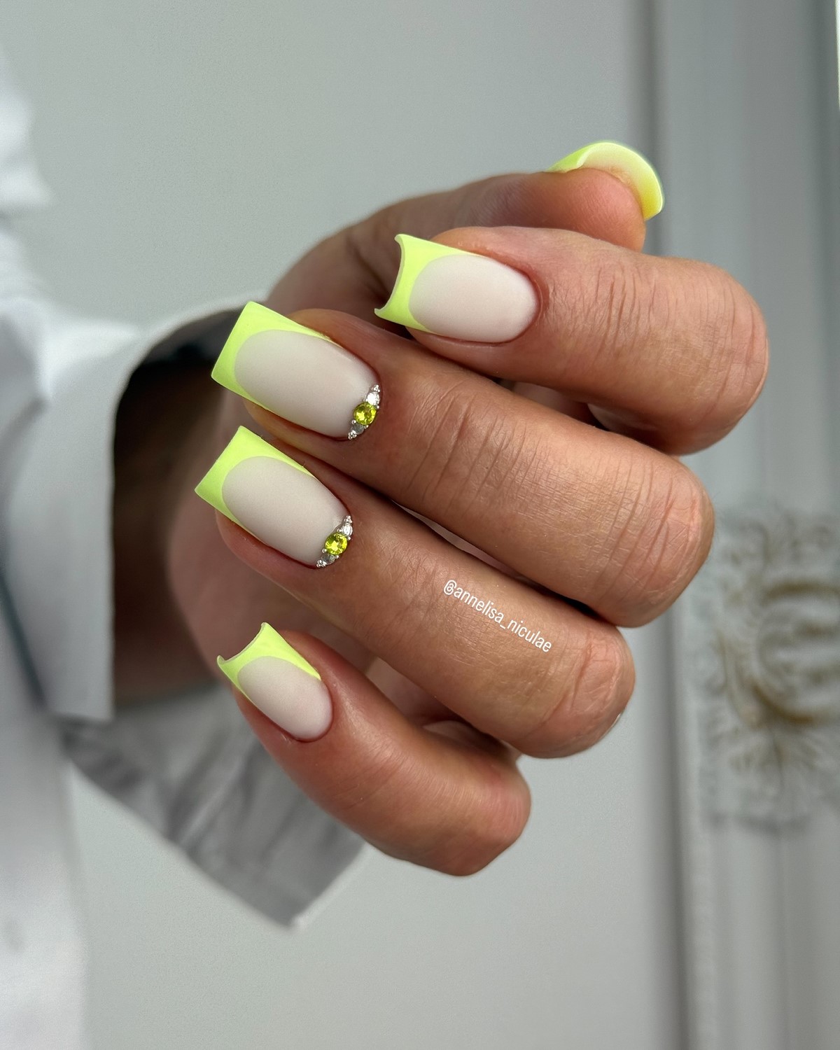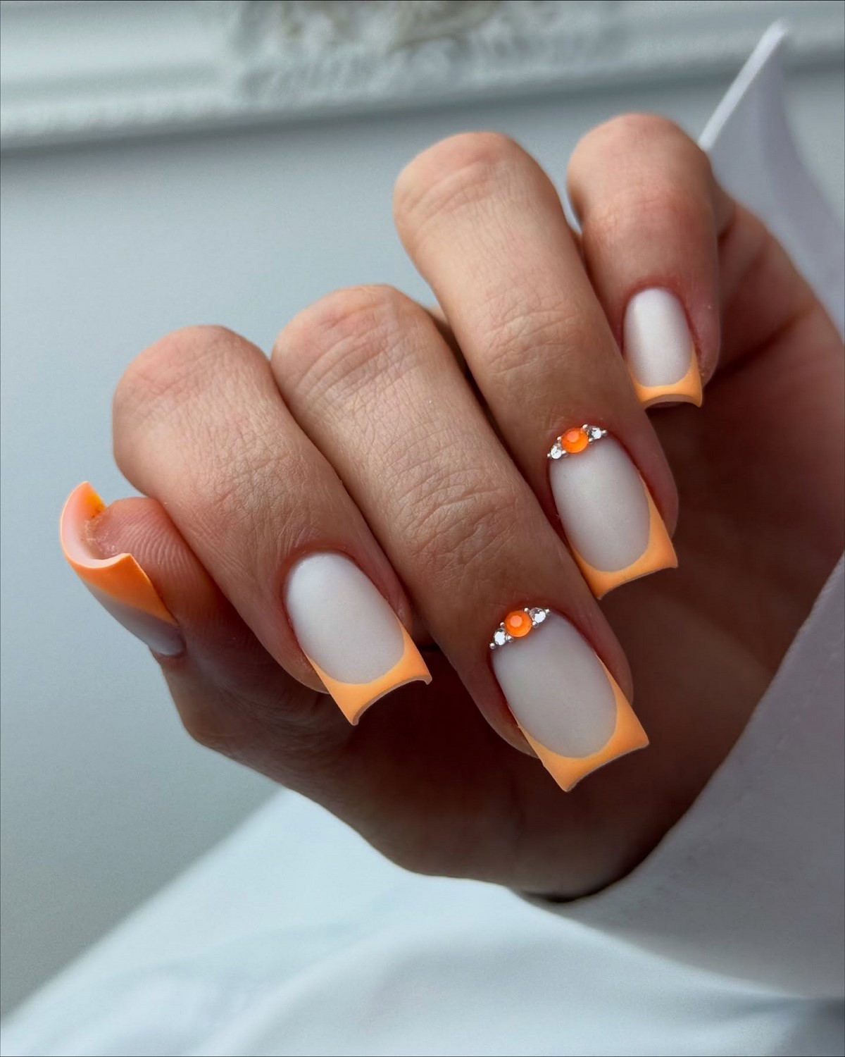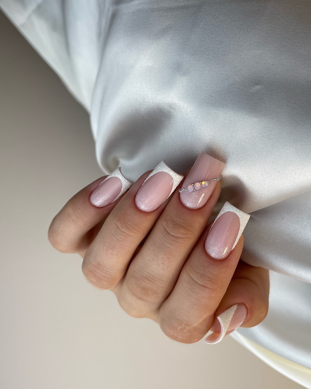 Классический французский маникюр получает современное прочтение благодаря добавлению страз на линию улыбки или у основания ногтя. Белый кончик может быть дополнен серебристыми или прозрачными кристаллами. Это элегантное сочетание традиций и современных тенденций.