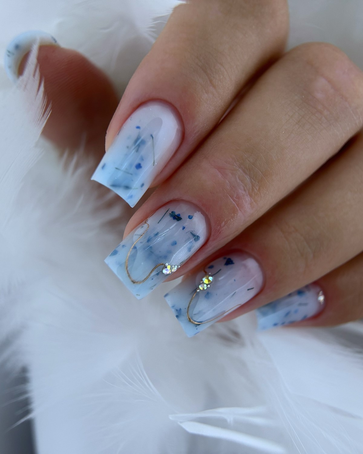 Прозрачное или полупрозрачное покрытие с вкраплениями страз создает эффект желе с драгоценными камнями внутри. Такой дизайн выглядит очень нежно и романтично. Стразы словно парят внутри покрытия, создавая объемный трехмерный эффект.