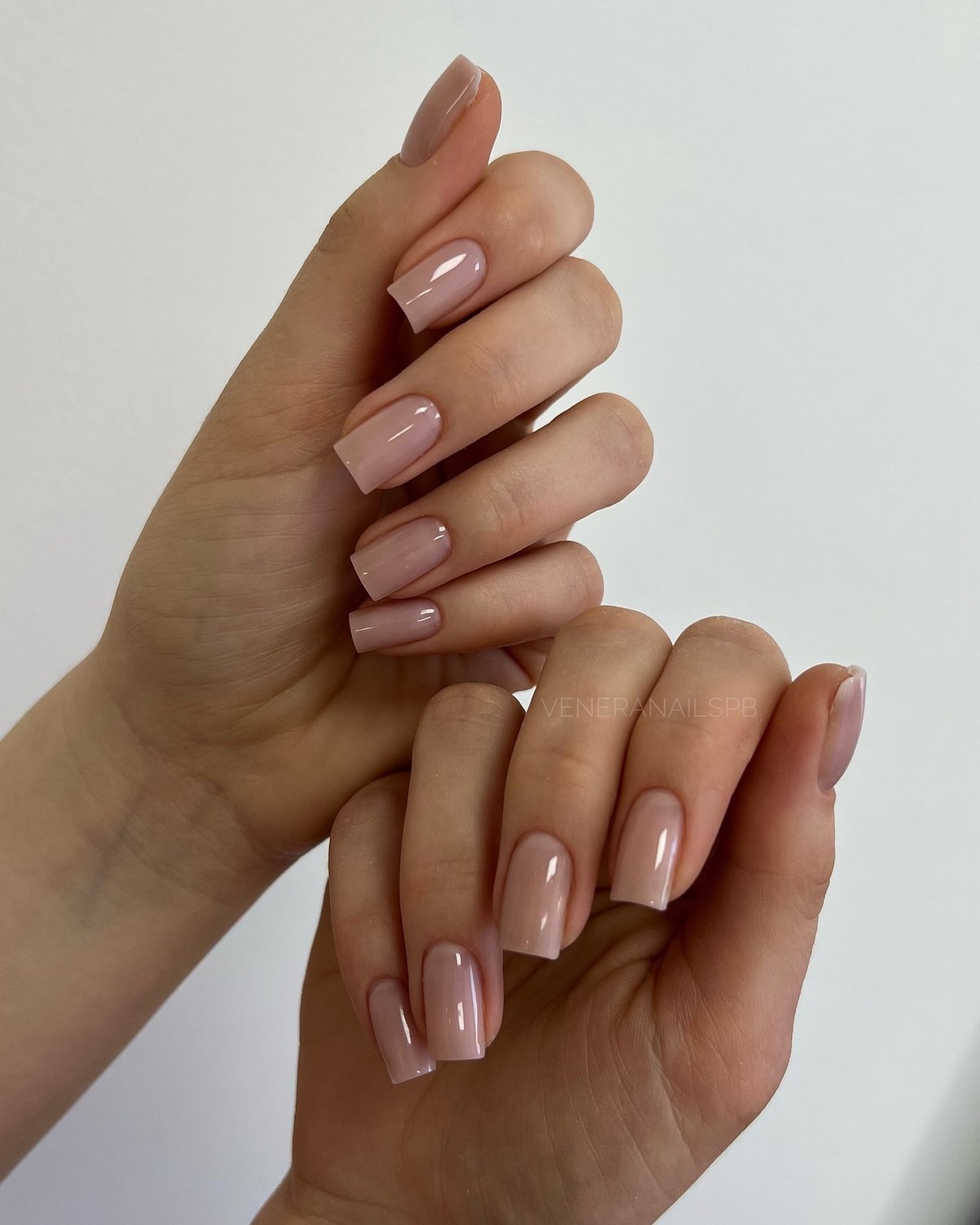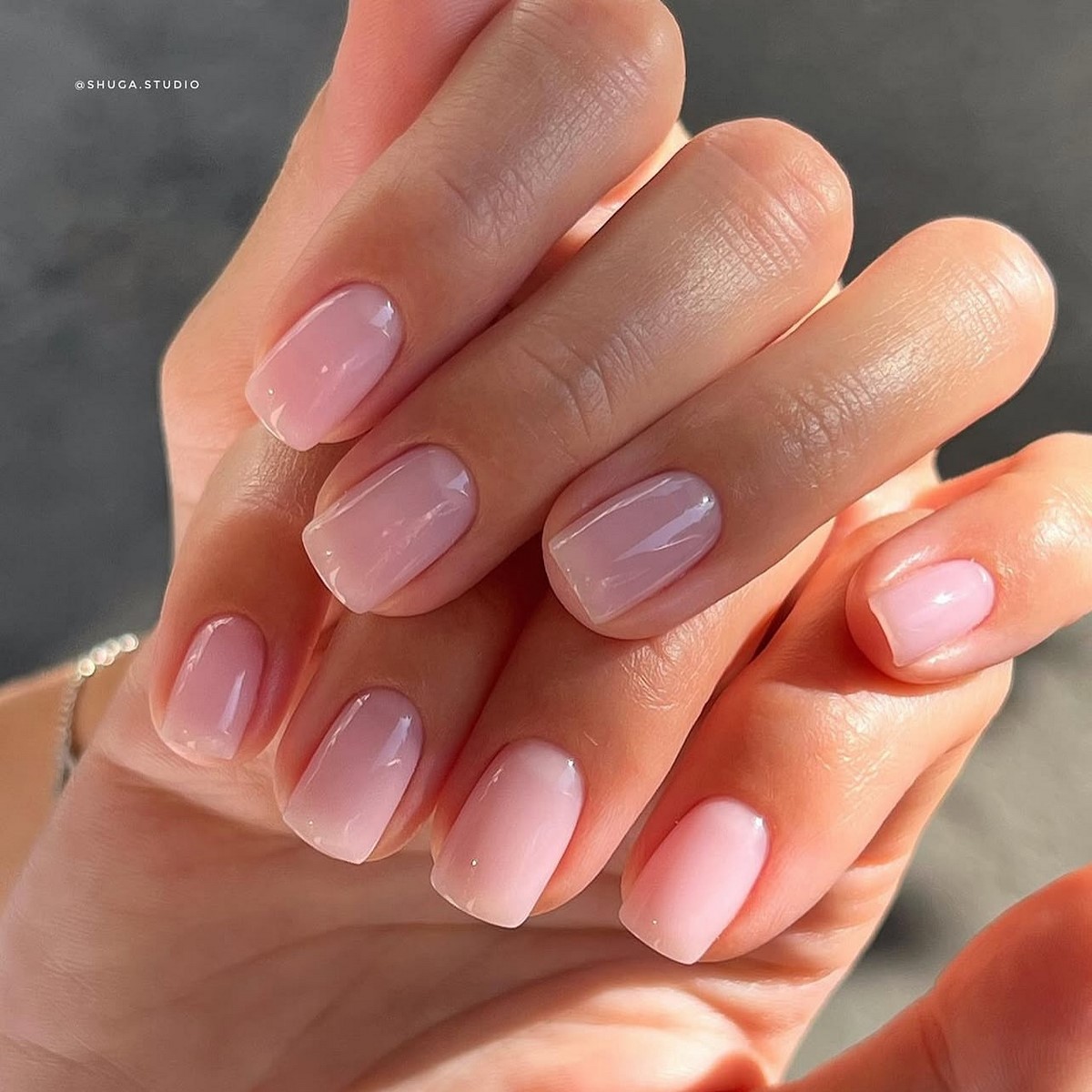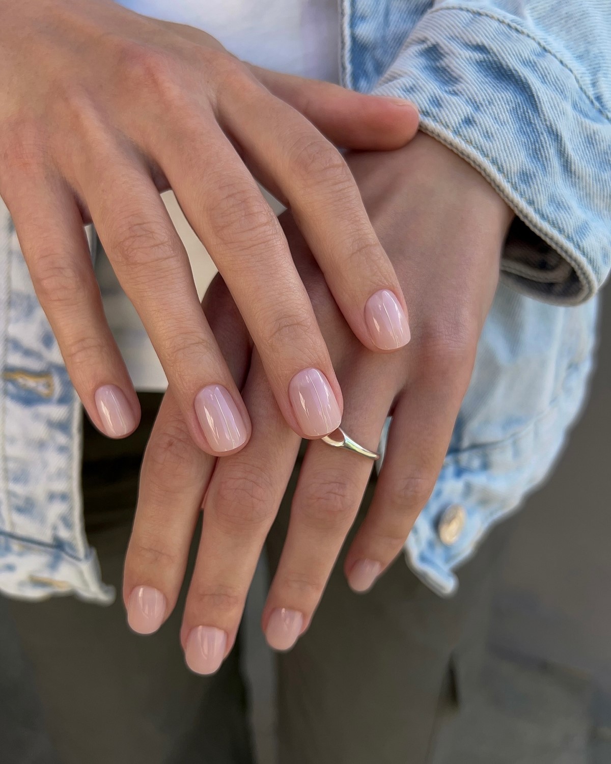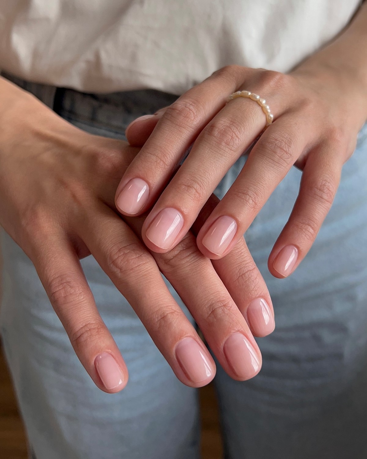 Это самая сдержанная и естественная версия стеклянных ногтей. Полупрозрачный нюд, нанесённый в один слой, подчёркивает природную текстуру ногтя. Глянец придаёт ногтям эффект свежести и увлажнённости. Такой дизайн популярен среди тех, кто не любит броский нейл-арт. Он идеально сочетается с любым гардеробом.