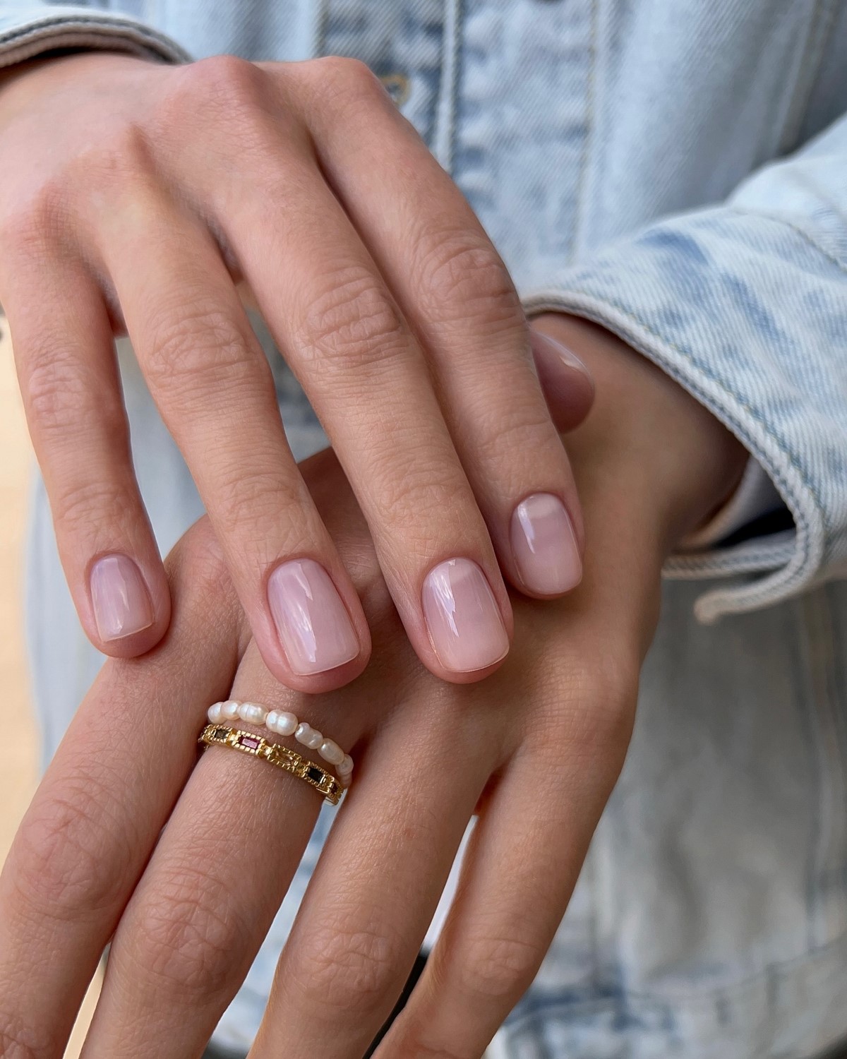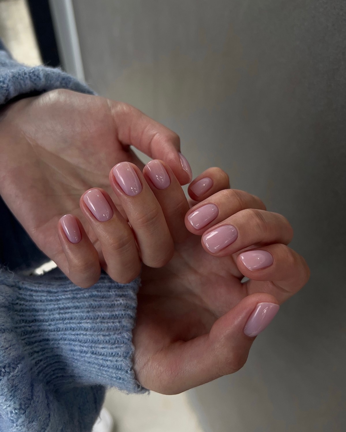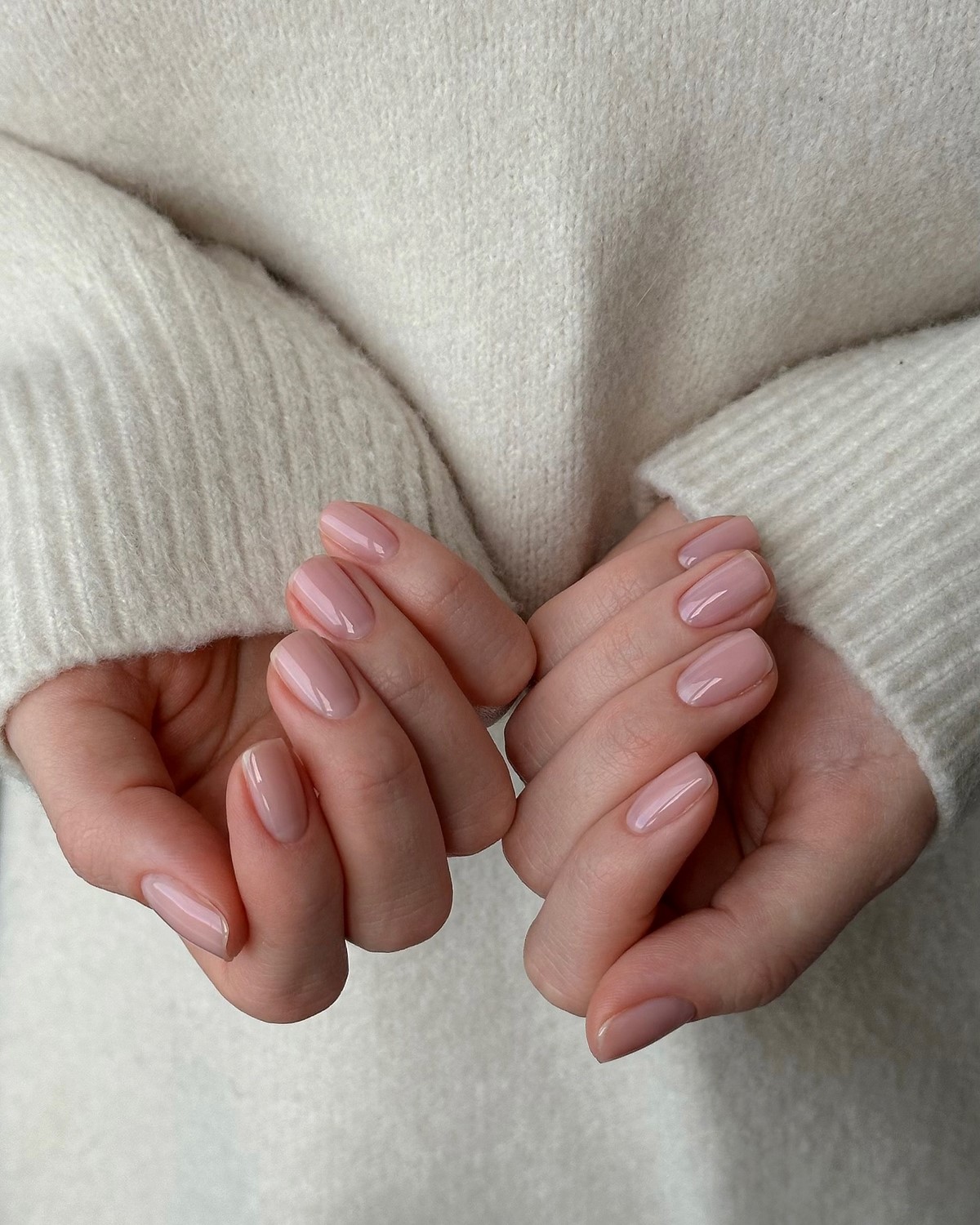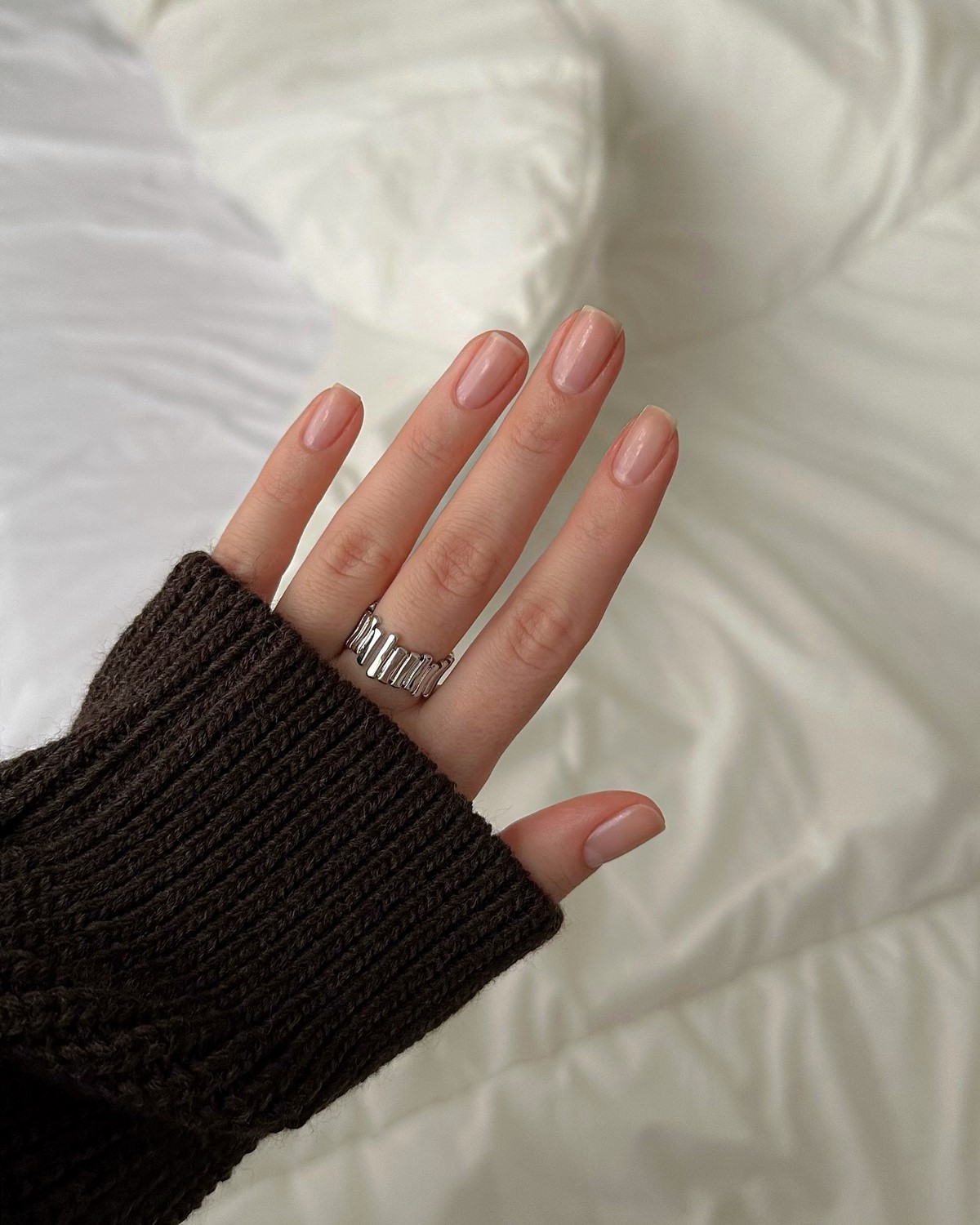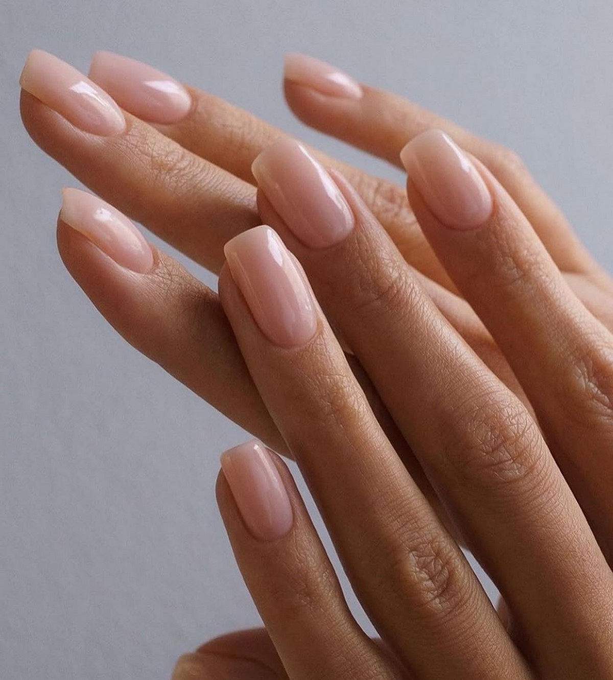 Это самая сдержанная и естественная версия стеклянных ногтей. Полупрозрачный нюд, нанесённый в один слой, подчёркивает природную текстуру ногтя. Глянец придаёт ногтям эффект свежести и увлажнённости. Такой дизайн популярен среди тех, кто не любит броский нейл-арт. Он идеально сочетается с любым гардеробом.