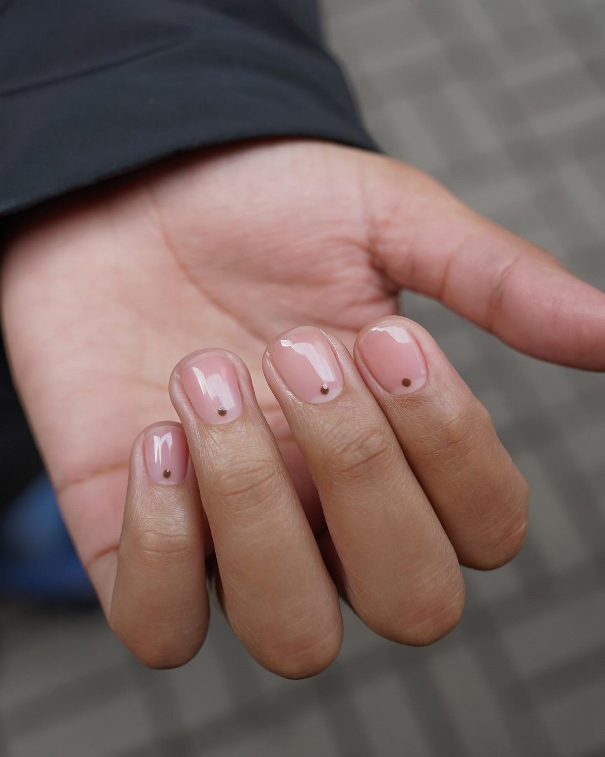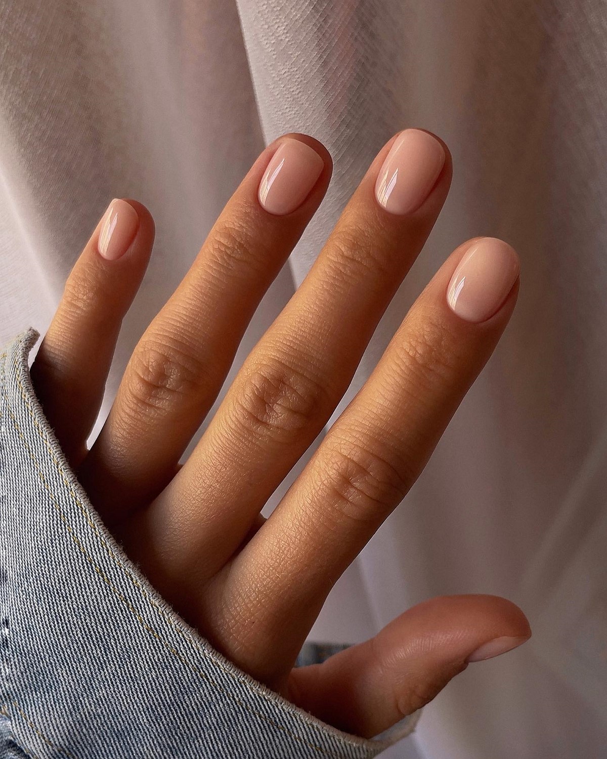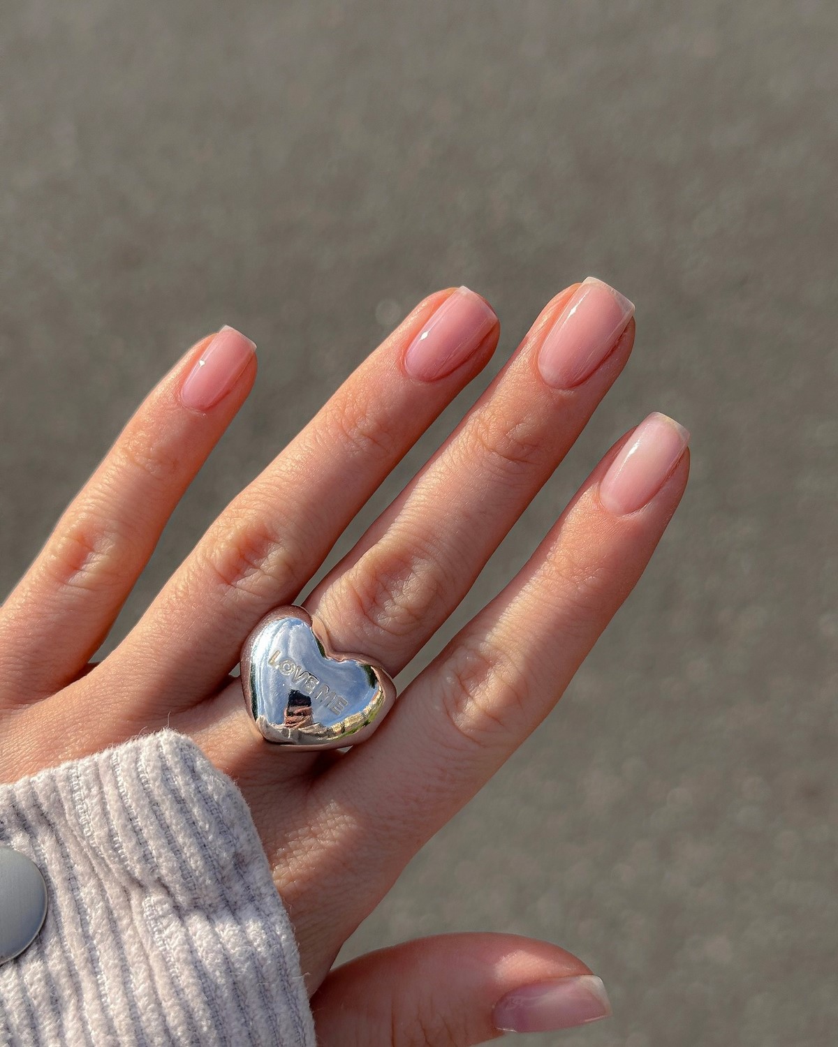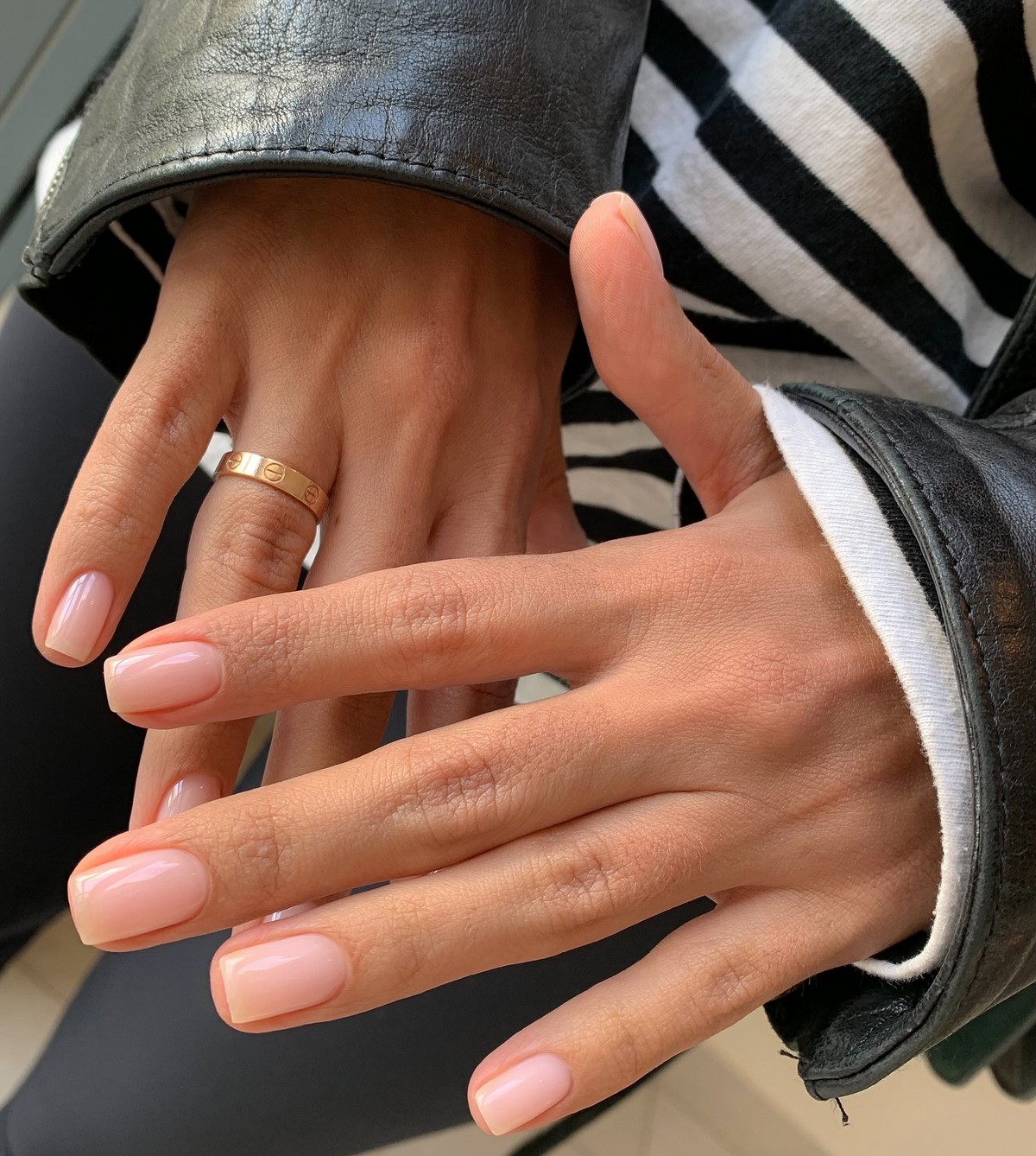 Это самая сдержанная и естественная версия стеклянных ногтей. Полупрозрачный нюд, нанесённый в один слой, подчёркивает природную текстуру ногтя. Глянец придаёт ногтям эффект свежести и увлажнённости. Такой дизайн популярен среди тех, кто не любит броский нейл-арт. Он идеально сочетается с любым гардеробом.
