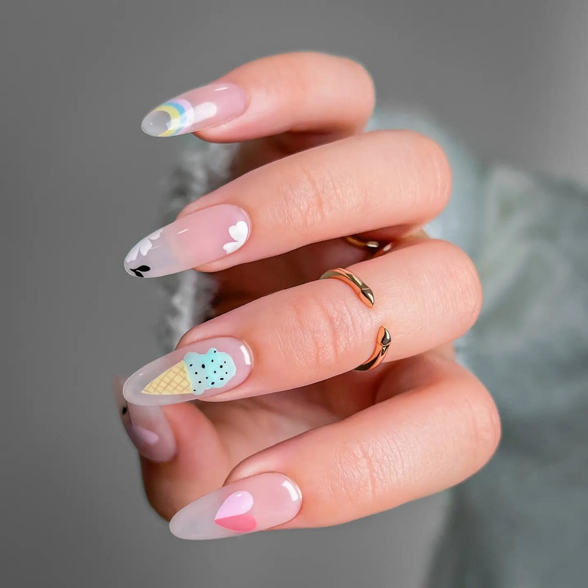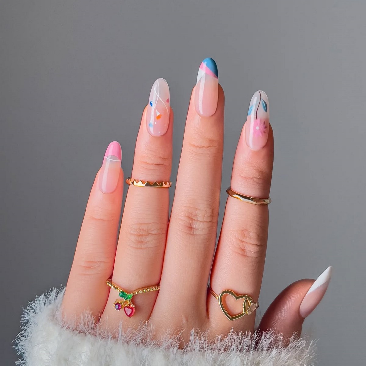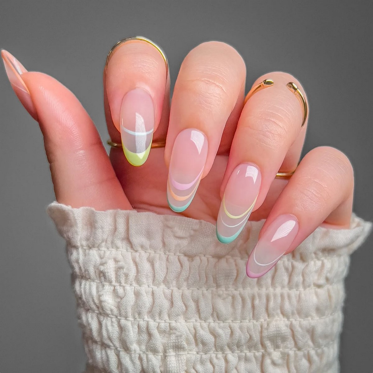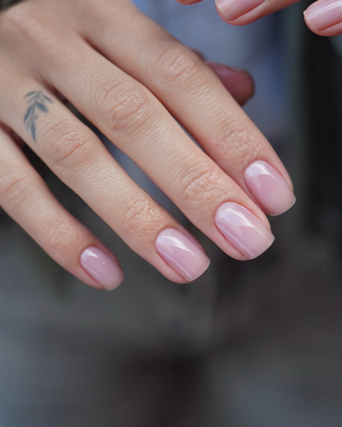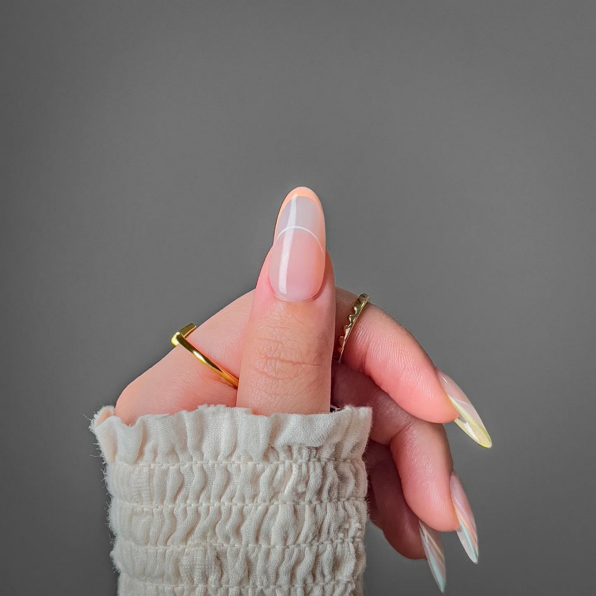 Каждый ноготь может быть выполнен в слегка отличающемся оттенке: бежевый, розовый, персиковый, молочный. Это создаёт пастельную гамму, актуальную летом. Главное — сохранить эффект прозрачности и глянца. Такой маникюр придаёт игривость и ощущение эксперимента, но остаётся в рамках минимализма. Хорошо смотрится на короткой или средней длине.