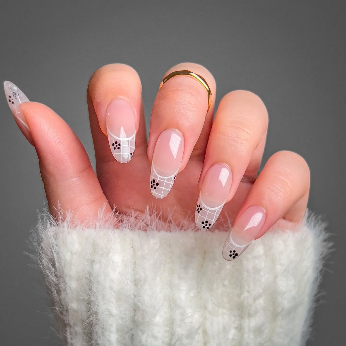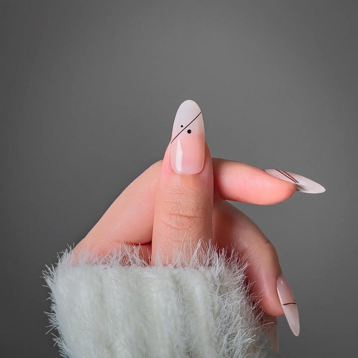 Прозрачная основа становится идеальным фоном для тонких линий, пересечений и простых фигур. Геометрические элементы обычно выполняются в белом или серебристом цвете. Такой дизайн особенно хорошо смотрится в минималистичной палитре. Он подходит для креативных образов и хорошо сочетается с украшениями. Выглядит современно и сдержанно.