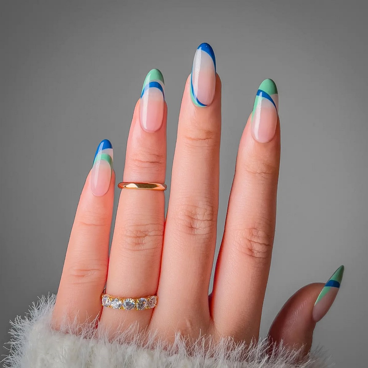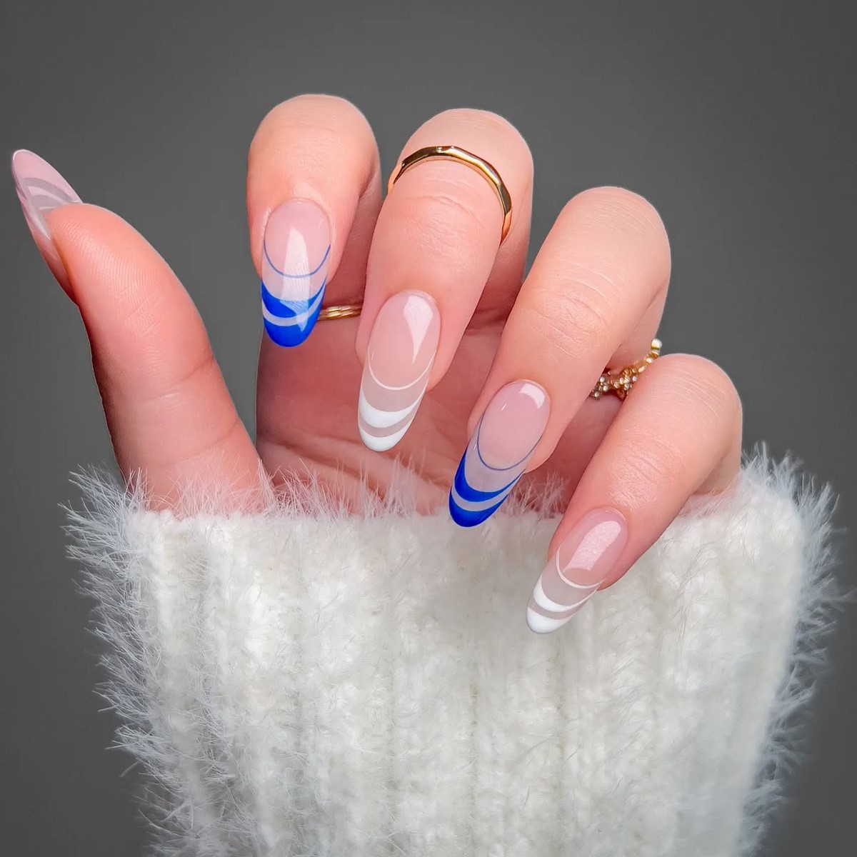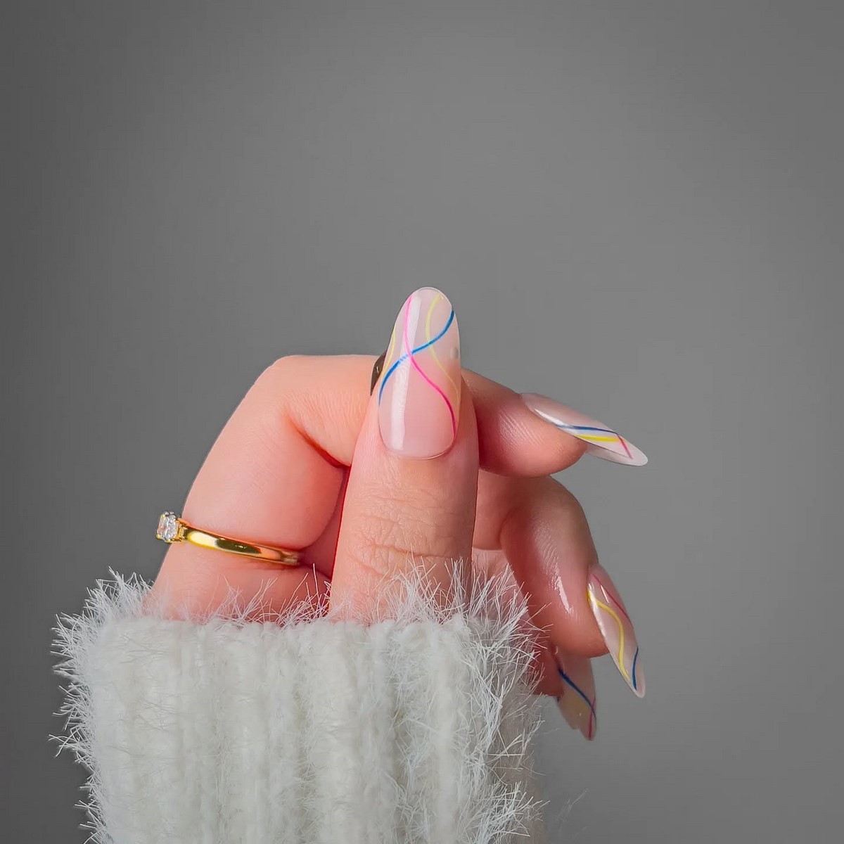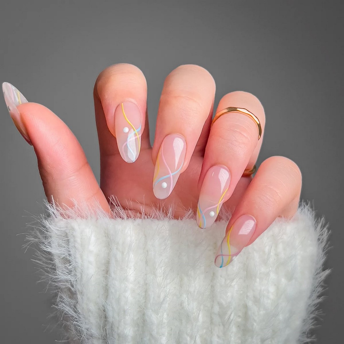 Плавные изгибы, имитирующие воду или ветер, добавляют динамики прозрачному покрытию. Они выполняются в технике air brush, гелем или тонкой кистью. Часто используют перламутровые пигменты или молочный гель. Волны красиво смотрятся на длинных и миндалевидных ногтях. Это дизайн с настроением — лёгким, романтичным, летним.