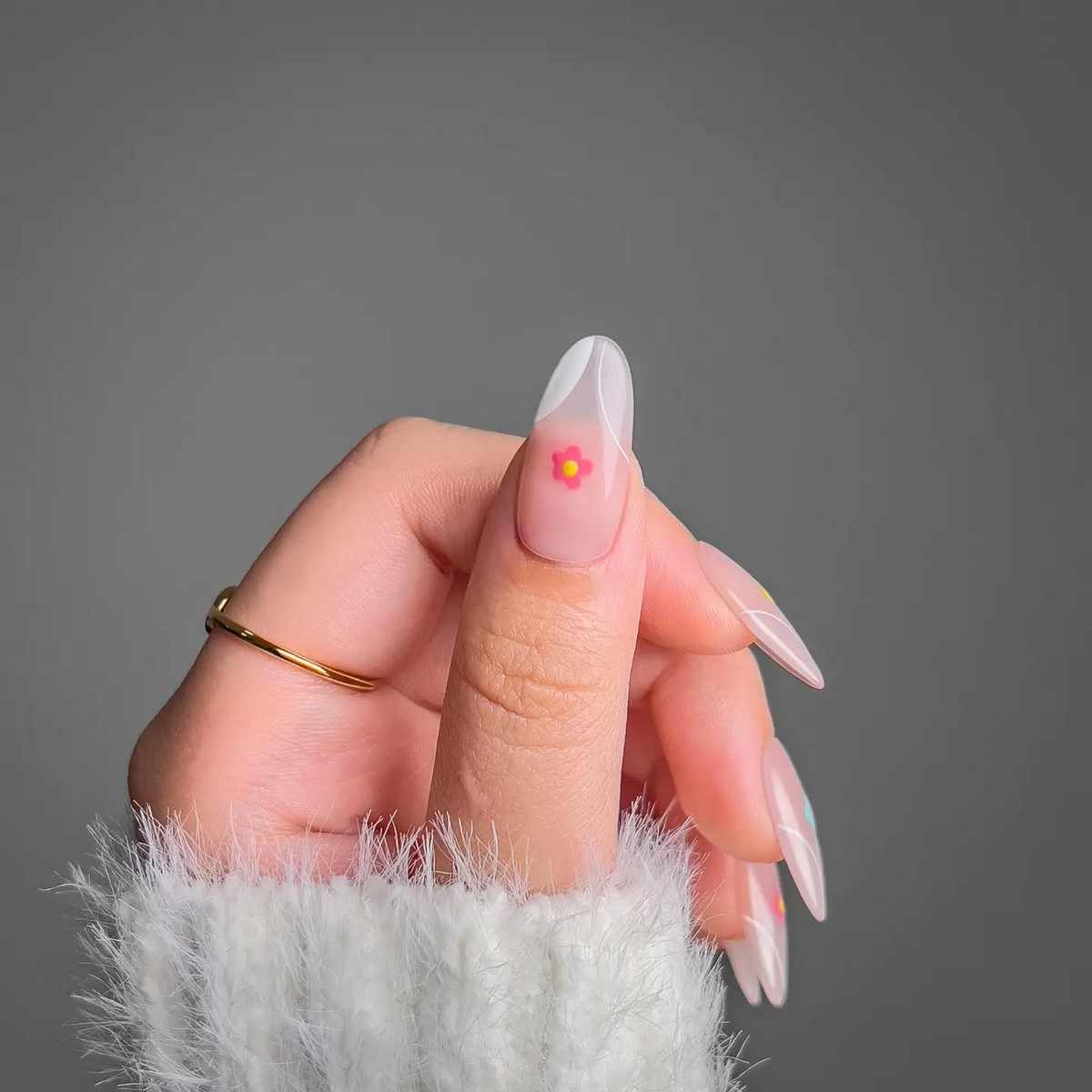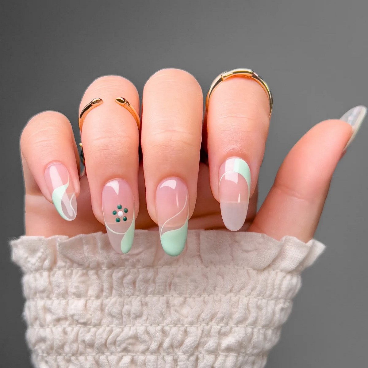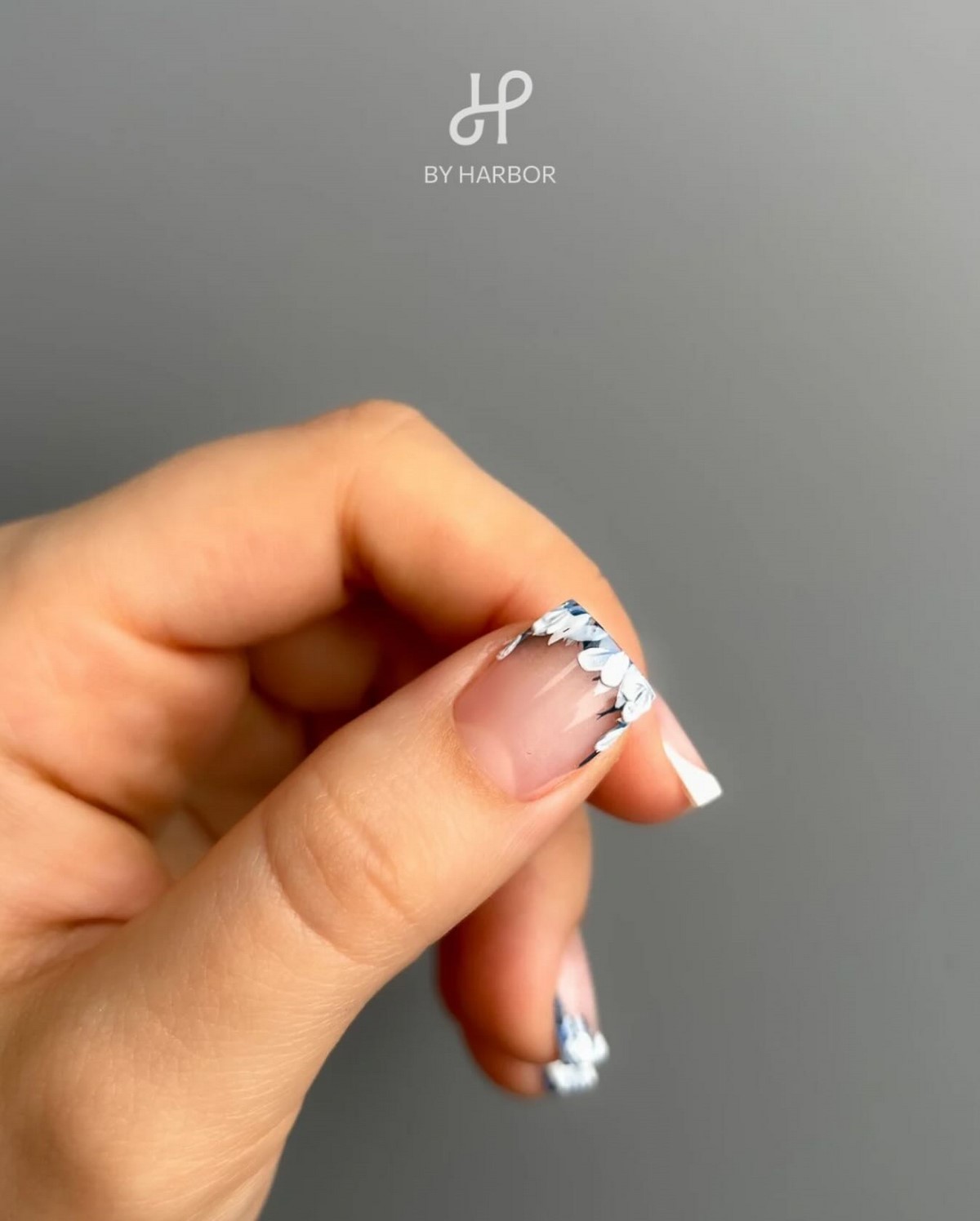 Нежные цветочные мотивы на полупрозрачной базе создают образ, наполненный женственностью. Обычно используются белые или пастельные тона, иногда — сухоцветы или аппликации. Цветы могут быть едва заметны, как акцент на одном-двух ногтях. Такой маникюр уместен и на свадьбе, и на летнем пикнике. Он придаёт образу мягкость и лёгкость.