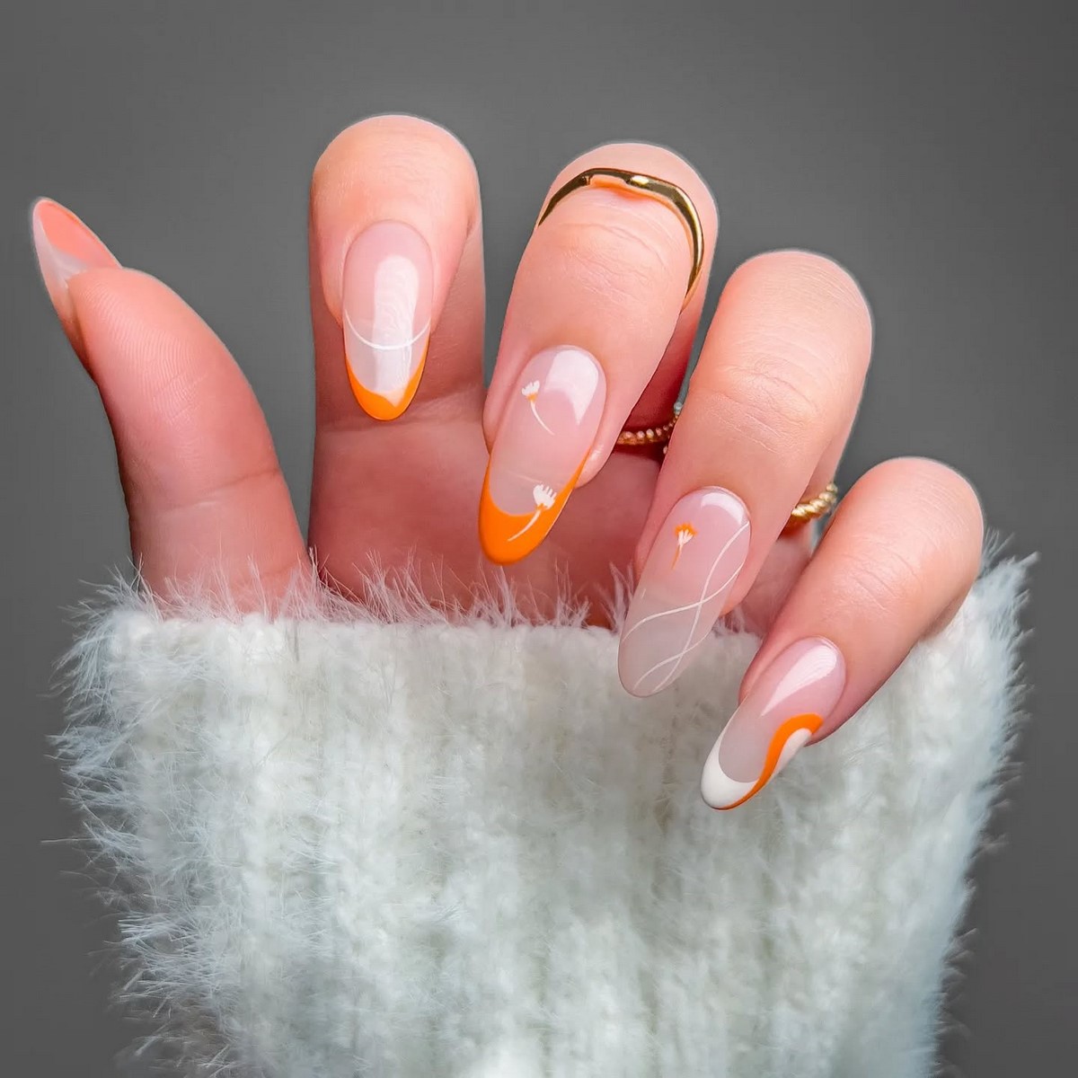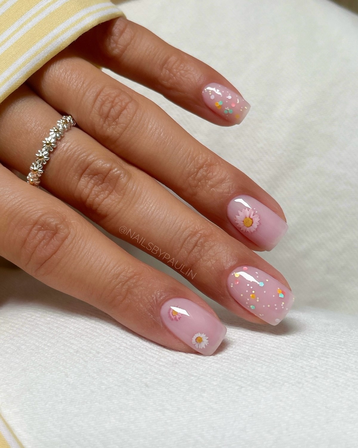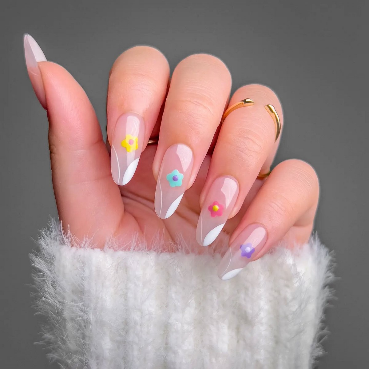 Нежные цветочные мотивы на полупрозрачной базе создают образ, наполненный женственностью. Обычно используются белые или пастельные тона, иногда — сухоцветы или аппликации. Цветы могут быть едва заметны, как акцент на одном-двух ногтях. Такой маникюр уместен и на свадьбе, и на летнем пикнике. Он придаёт образу мягкость и лёгкость.