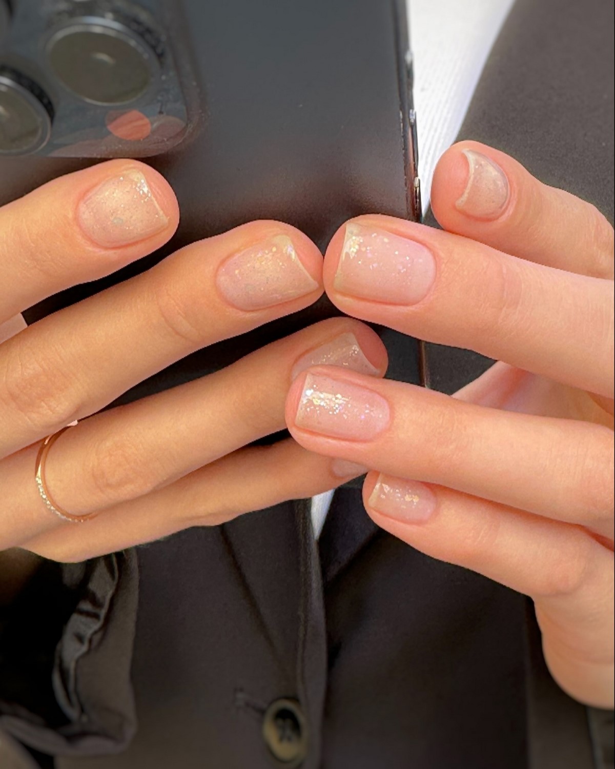 В маникюре со стеклянным эффектом микроблестки придают особую игривость. Обычно их втирают под топ или добавляют в базу в минимальном количестве. Блестки переливаются при свете, но не доминируют — ногти всё ещё выглядят естественно. Это идеальный вариант для вечернего образа. Особенно красиво блестки смотрятся на коротких ногтях с овальной формой.