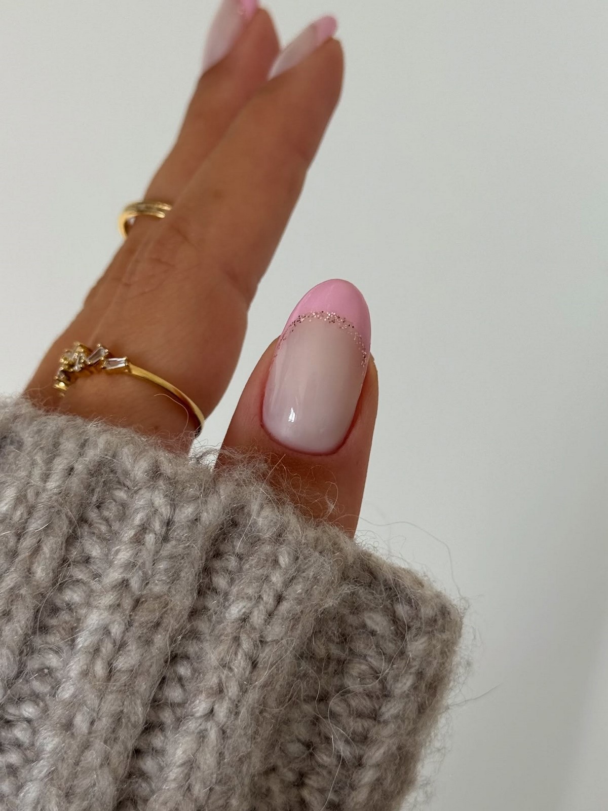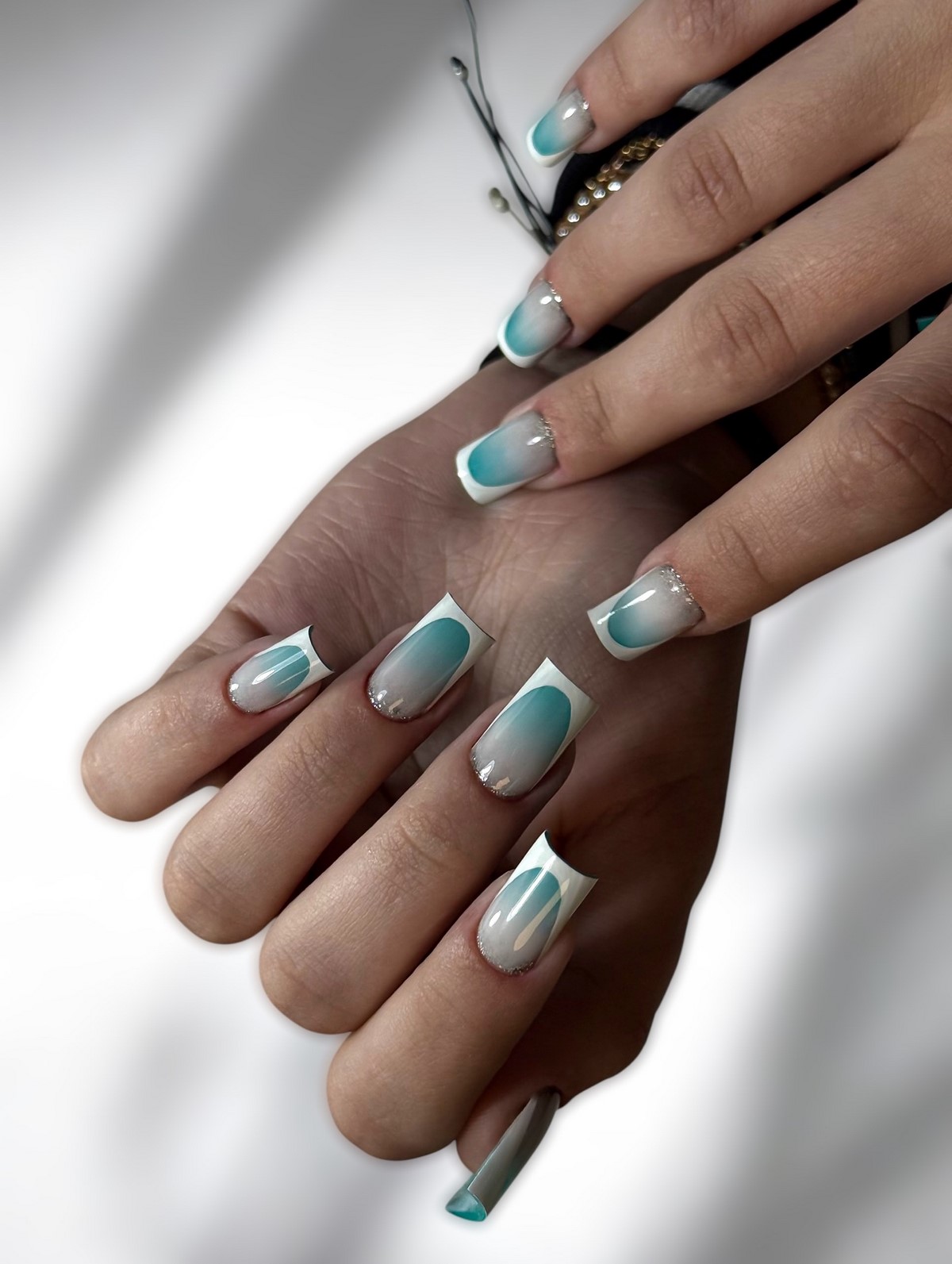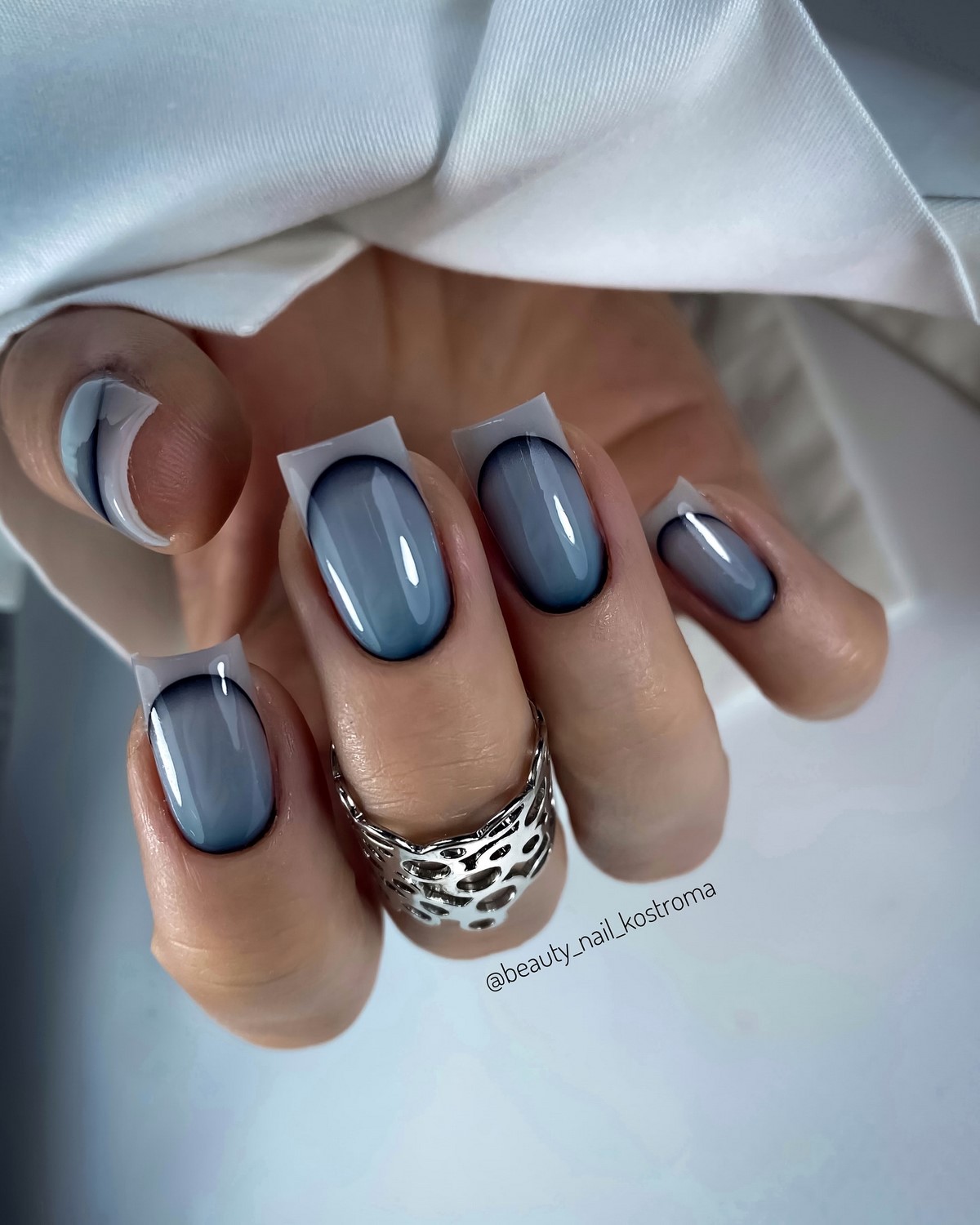 Градиентный френч – это воплощение плавности и гармонии в дизайне ногтей. Техника предполагает мягкий переход от одного оттенка к другому, создавая эффект омбре на свободном крае. Зимние вариации градиента особенно выигрышно смотрятся в холодной палитре: от нежно-голубого к глубокому синему, от жемчужного к серебристому, от нюдового к темно-фиолетовому. Этот дизайн добавляет маникюру объемности и глубины, создавая визуальный эффект акварельной живописи на ногтях.