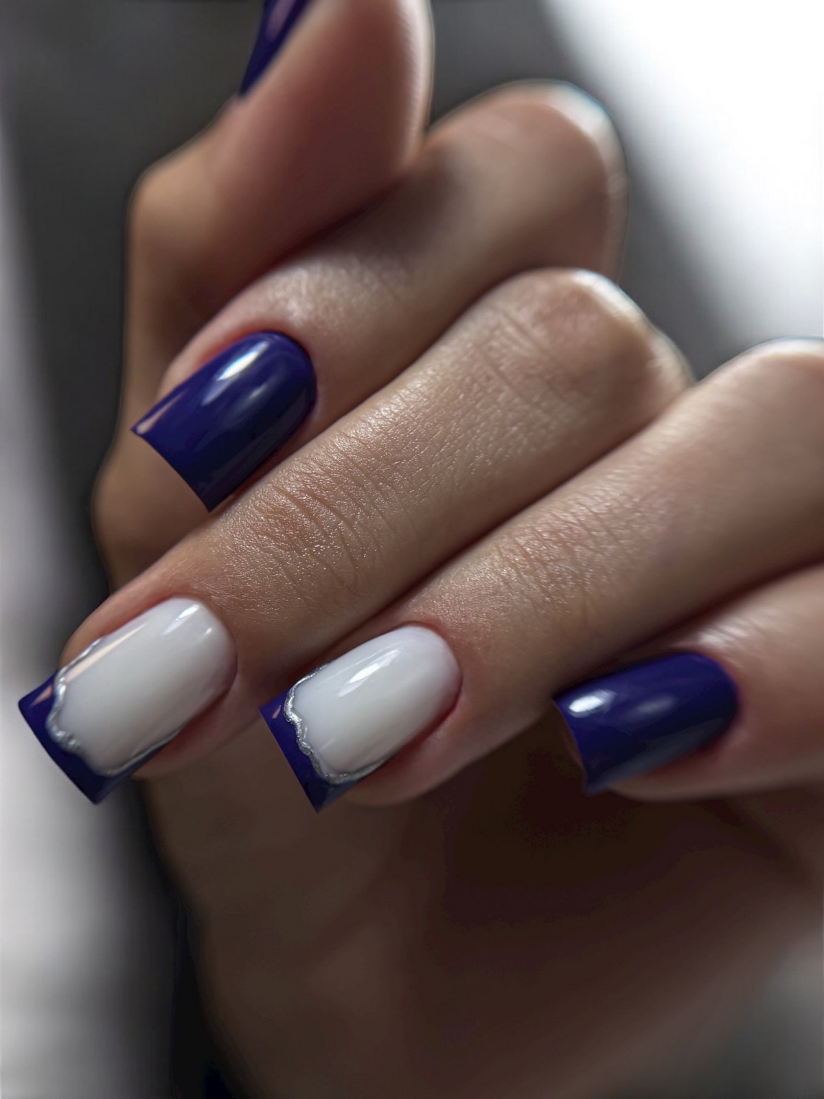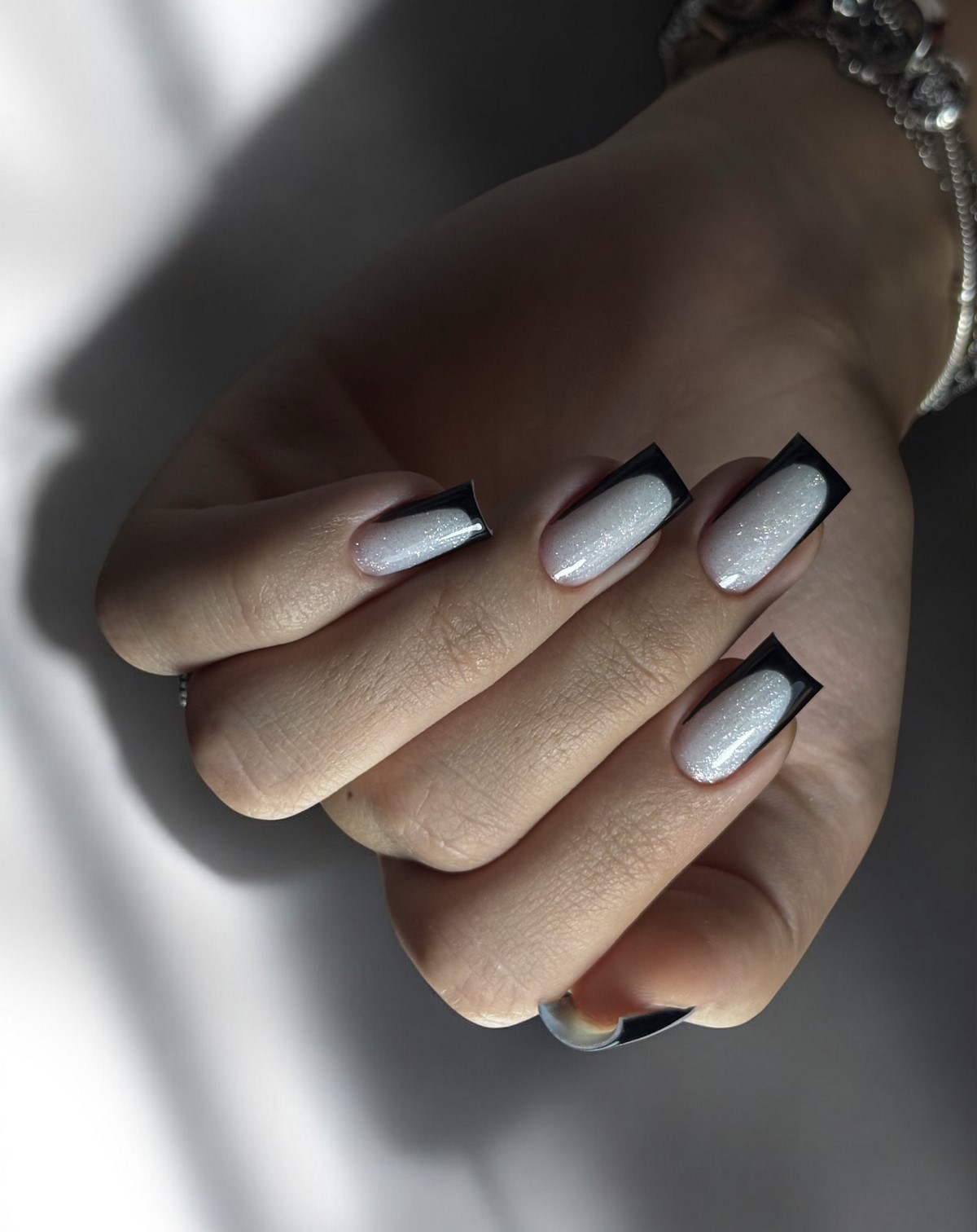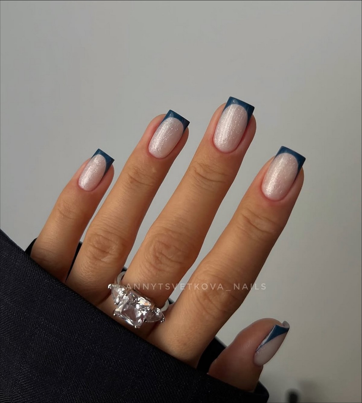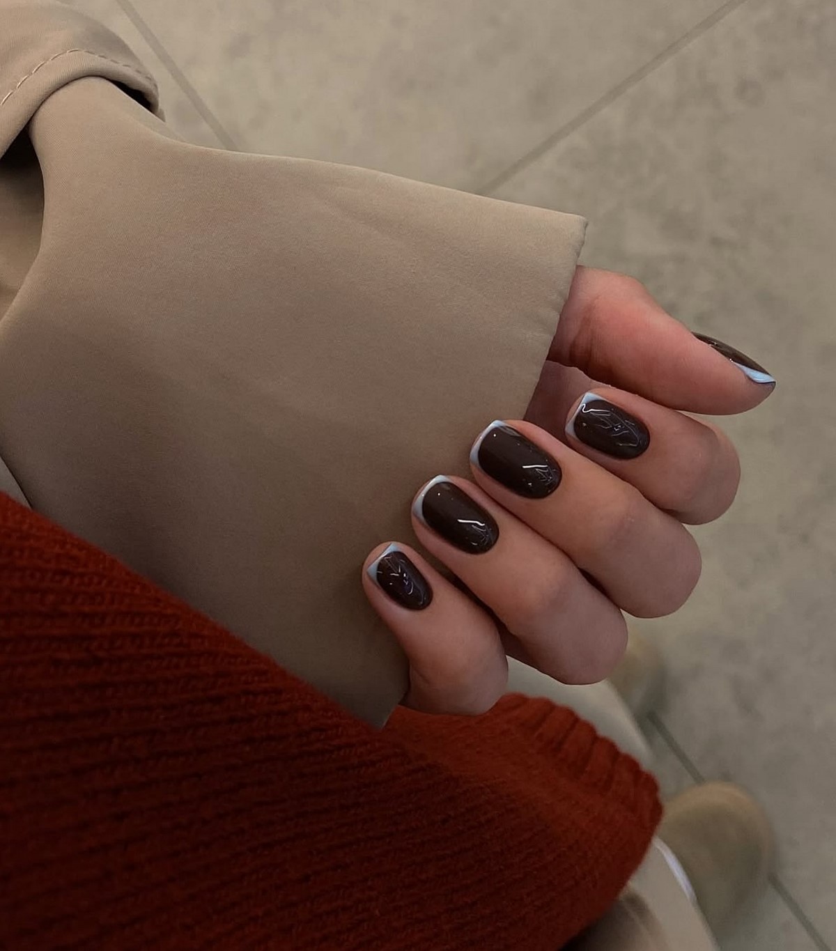 Инверсия классического френча – один из главных трендов сезона. Вместо светлой основы и белого кончика здесь используется темная, насыщенная база и нейтральный контрастный свободный край. Это может быть шоколадная основа с голубым краем, черная основа с белоснежным, темно-синяя с золотым, изумрудная с жемчужным. Такой подход создает драматичный, запоминающийся образ, который идеально вписывается в зимнюю эстетику. Контраст добавляет маникюру графичности и делает руки центром притяжения взглядов.