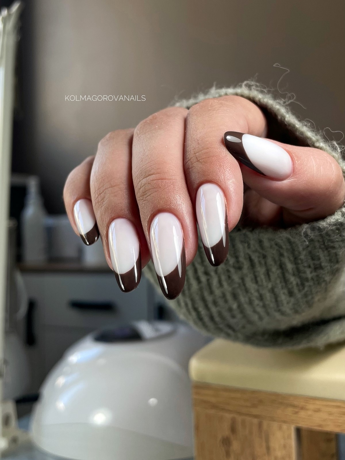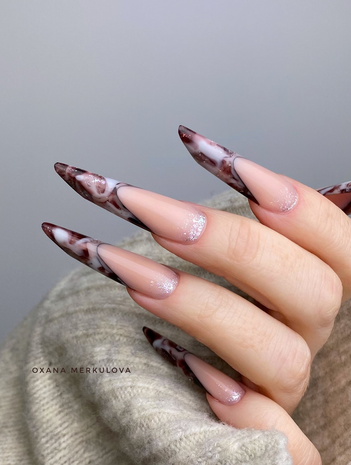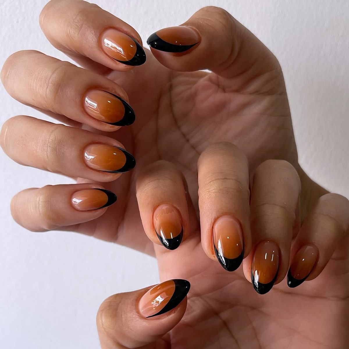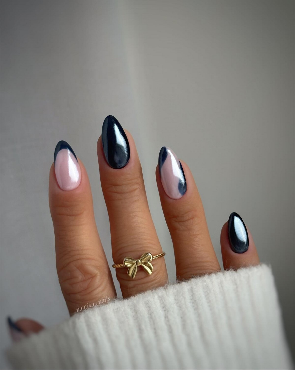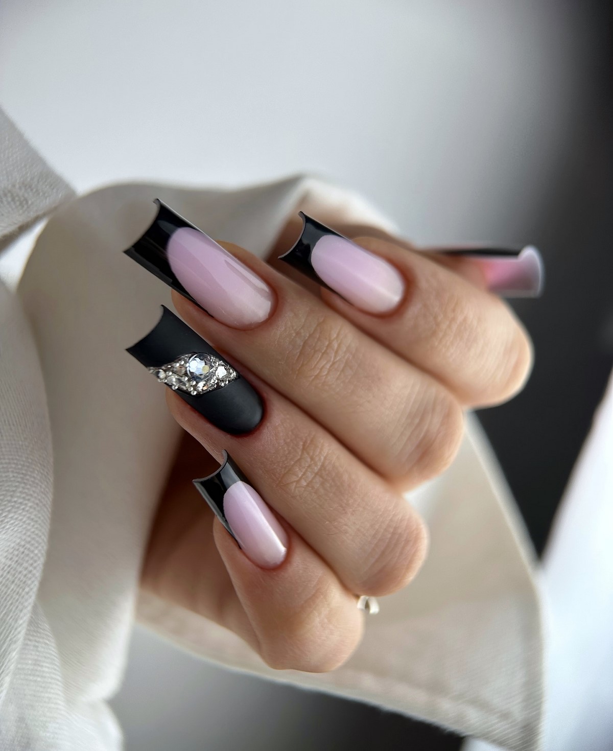 Инверсия классического френча – один из главных трендов сезона. Вместо светлой основы и белого кончика здесь используется темная, насыщенная база и нейтральный контрастный свободный край. Это может быть шоколадная основа с голубым краем, черная основа с белоснежным, темно-синяя с золотым, изумрудная с жемчужным. Такой подход создает драматичный, запоминающийся образ, который идеально вписывается в зимнюю эстетику. Контраст добавляет маникюру графичности и делает руки центром притяжения взглядов.