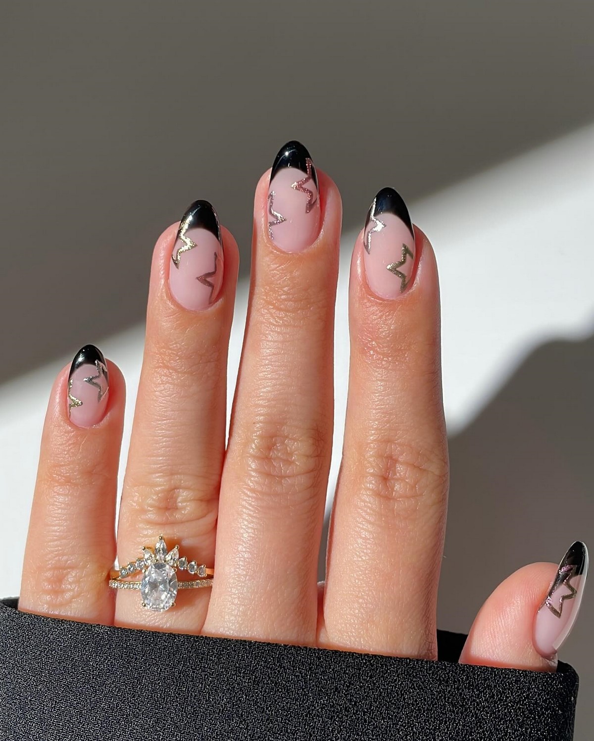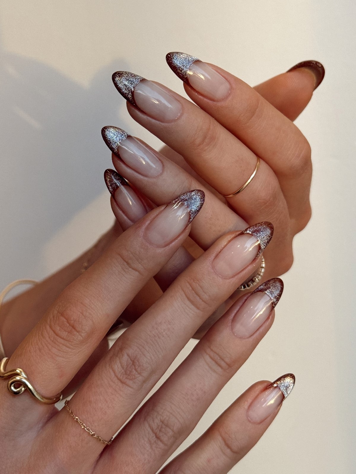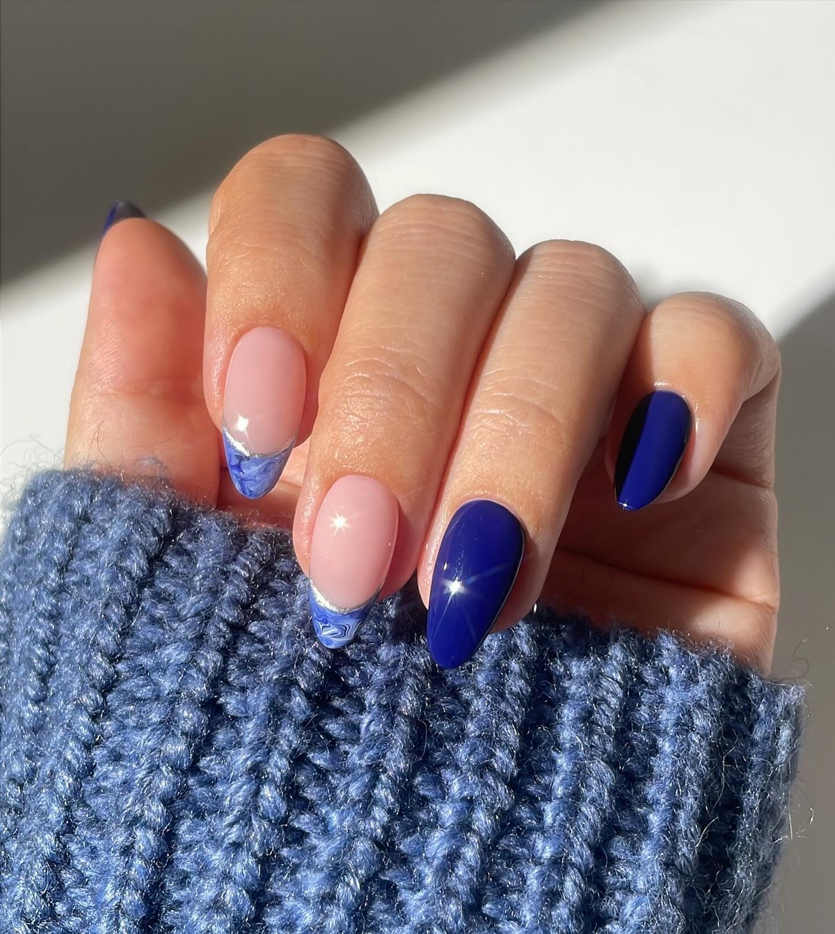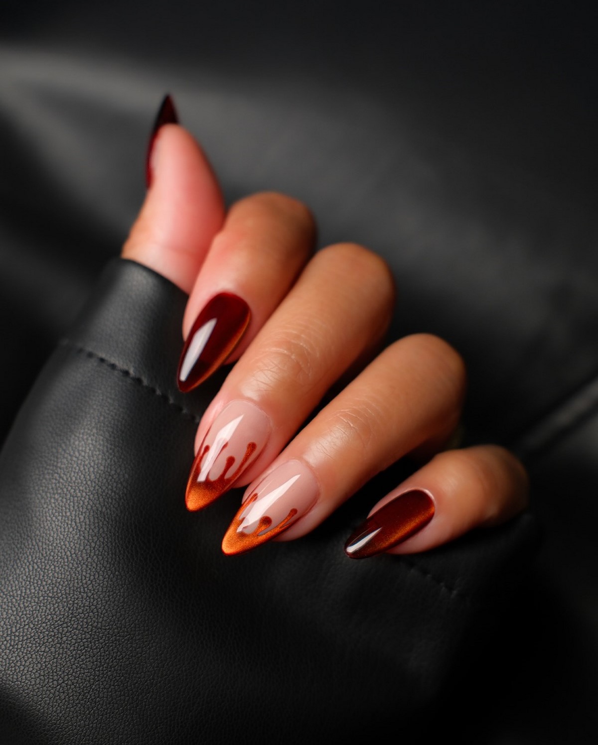 Инверсия классического френча – один из главных трендов сезона. Вместо светлой основы и белого кончика здесь используется темная, насыщенная база и нейтральный контрастный свободный край. Это может быть шоколадная основа с голубым краем, черная основа с белоснежным, темно-синяя с золотым, изумрудная с жемчужным. Такой подход создает драматичный, запоминающийся образ, который идеально вписывается в зимнюю эстетику. Контраст добавляет маникюру графичности и делает руки центром притяжения взглядов.