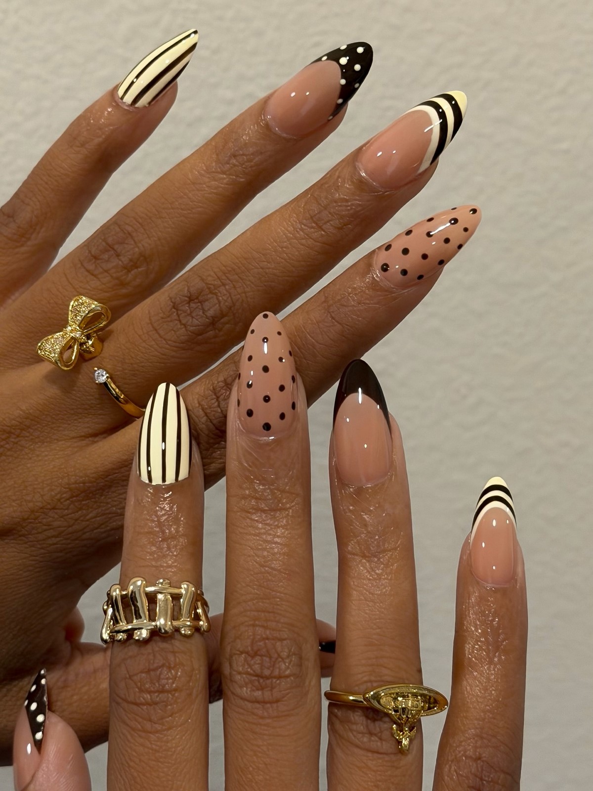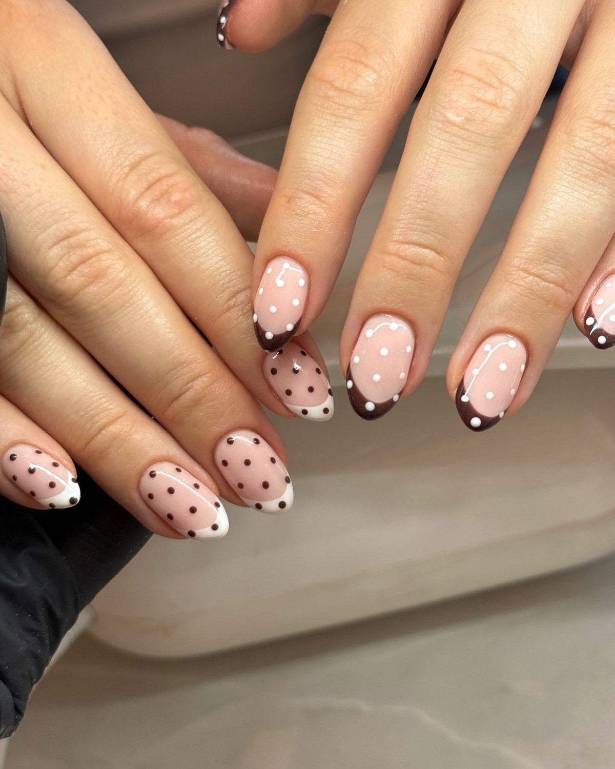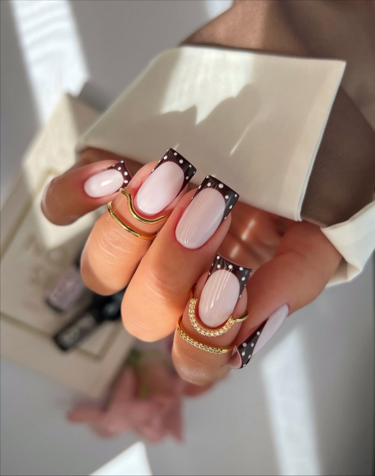 Игривый горошек возвращается в мир nail-арта в новом прочтении. Зимняя версия этого дизайна предполагает темный, насыщенный свободный край – глубокий синий, бургунди или черный – украшенный аккуратными светлыми точками. Контраст между темной основой и яркими горошинами создает графичный, современный образ. Такой френч прекрасно сочетается с зимними нарядами в стиле ретро и добавляет образу французского шика.