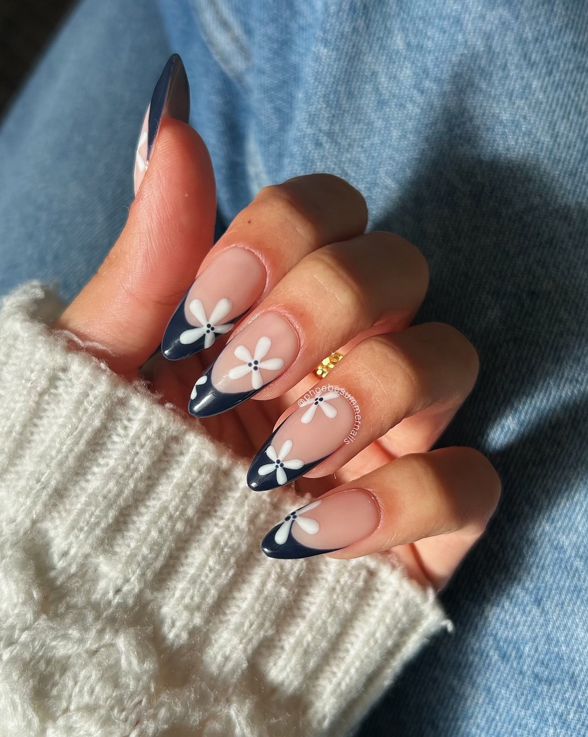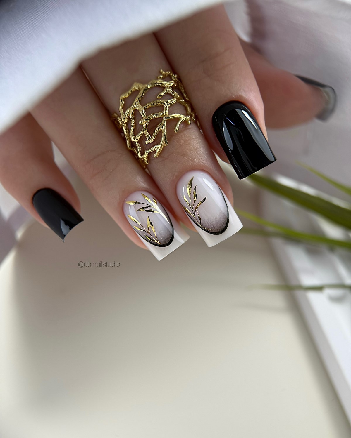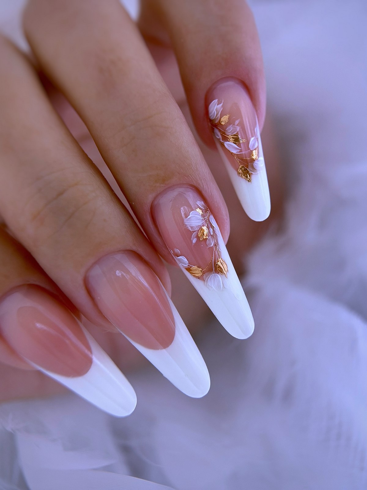 Флористические мотивы не уходят из моды даже зимой, просто трансформируются в более сдержанные варианты. Темный свободный край – черный, темно-синий или изумрудный – становится фоном для миниатюрных белых цветов, нарисованных тонкой кистью. Это могут быть абстрактные цветочные узоры, напоминающие морозные узоры на окнах, или детально прорисованные бутоны. Такой дизайн сочетает в себе зимнюю строгость и нежную женственность, создавая уникальный баланс.