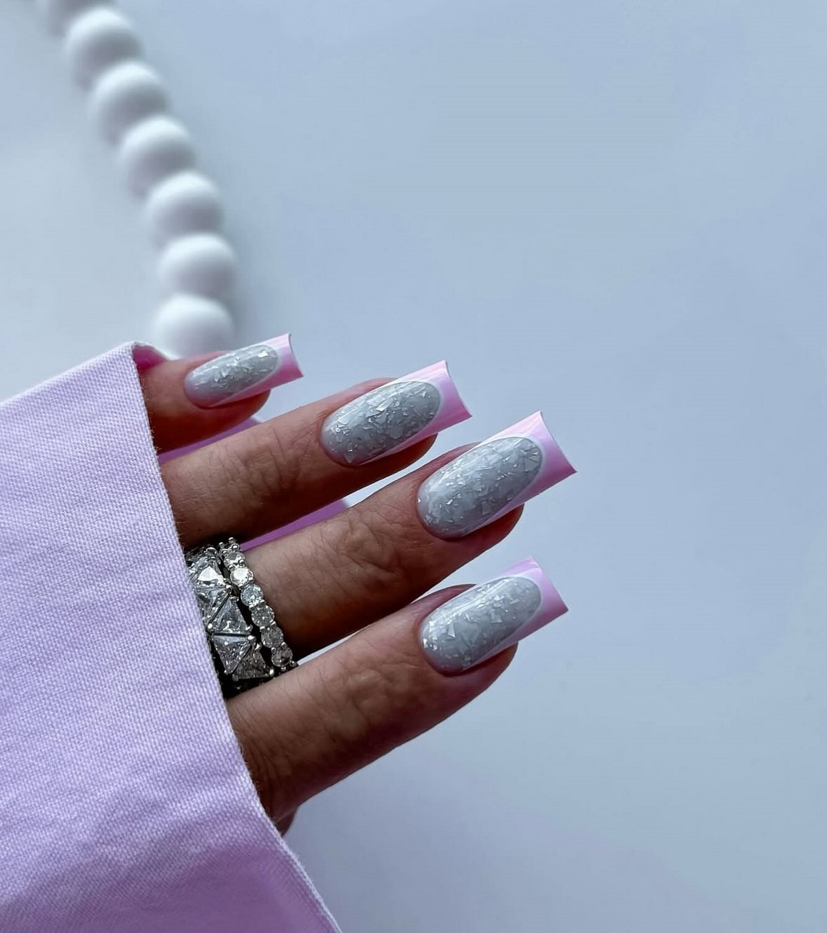 Для поклонниц минимализма и утонченной элегантности дизайнеры предлагают нежный вариант зимнего френча. Основа выполняется в нежно-розовом или персиковом оттенке, создавая эффект естественной ногтевой пластины. Изюминка дизайна – тончайшая серебристая полоска, которая деликатно отделяет свободный край, добавляя маникюру изысканности. Этот вариант идеально подходит для офисного дресс-кода и повседневной носки, оставаясь при этом актуальным и стильным решением.