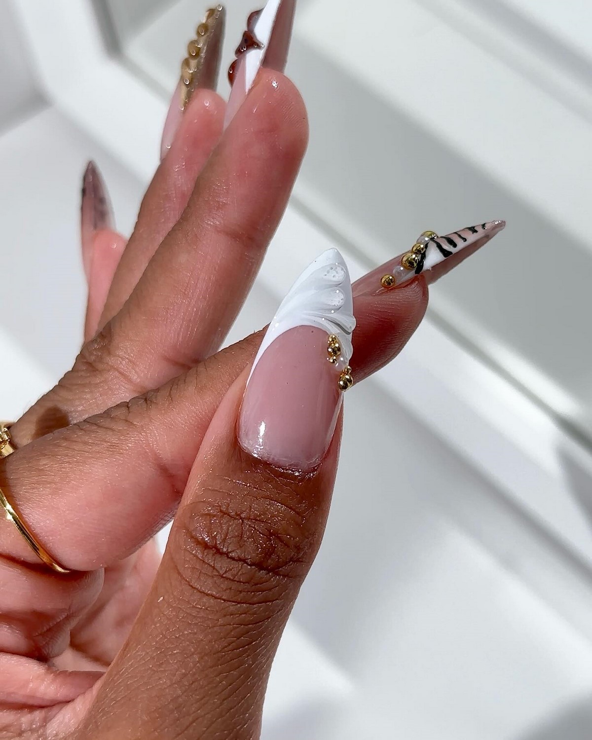Анималистические мотивы продолжают господствовать в мире моды, и nail-индустрия не осталась в стороне от этого тренда. Особенность зимнего френча с анимал-принтами заключается в том, что каждый ноготь может быть оформлен уникальным узором – на одном пальце леопардовый принт, на другом зебра, на третьем змеиная кожа. Такое разнообразие создает динамичный, игривый образ, который точно не останется незамеченным. Свободный край при этом выполняется в классической технике, а вот основа ногтя становится холстом для диких орнаментов.