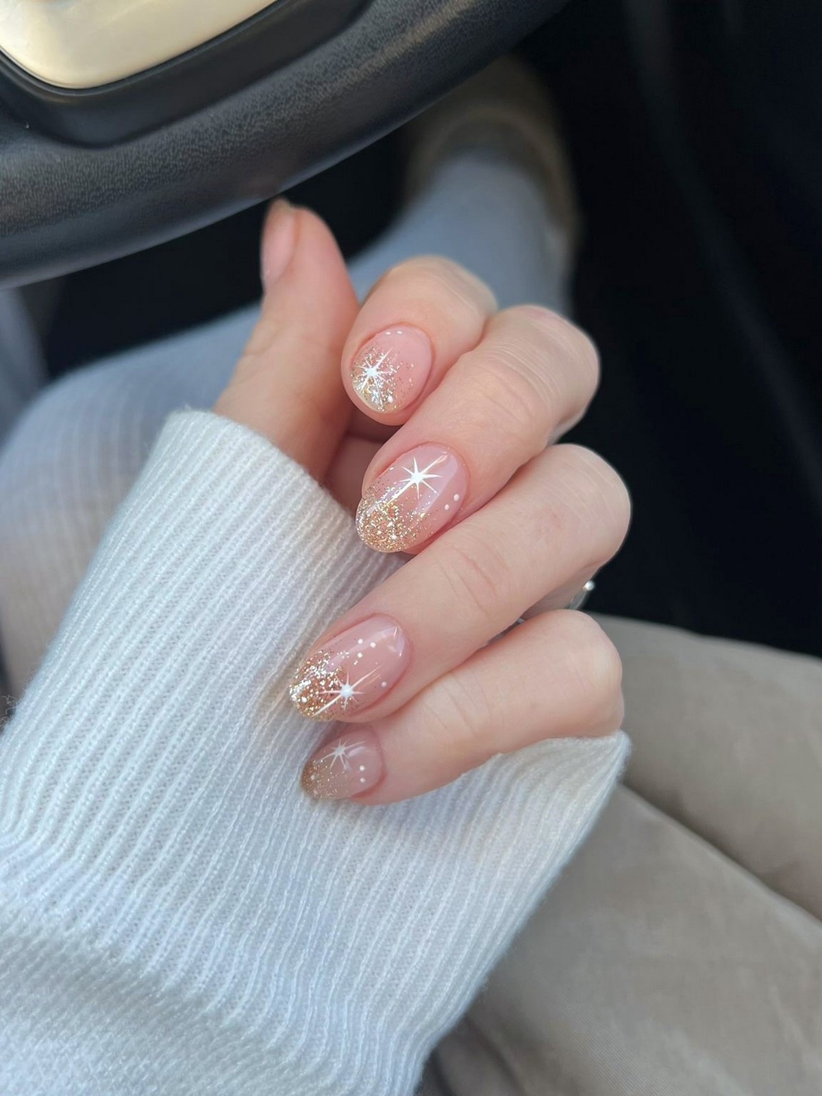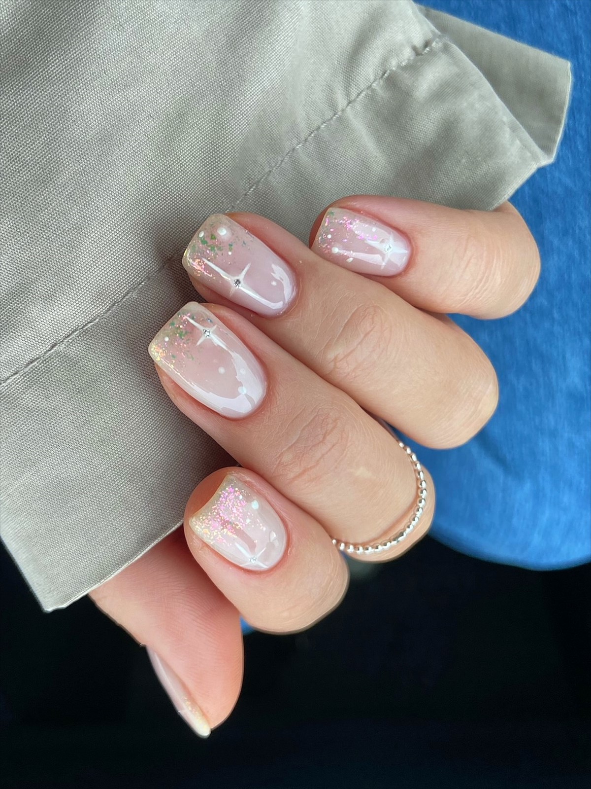 Блестки в зимнем сезоне 2026 приобретают более утонченный характер. В моде мелкий, почти пылевидный шиммер, который словно подсвечивает ногти изнутри. Чаще всего его используют на прозрачной, молочной или нюдовой базе.