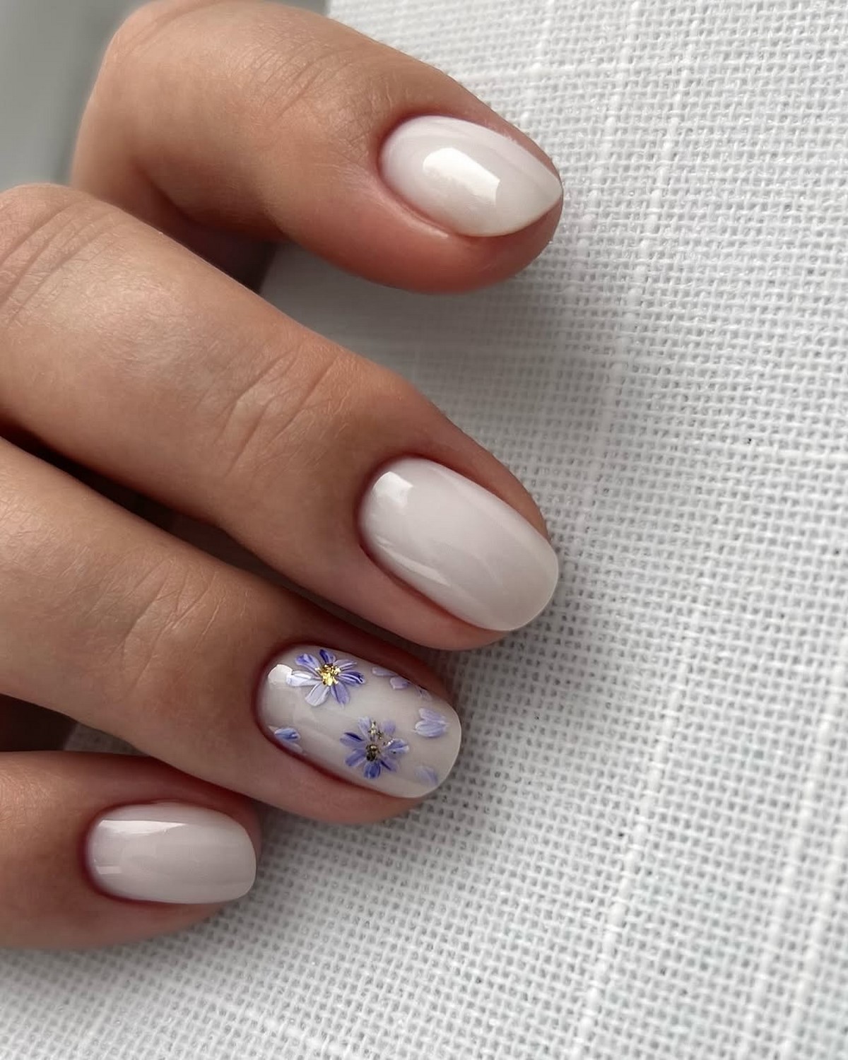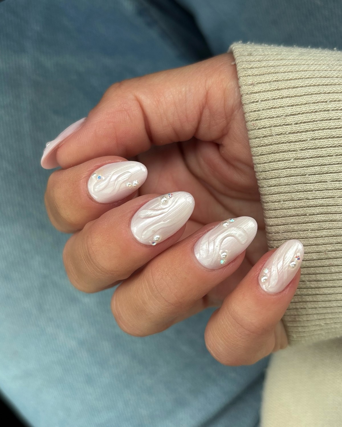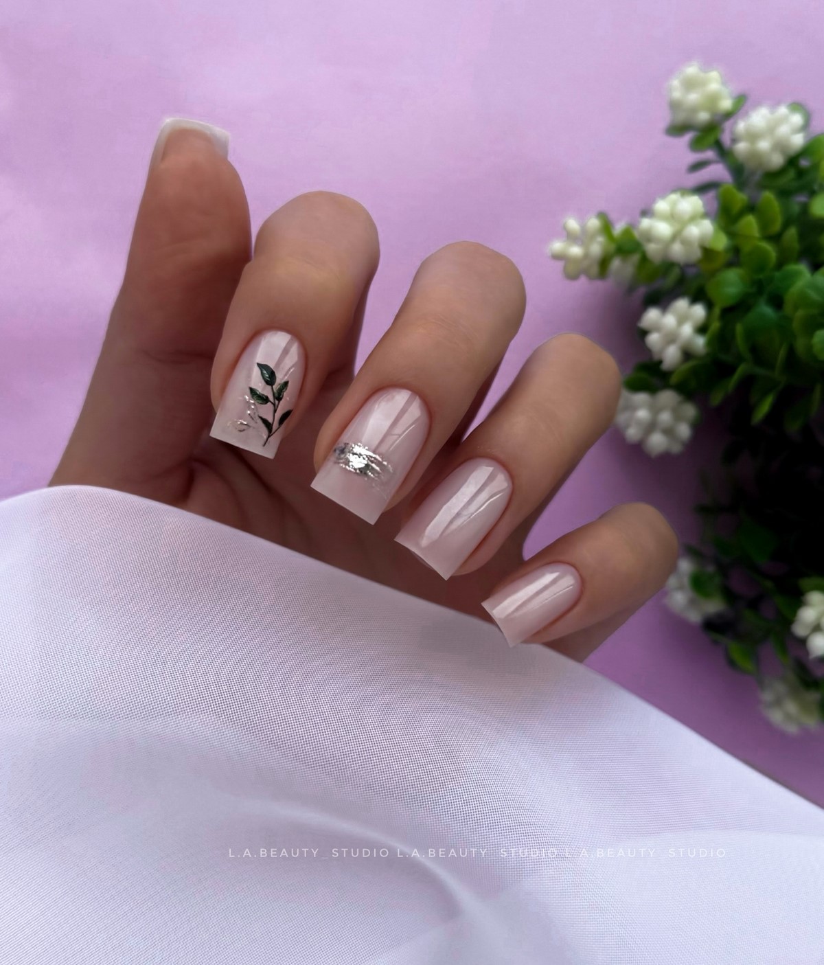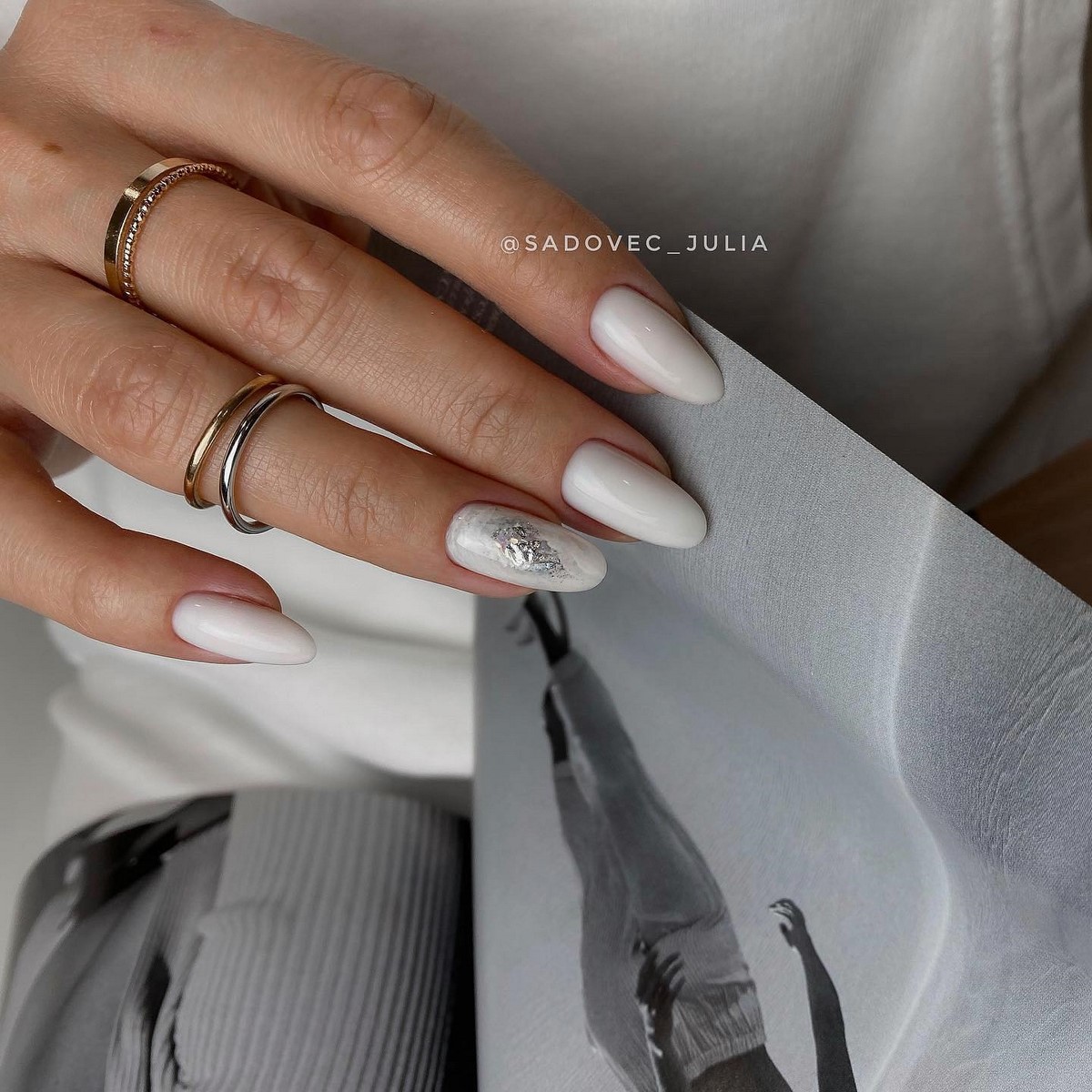 Молочный маникюр становится еще интереснее с акцентами: объемные элементы, золотая фольга, жемчужные капли.