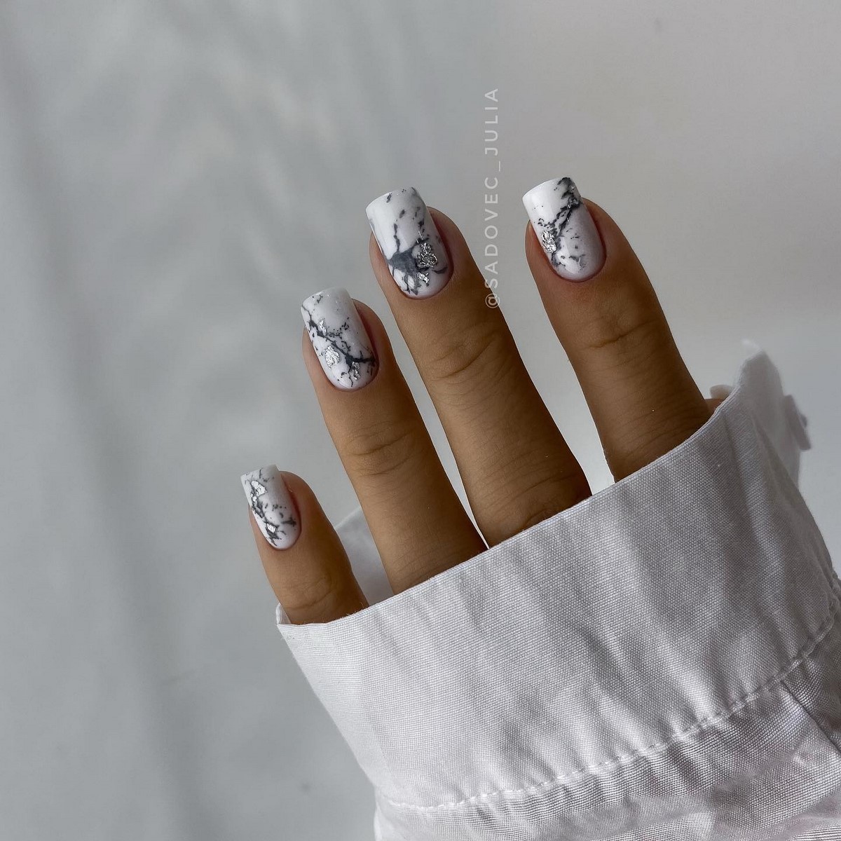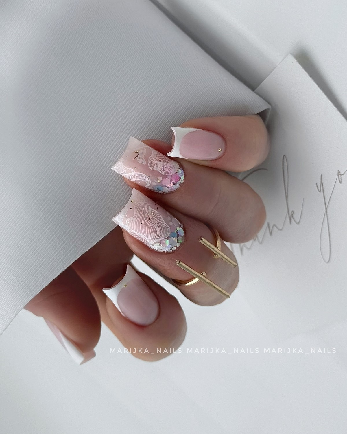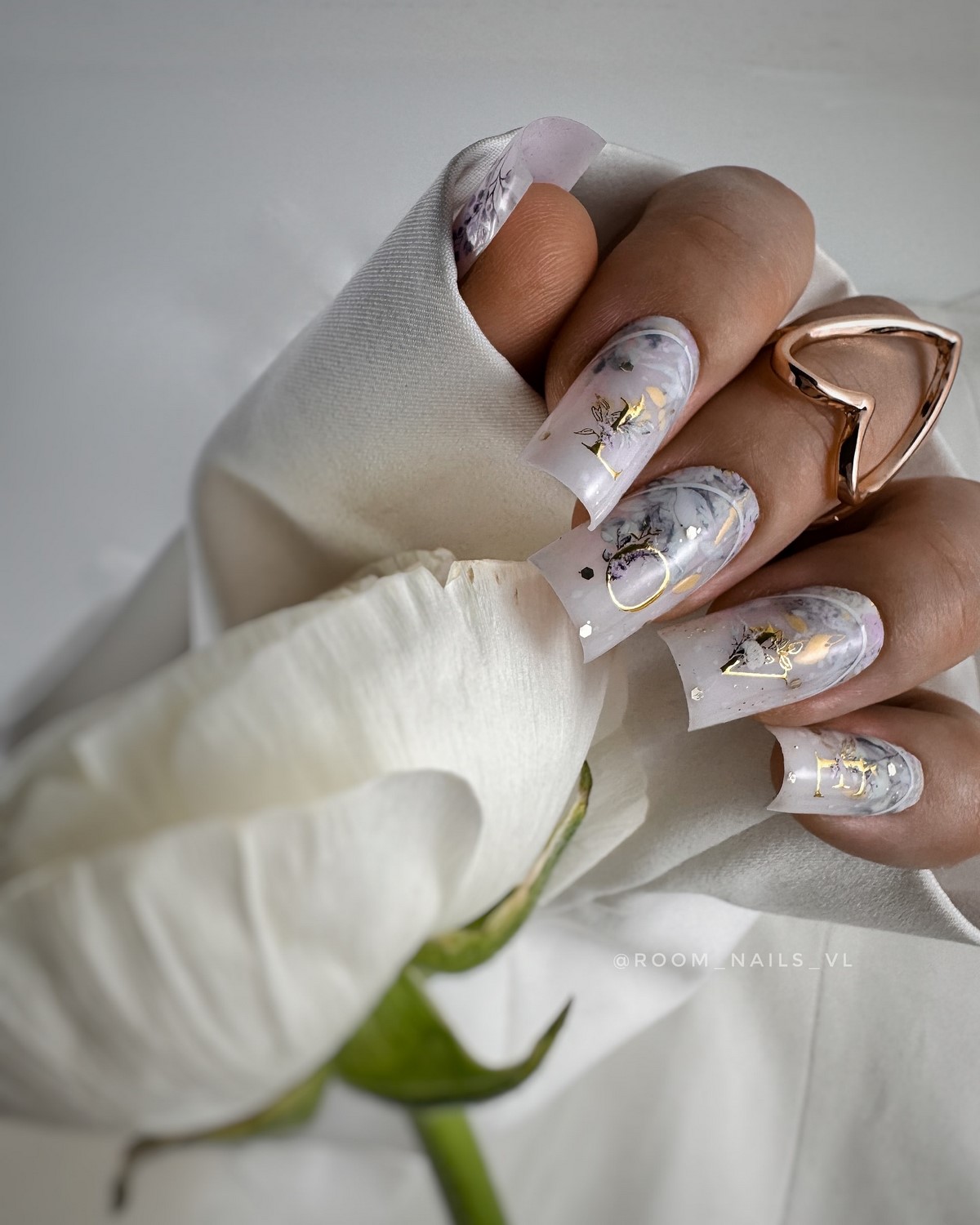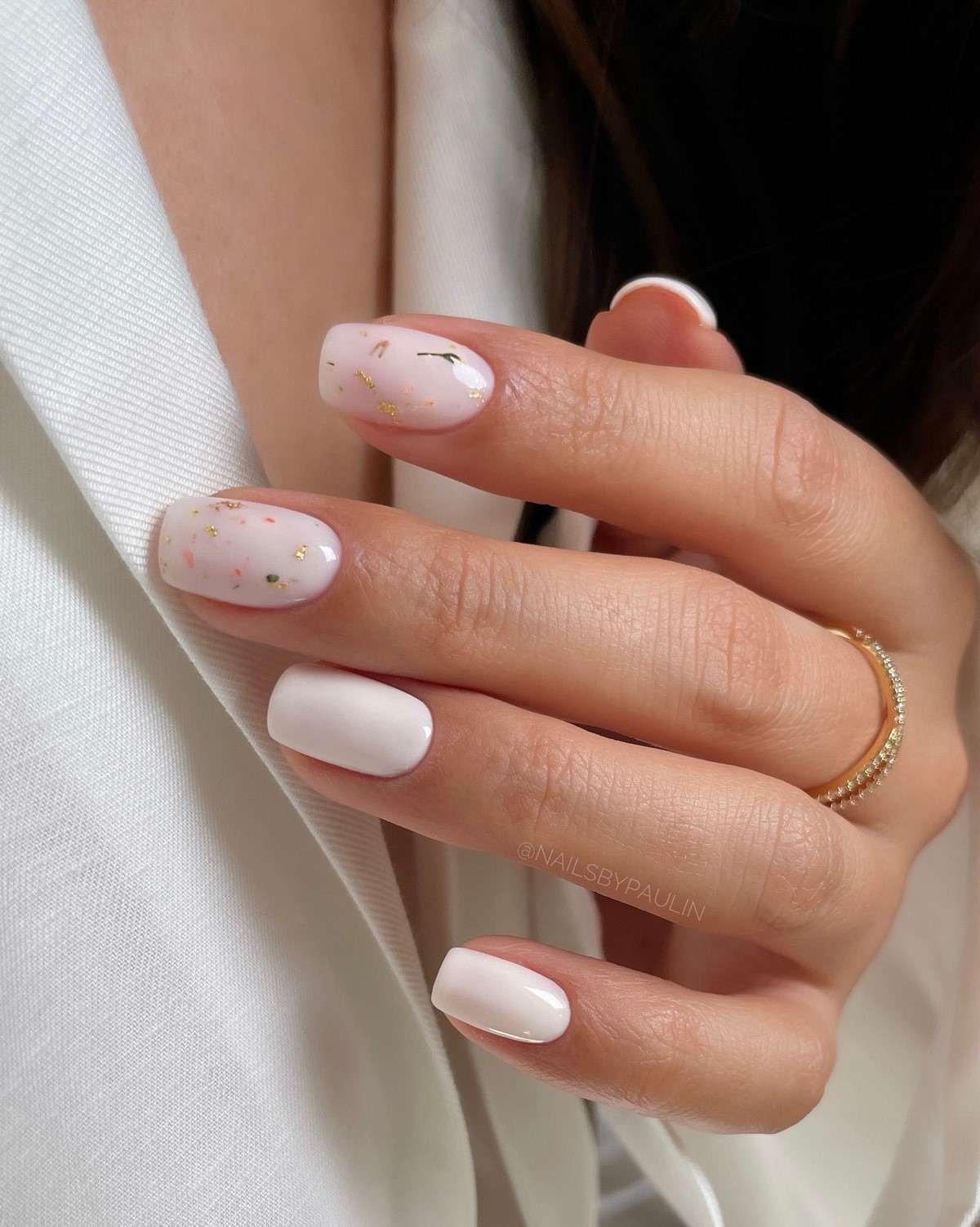Молочный маникюр становится еще интереснее с акцентами: объемные элементы, золотая фольга, жемчужные капли.