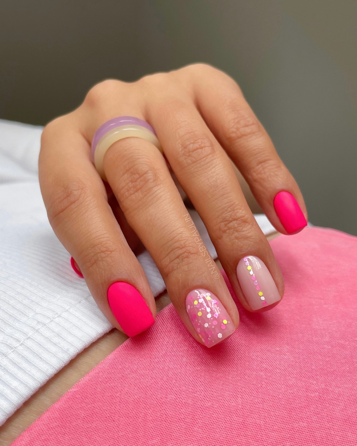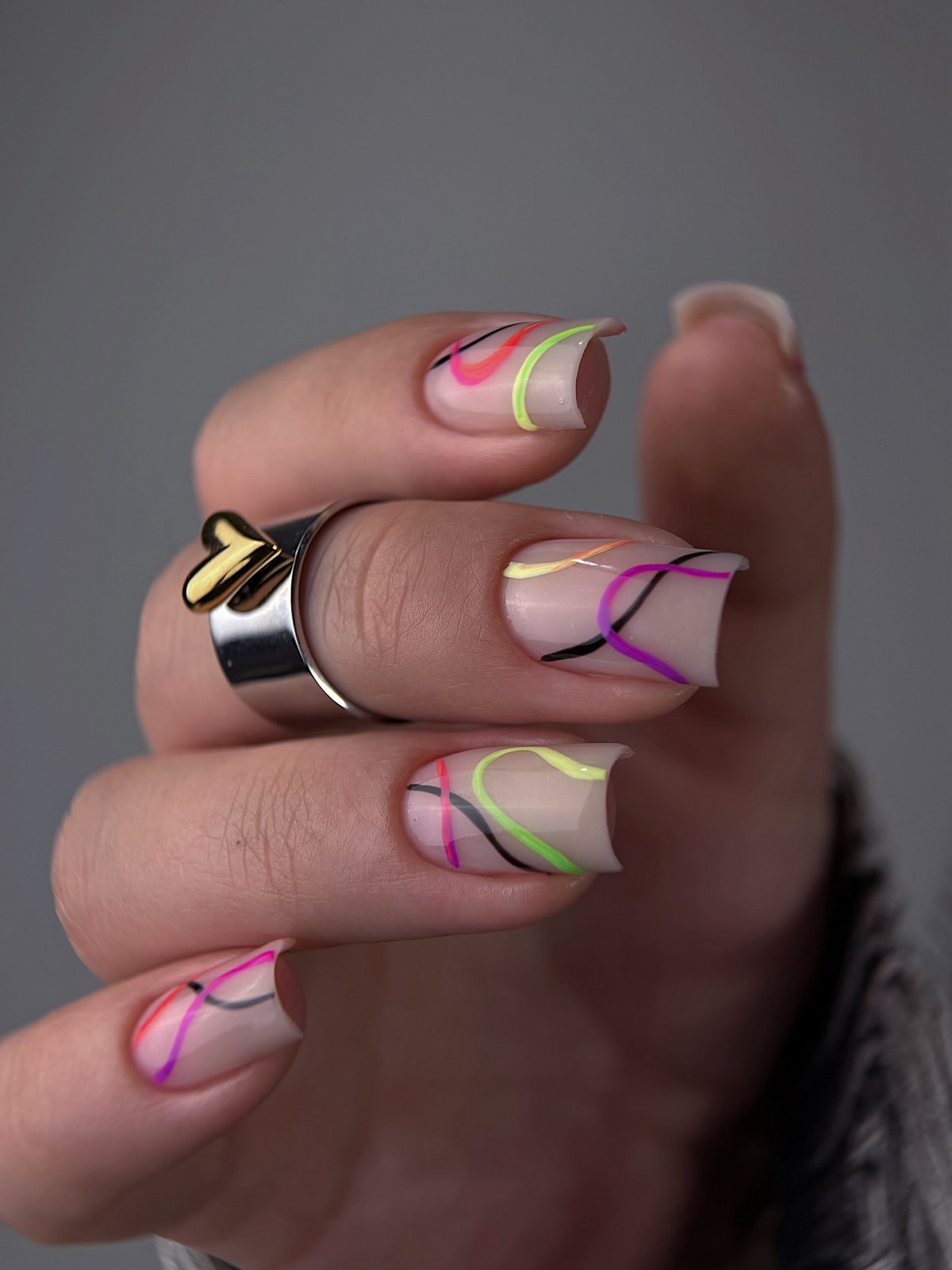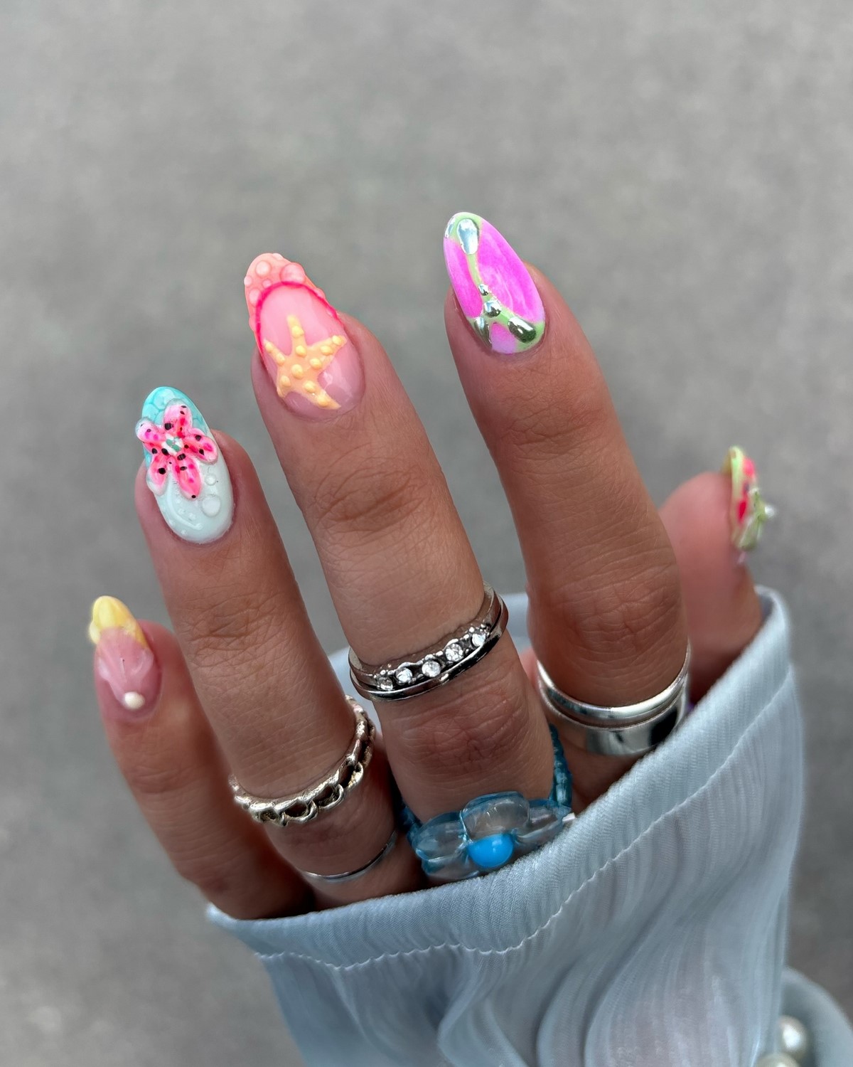 Каждый ноготь — свой цвет! Такой маникюр отражает летнее настроение, добавляя в образ жизнерадостность. Идеально смотрятся мягкие пастели или контрастные яркие оттенки — в зависимости от образа.