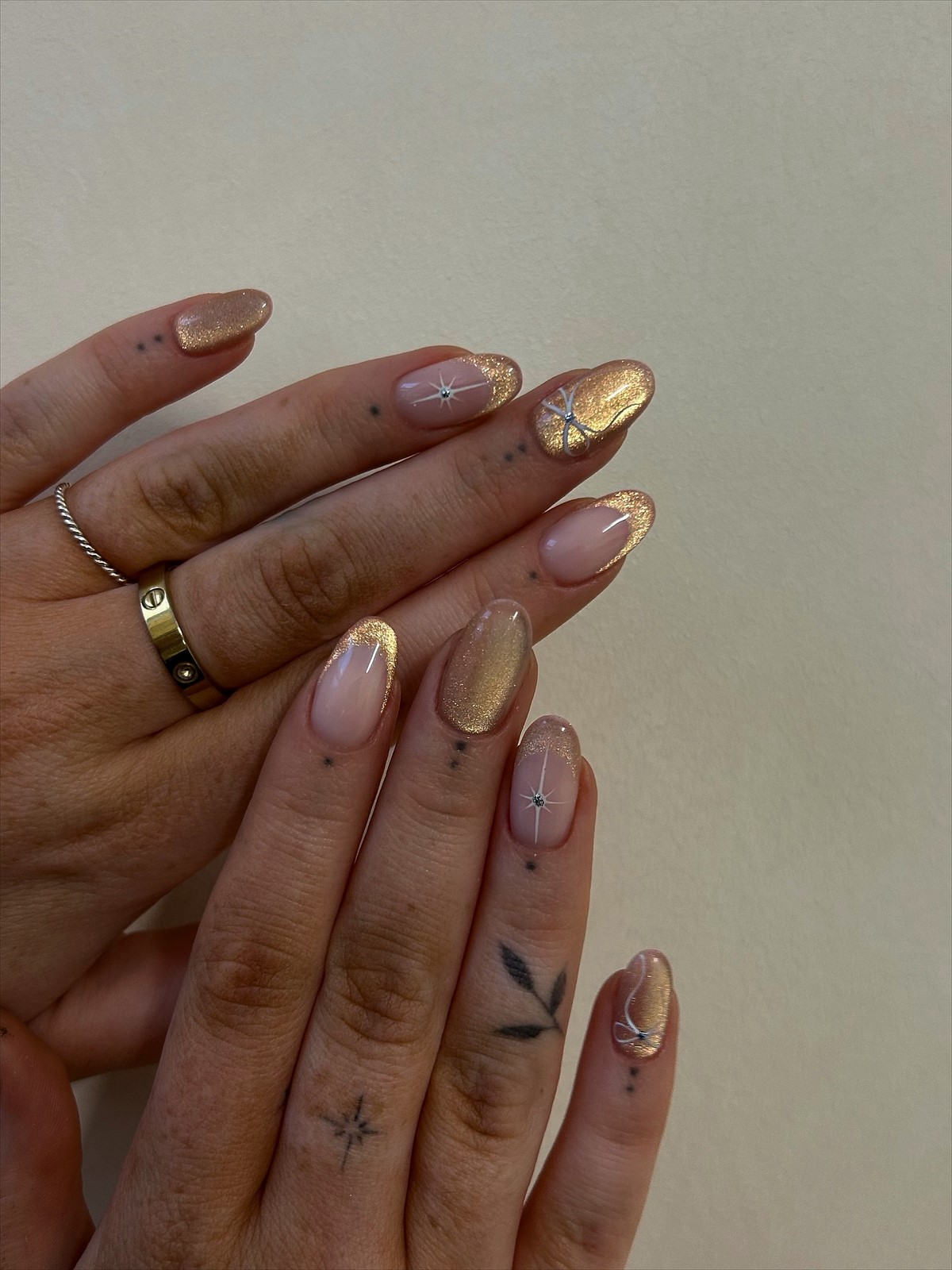 Золотой кошачий глаз особенно эффектен на миндалевидных и овальных ногтях, подчеркивая их форму и создавая ощущение тепла даже в холодный сезон.