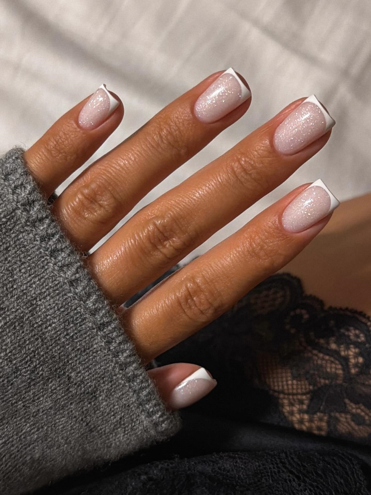 Классический белый френч получает новое прочтение благодаря мягкому градиенту из блесток. Сияние начинается от свободного края и плавно растворяется в базе, создавая эффект воздушности. Это один из самых универсальных вариантов февраля.