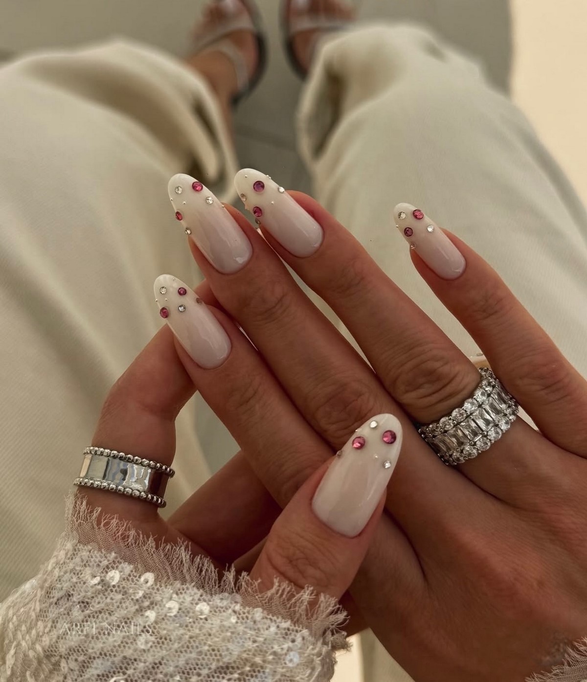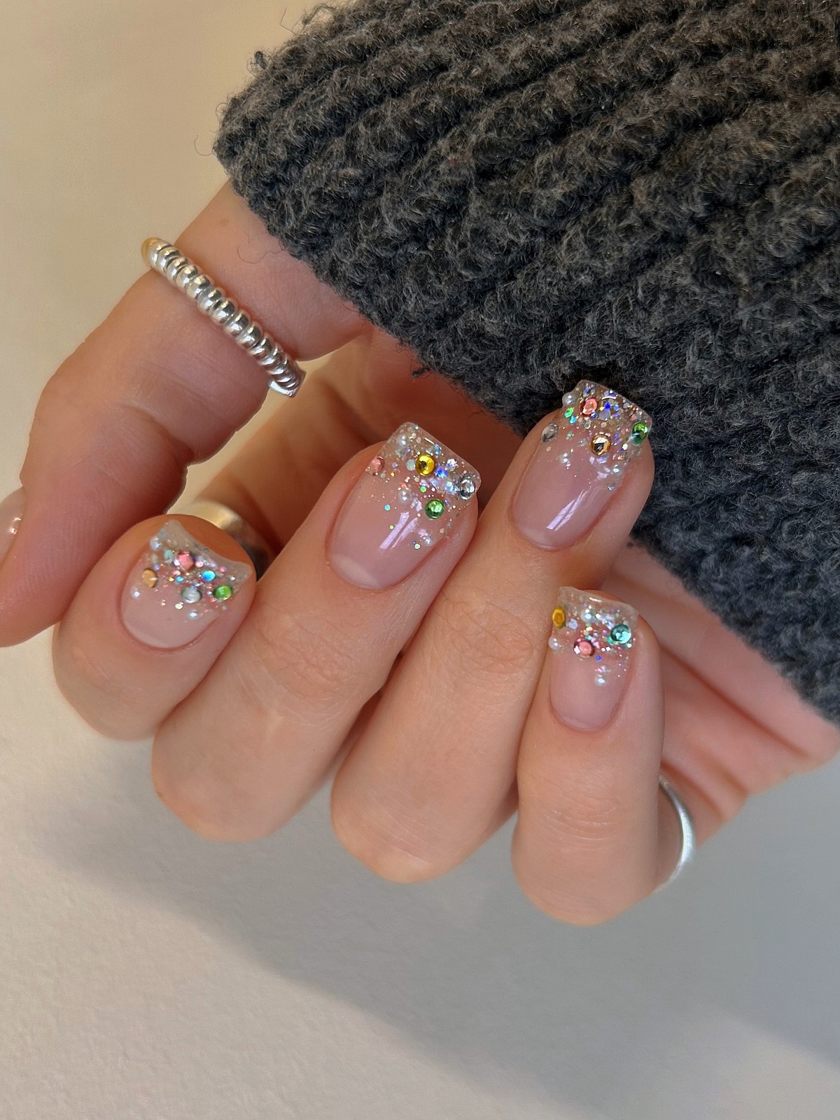 Короткие ногти с прозрачной или полупрозрачной базой становятся идеальным холстом для микростраз. В феврале 2026 их размещают строго по линии френча, создавая аккуратное сияние без перегруженности. Цветные элементы добавляют игривости, сохраняя при этом чистоту дизайна.
