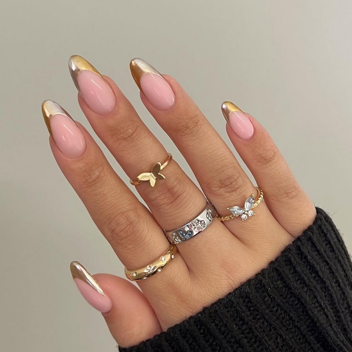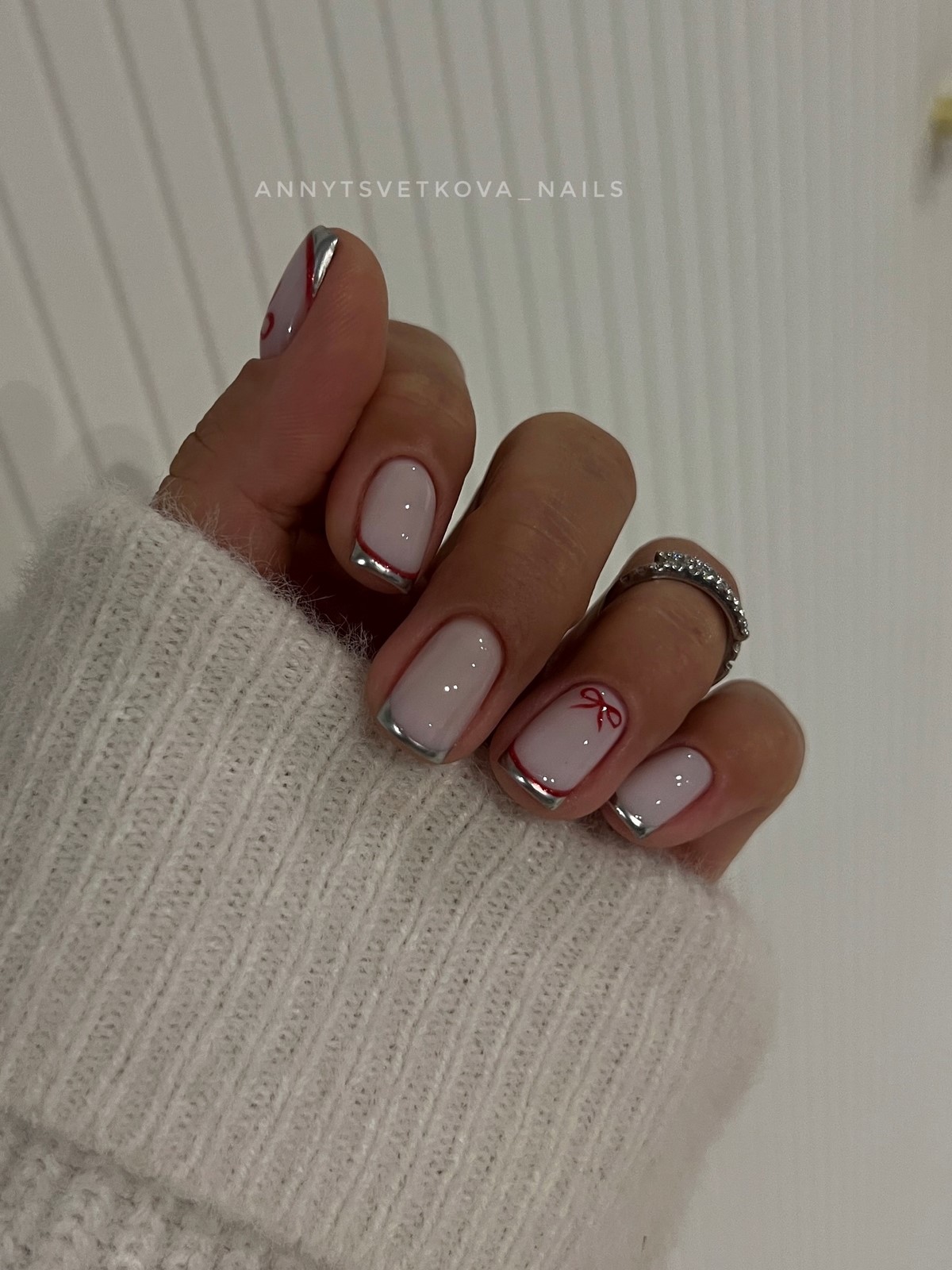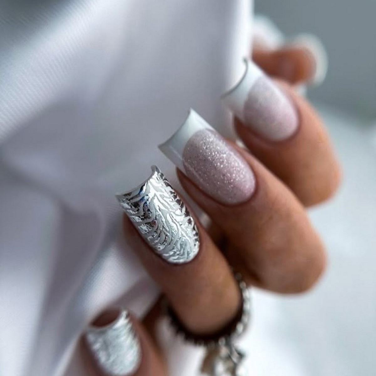Серебряный металлик становится ключевым акцентом зимнего сезона. В френче он используется для оформления свободного края, создавая эффект зеркального сияния. Этот вариант идеально отражает свет и выглядит ультрасовременно.