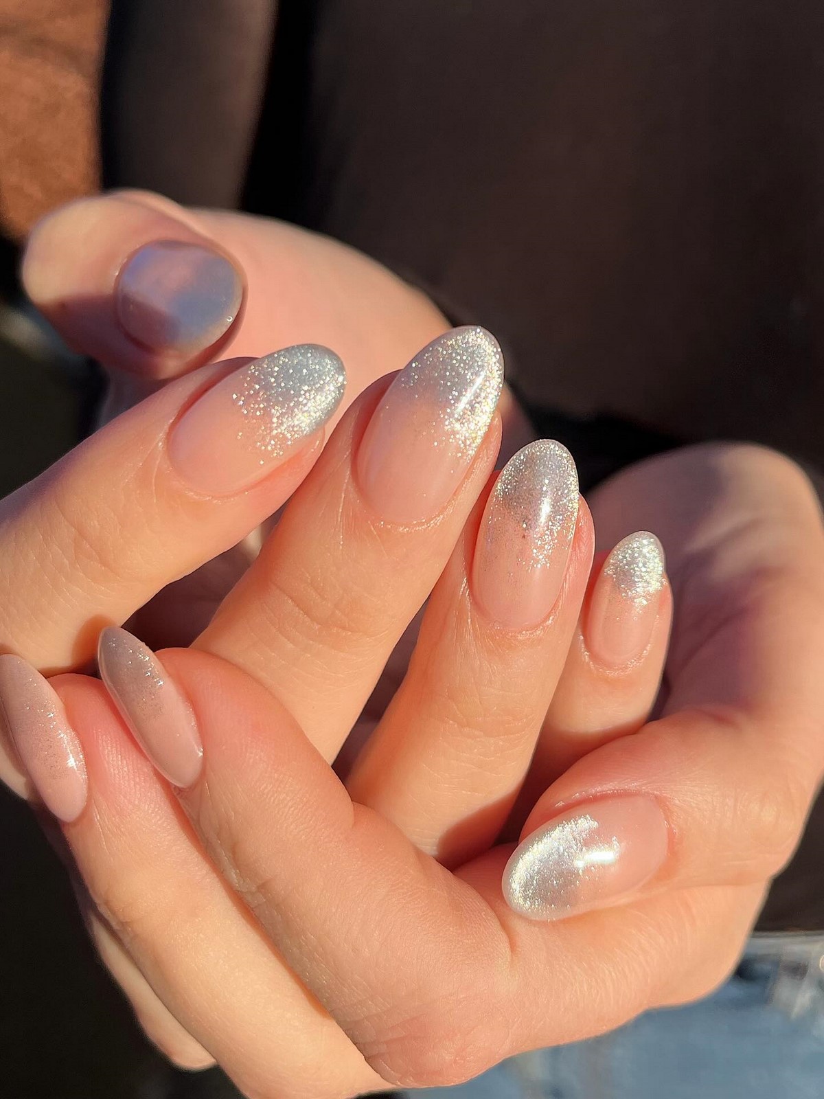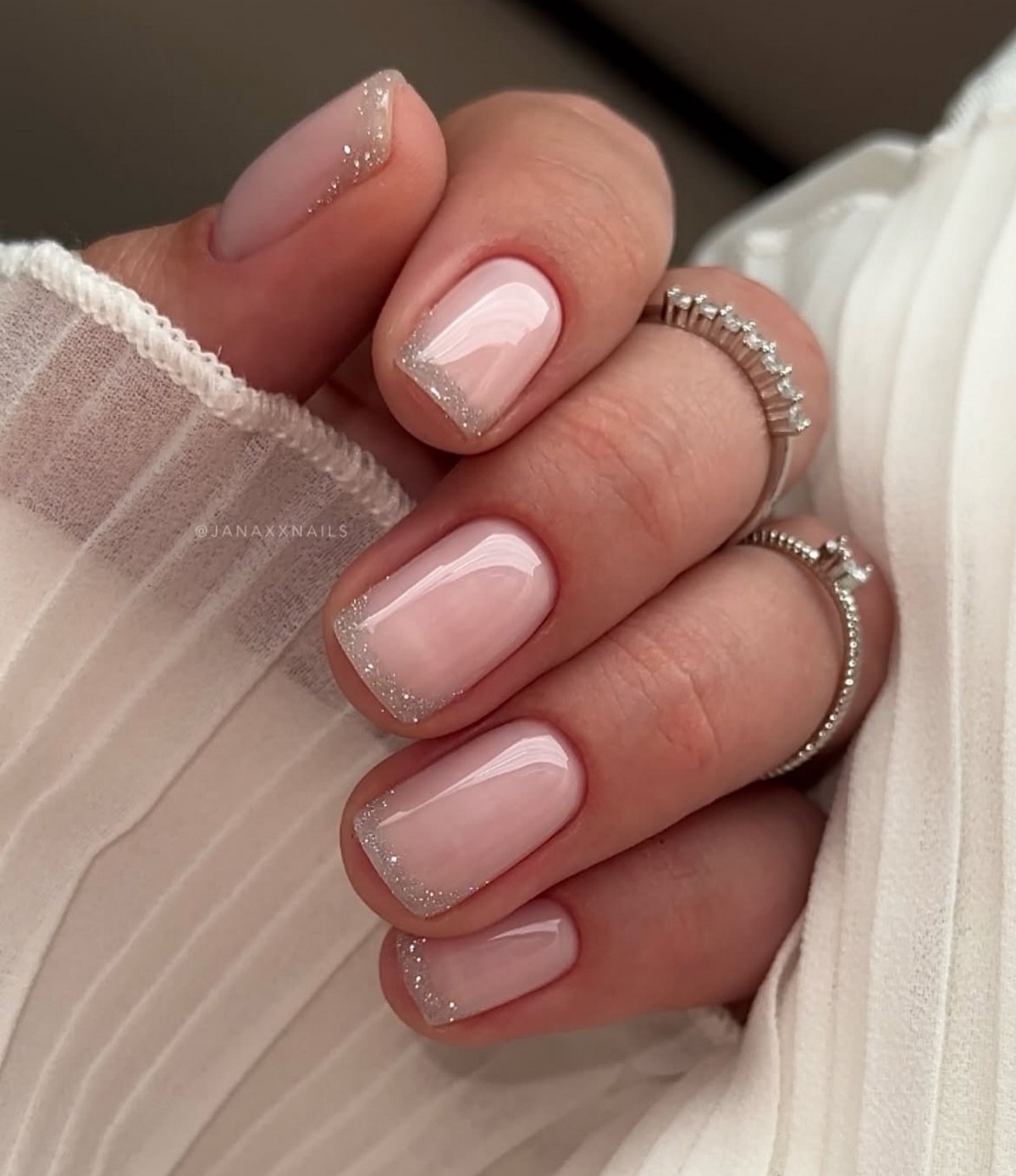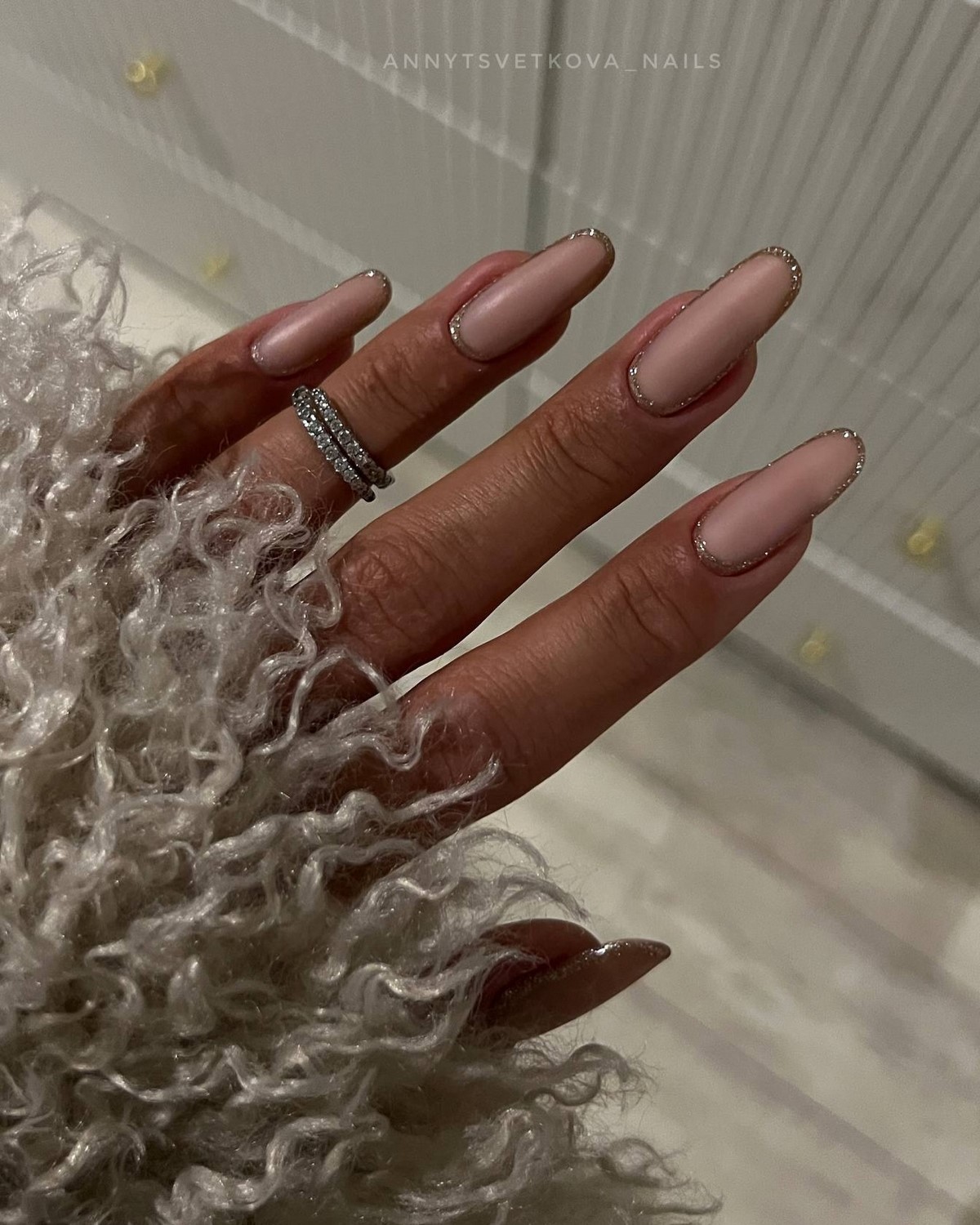 Полностью выделенный блестками свободный край делает френч более выразительным и заметным. В феврале 2026 актуальны мелкие блестки с холодным сиянием, серебристые, прозрачные или с легким перламутром.