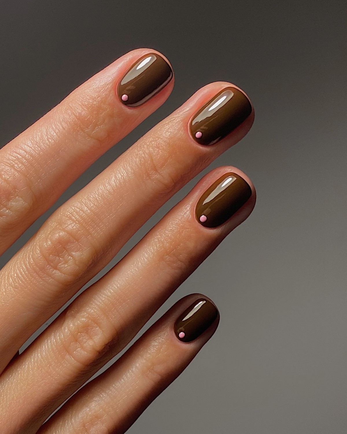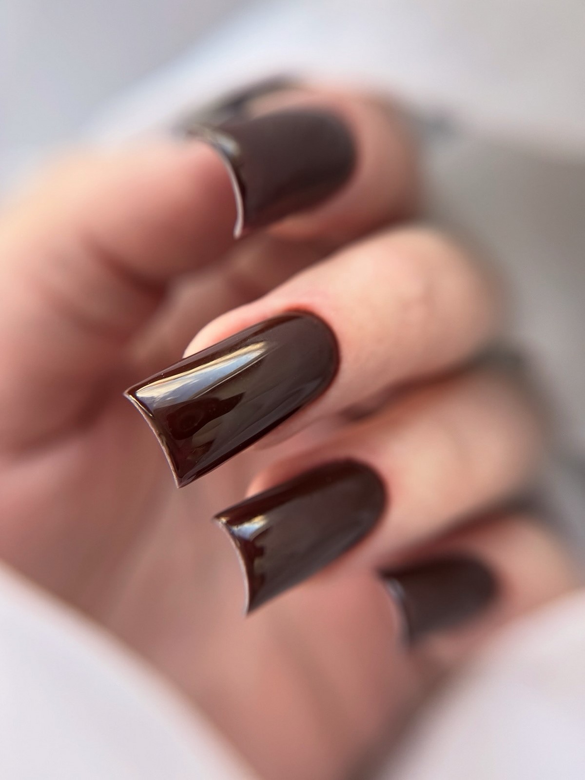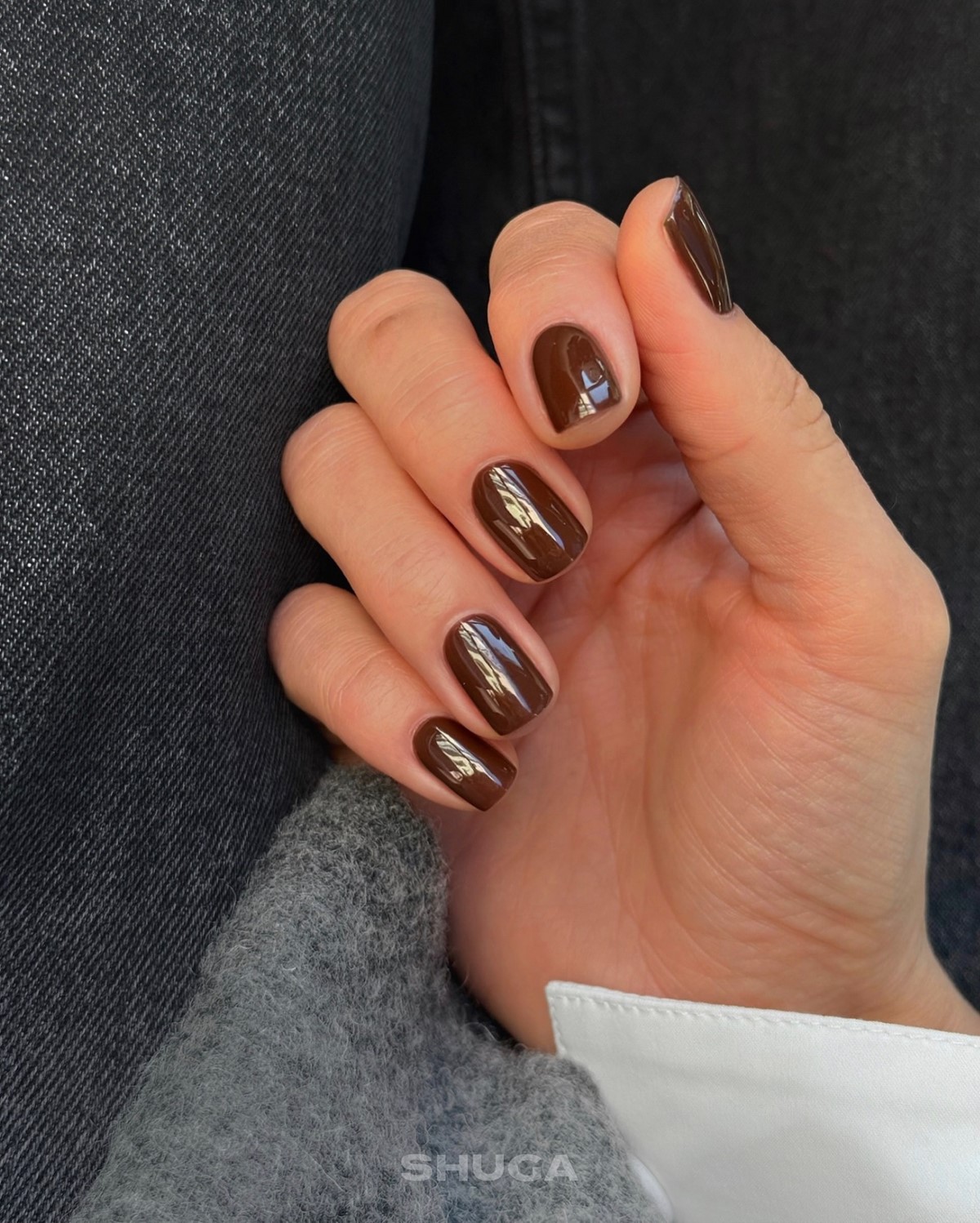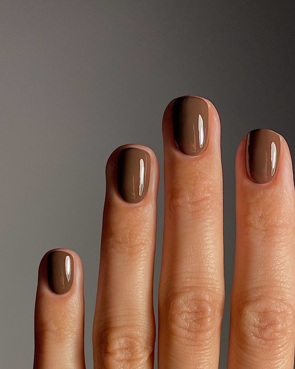 Особенно актуальны однотонные шоколадные покрытия с кремовой текстурой или легким сатиновым блеском. Такой маникюр подчеркивает ухоженность рук и становится стильной альтернативой классическому черному.