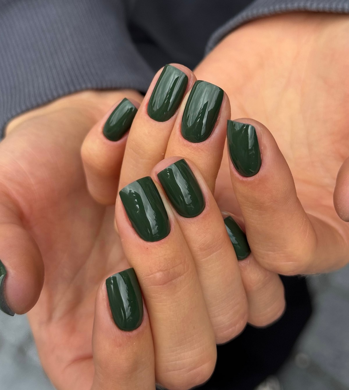Темно-зеленые ногти прекрасно дополняют зимние образы в бежевых, молочных и серых тонах. Это выбор для тех, кто хочет добавить индивидуальности, не нарушая гармонию образа.