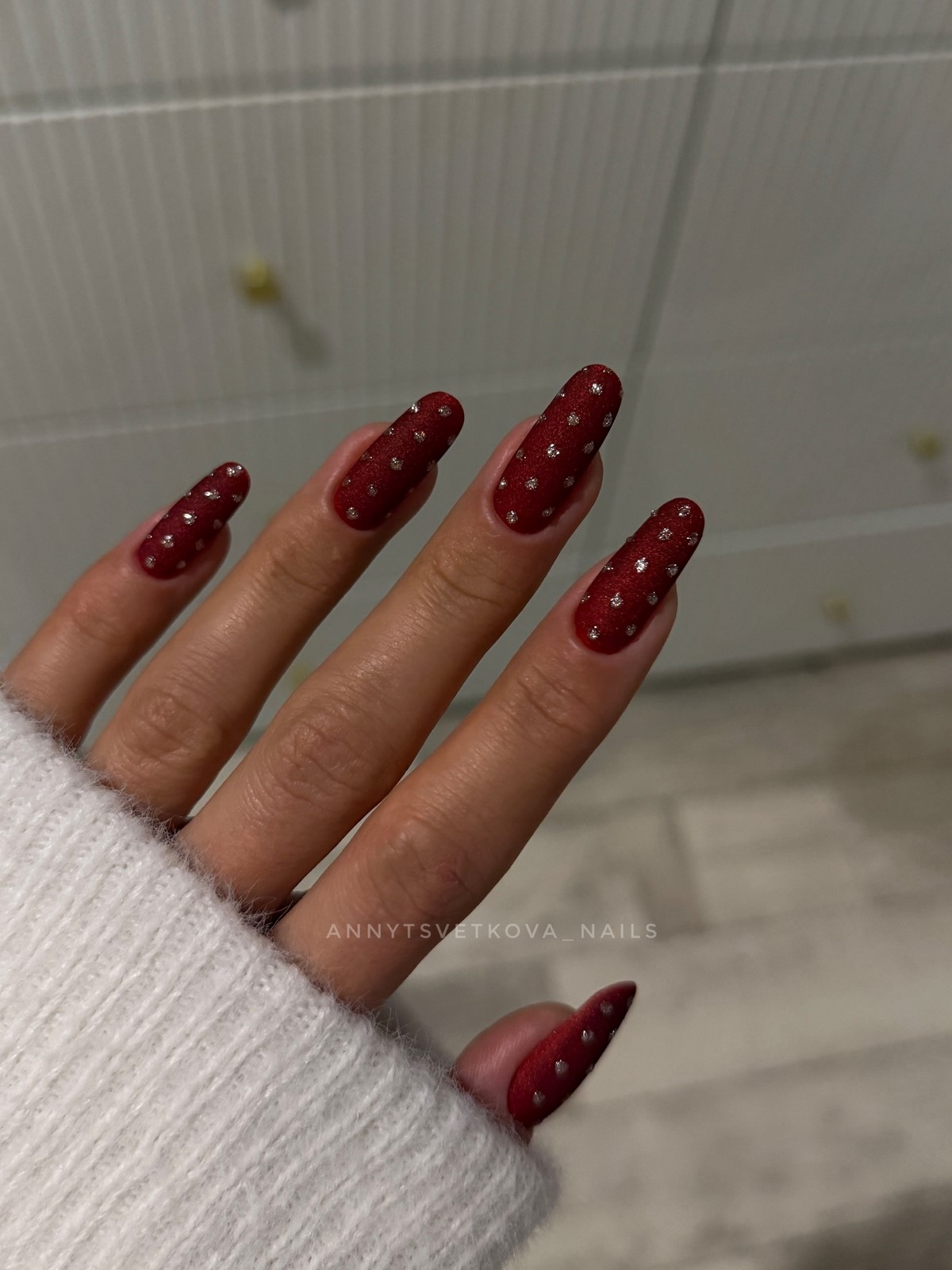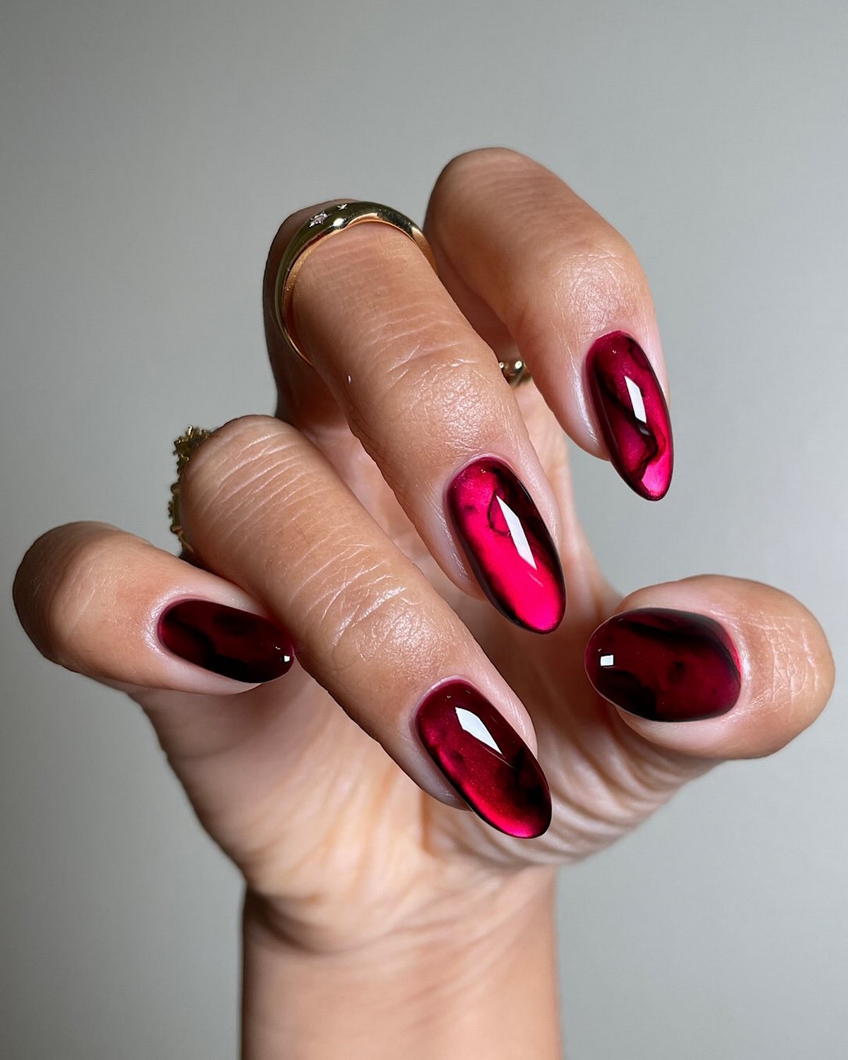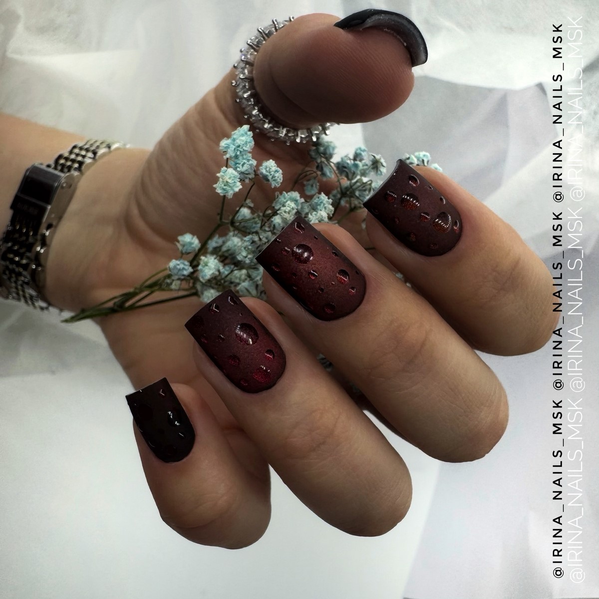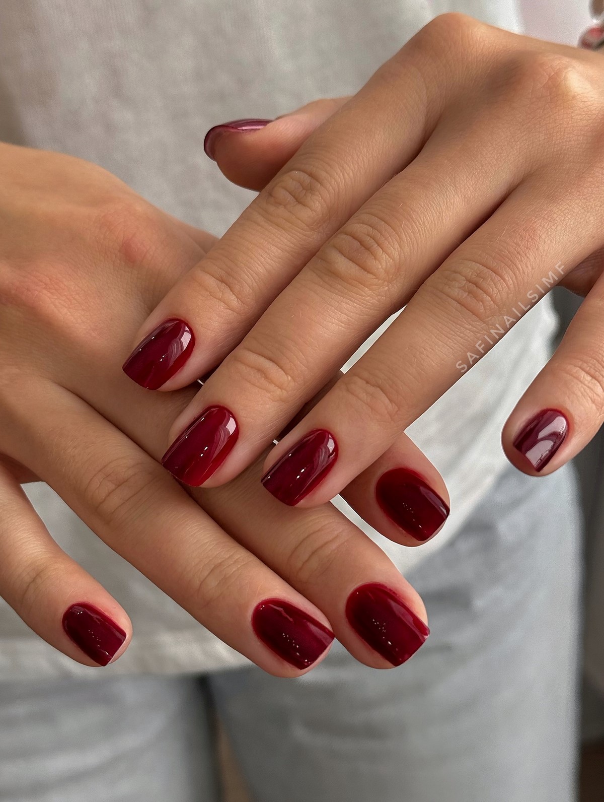 Бордовый маникюр остается классикой зимнего сезона, но в 2026 году он становится глубже и холоднее. В тренде оттенки винного, гранатового и темной вишни без излишнего красного подтона. Такой маникюр выглядит утонченно и подходит как для повседневных, так и для вечерних образов.