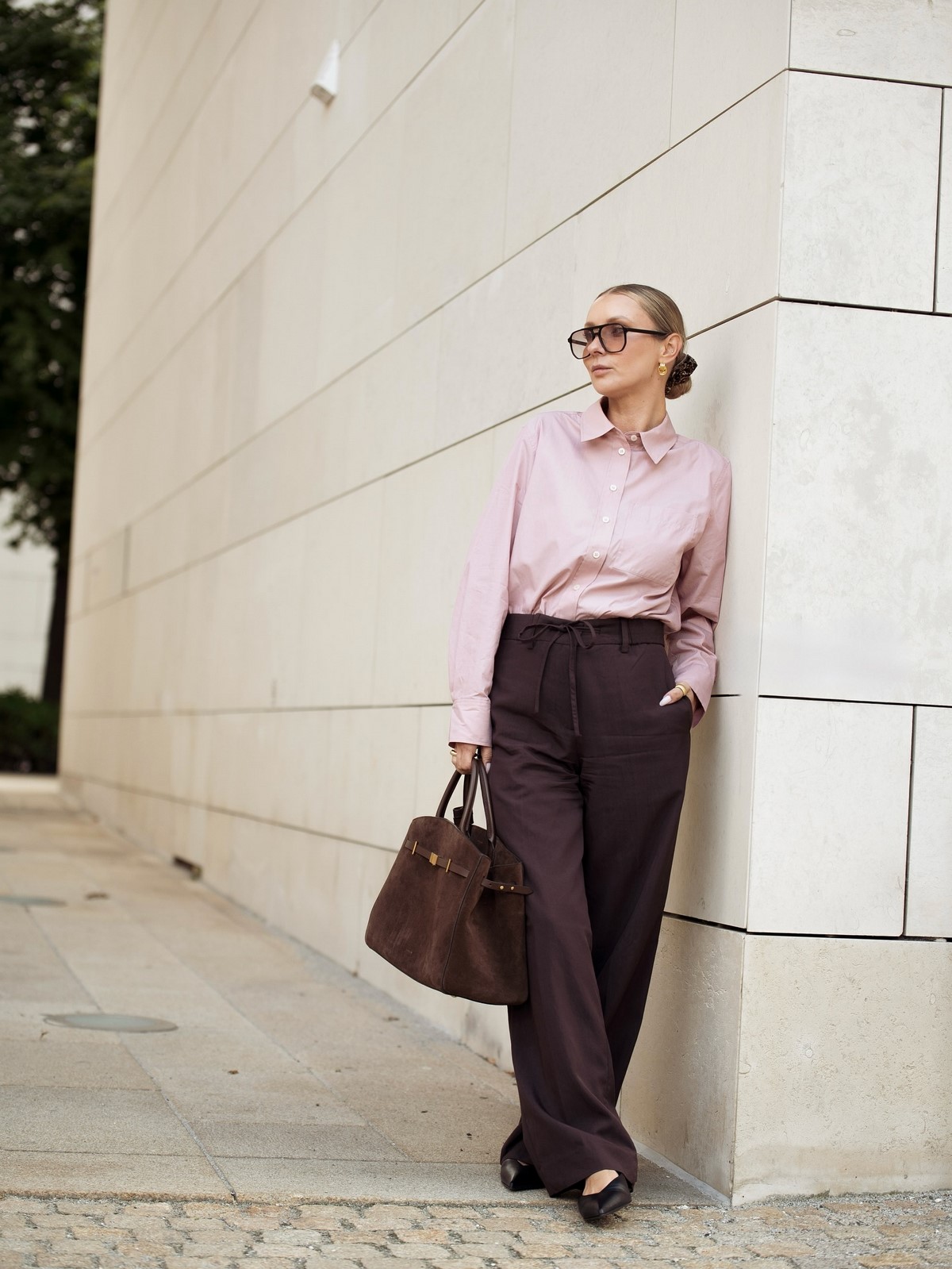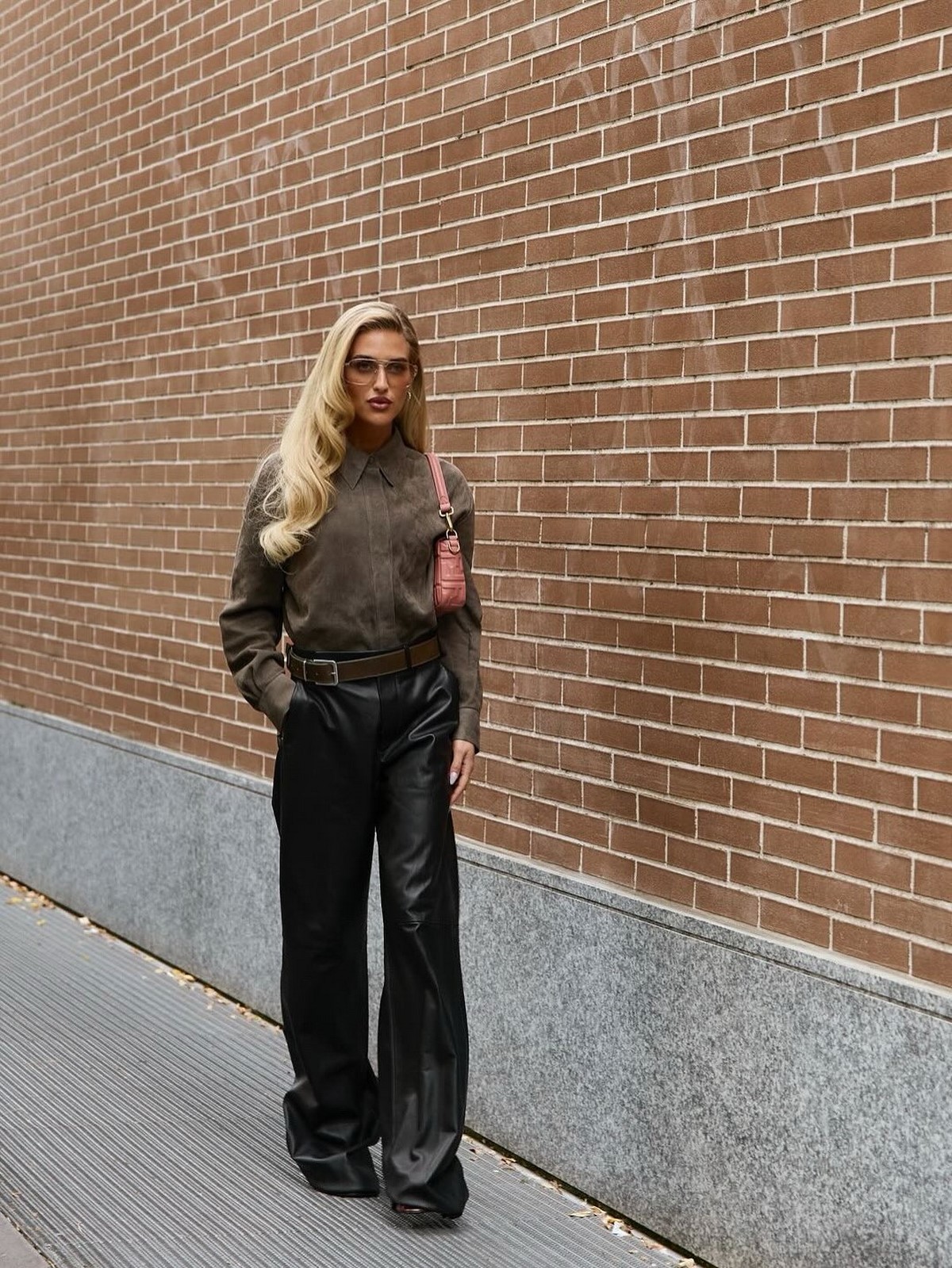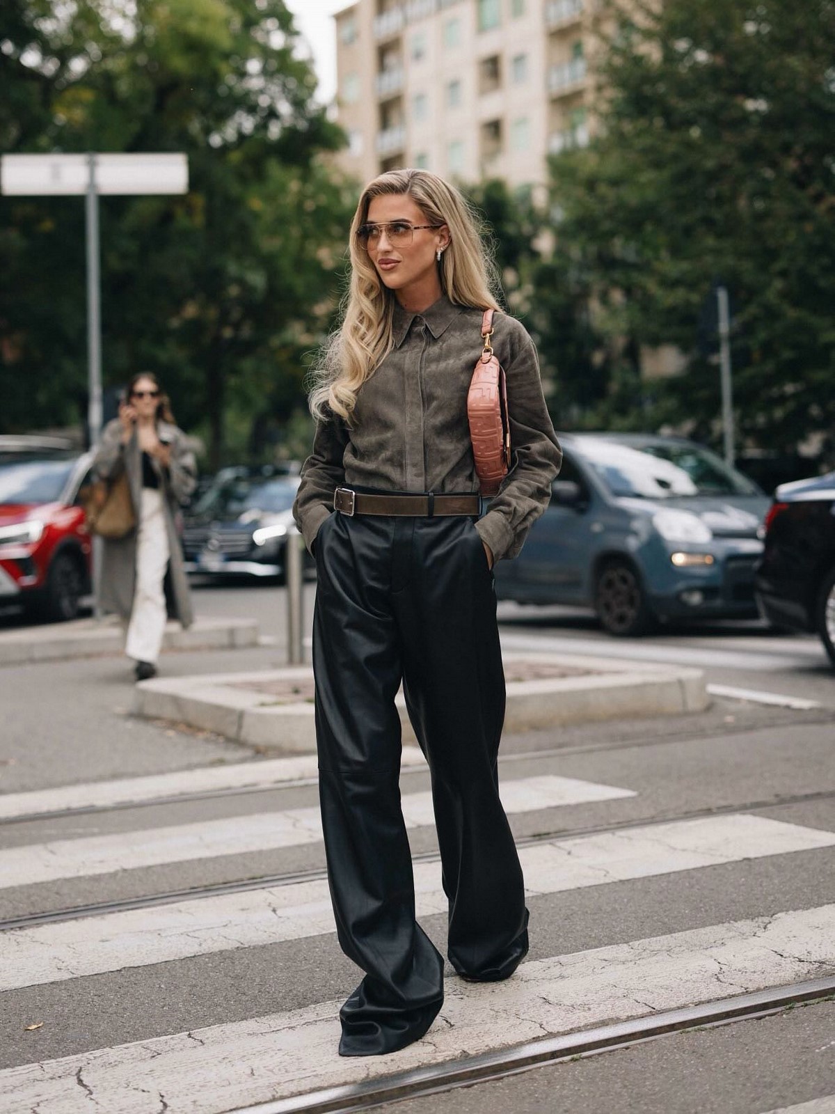 Брюки — основа базового гардероба, и в сезоне 2025-2026 их разнообразие поражает. Модели в полоску или клетку добавляют графичности, кожаные брюки создают эффектный вечерний образ, а варианты с принтами, от анималистичных до геометрических, становятся акцентом образа. Актуальны как прямые, так и слегка расклешенные модели, а также брюки с высокой талией, подчеркивающие силуэт. Цветовая палитра включает классический черный, серый, а также трендовые коричневый и бургунди.