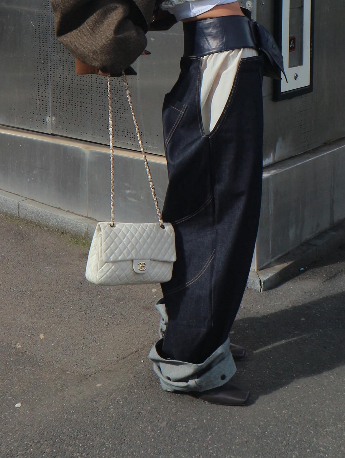 Джинсы получают новую жизнь благодаря интересным деталям и силуэтам. Модели с высокими подворотами демонстрируют обувь и создают casual-образ, рваные джинсы добавляют дерзости, а варианты с низкой талией возвращают нас в эстетику 2000-х. Клеш снова в тренде, особенно модели с расширением от колена. Актуальны джинсы не только в классическом синем, но и в черном, сером, а также с эффектом варки или контрастными швами.