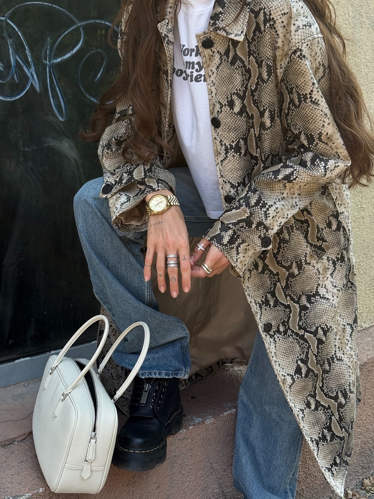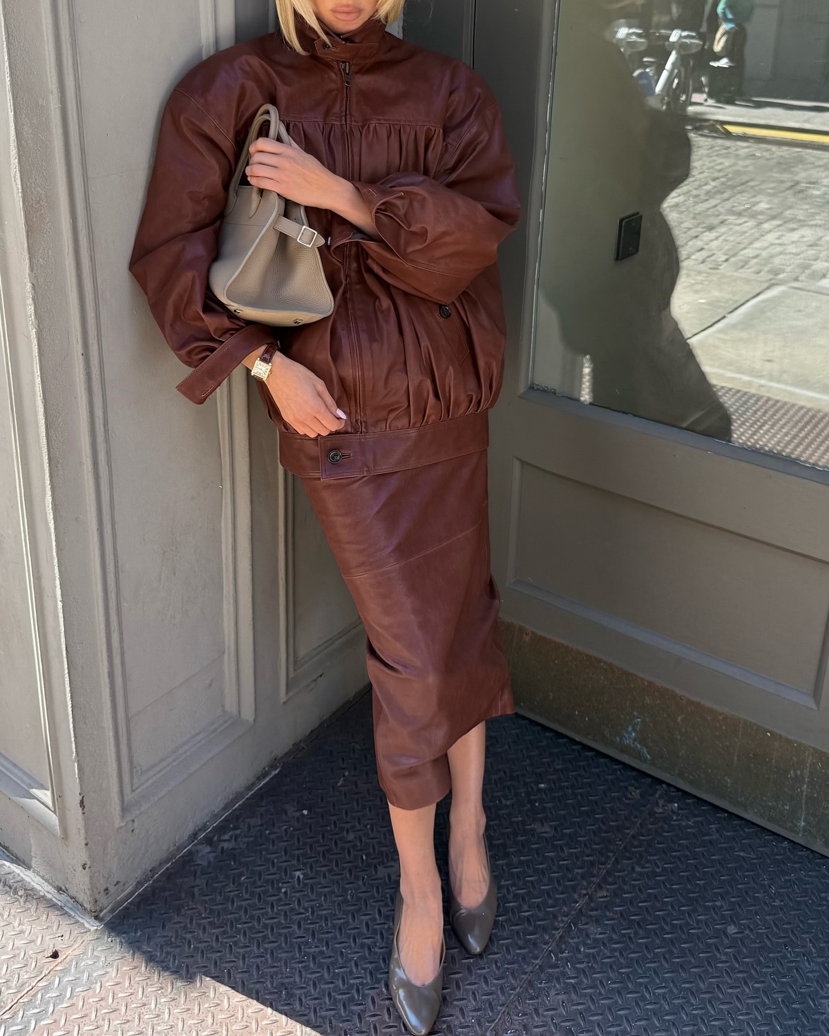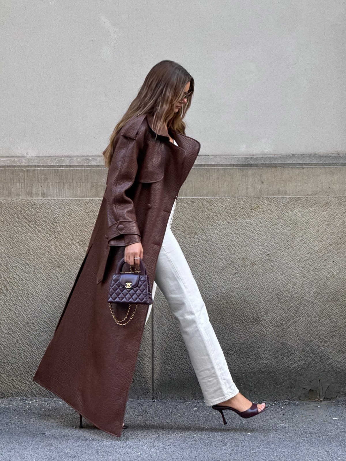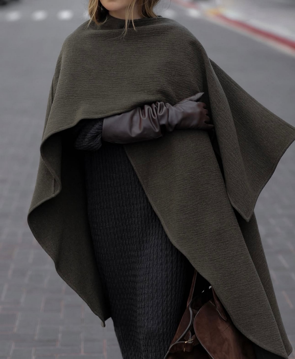 Плащ переживает настоящий ренессанс, выходя за рамки привычного бежевого тренча. Кожаные и замшевые плащи насыщенных оттенков — коричневого, винного, черного — становятся главным акцентом гардероба. Особенно актуальны модели с тиснением под крокодила или змею, которые добавляют образу роскоши и современности. Плащи с поясами, подчеркивающими талию, и интересными деталями кроя помогают создать элегантный силуэт даже в дождливую погоду.