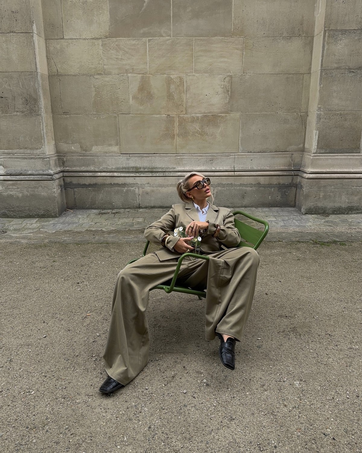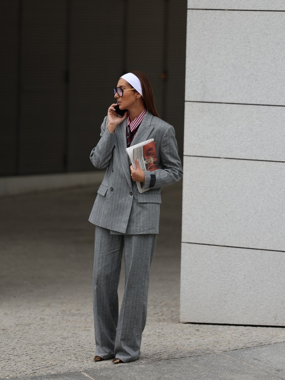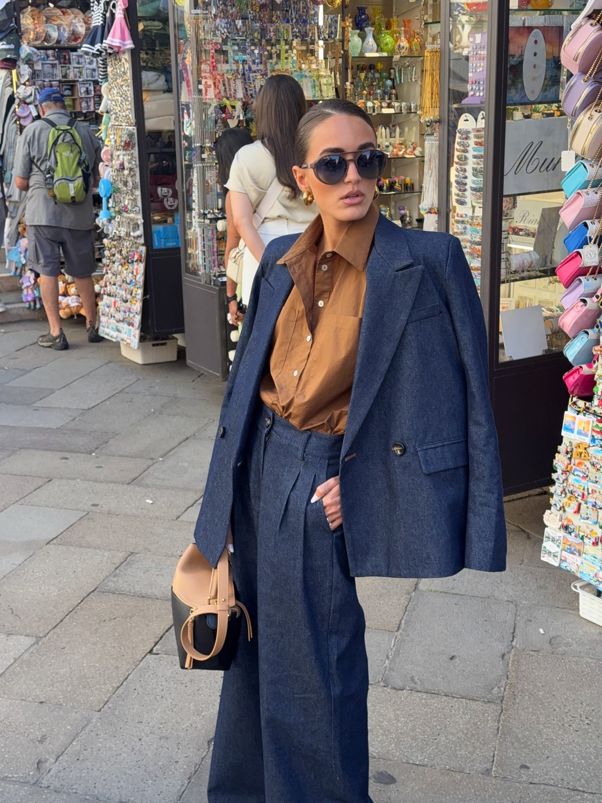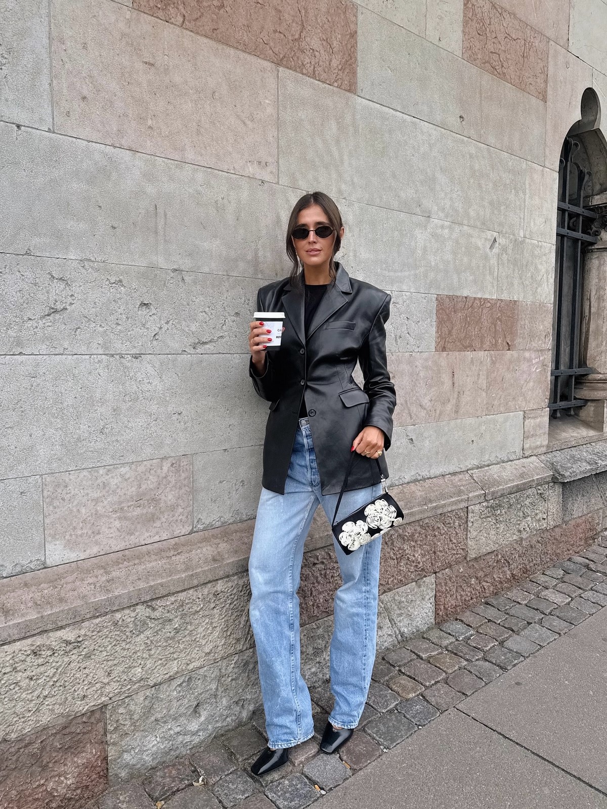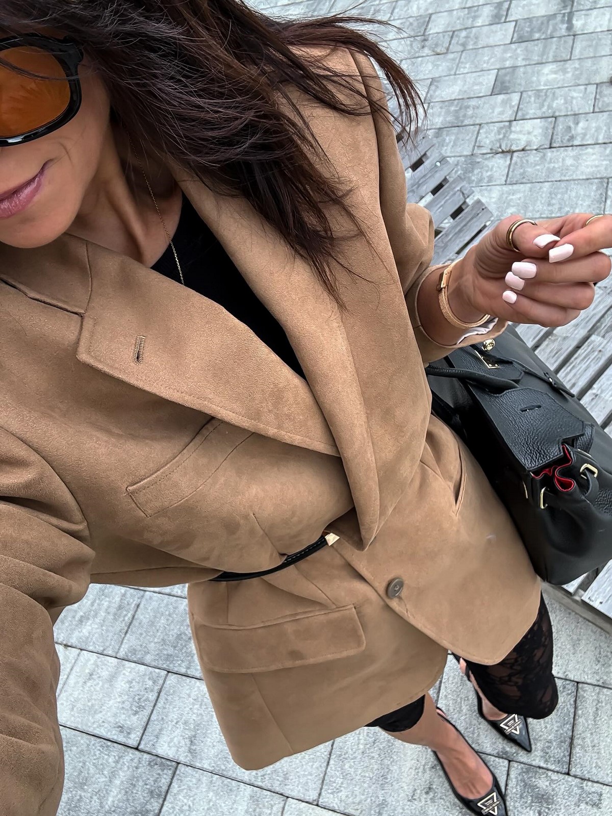 Пиджак остается базовым элементом, но в сезоне 2025-2026 он получает новое прочтение через необычные материалы и принты. Замшевые и кожаные пиджаки добавляют текстуры классическому образу, а модели в клетку или полоску привносят графичность. Особое внимание — пиджакам с акцентом на талии: приталенные модели, пиджаки с поясами или баской создают женственный силуэт и отлично комбинируются как с брюками, так и с юбками.