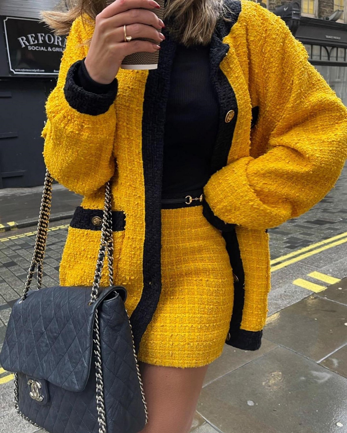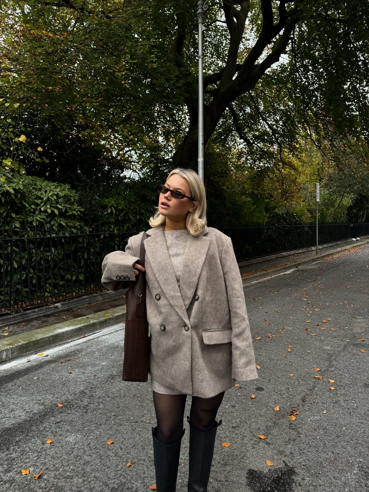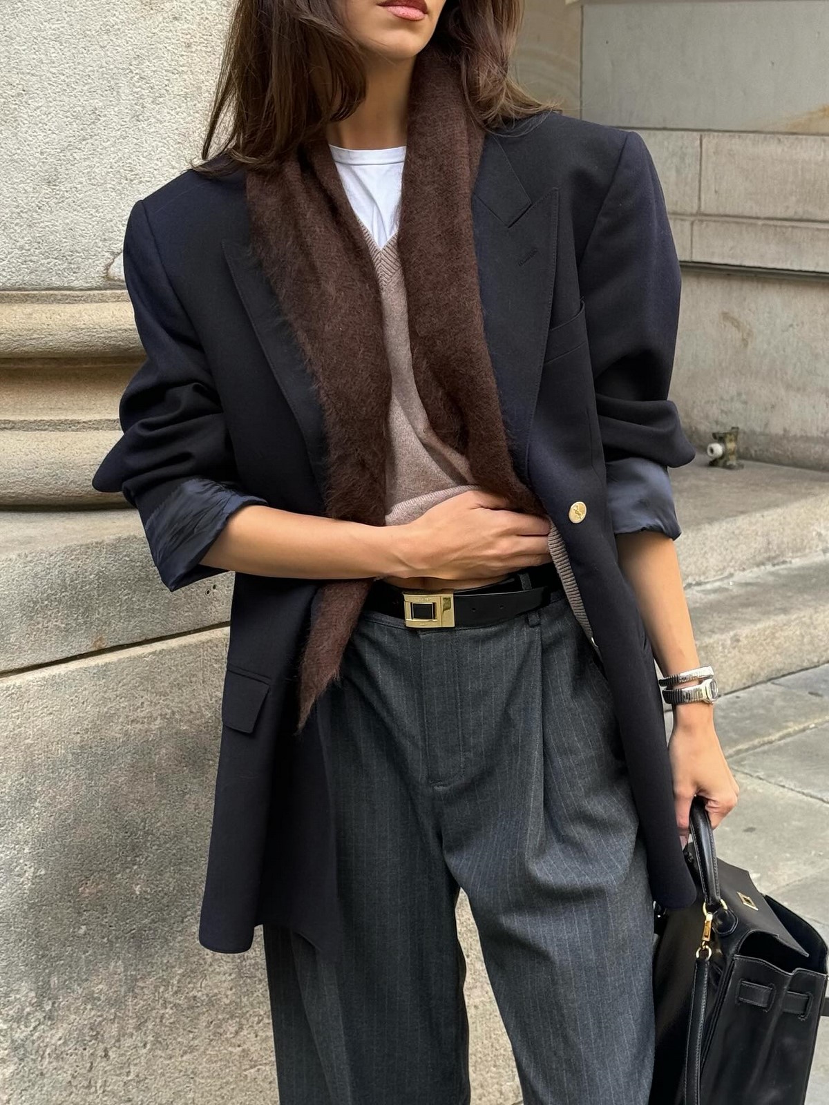 - Силуэты: комфортные и свободные, но с акцентом на женственность — трендовые пальто-пиджаки, жакеты с подчеркнутой талией, объемные свитера.