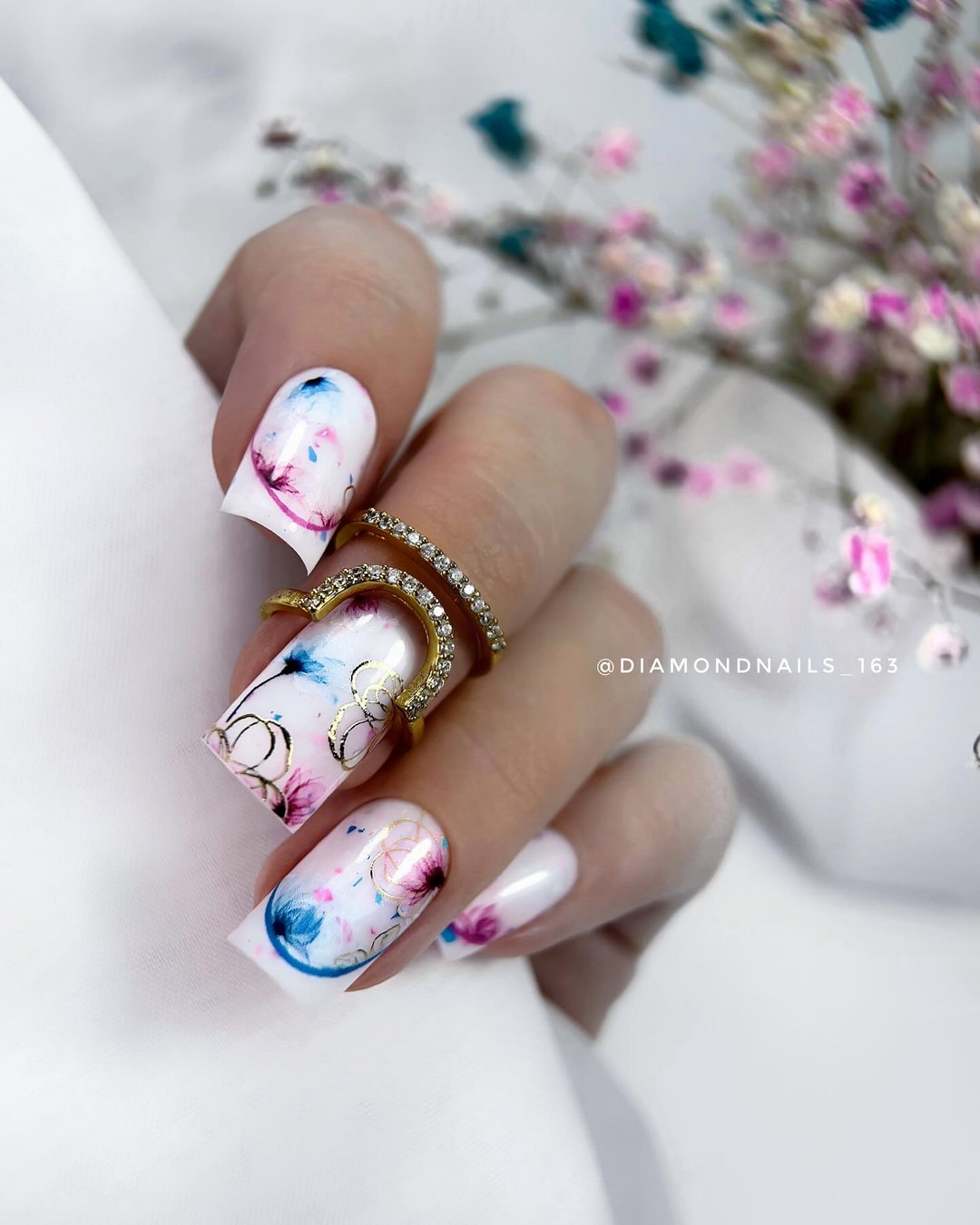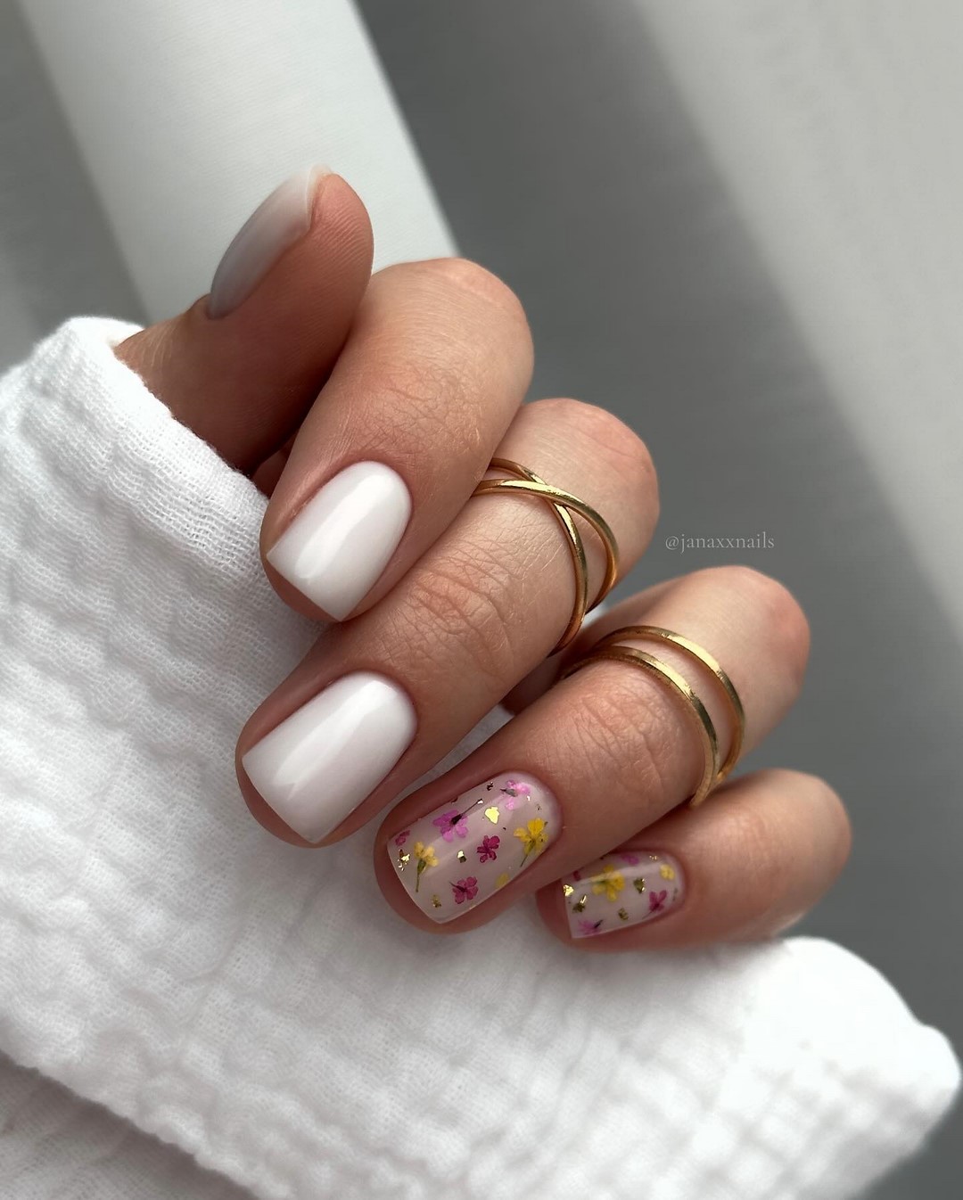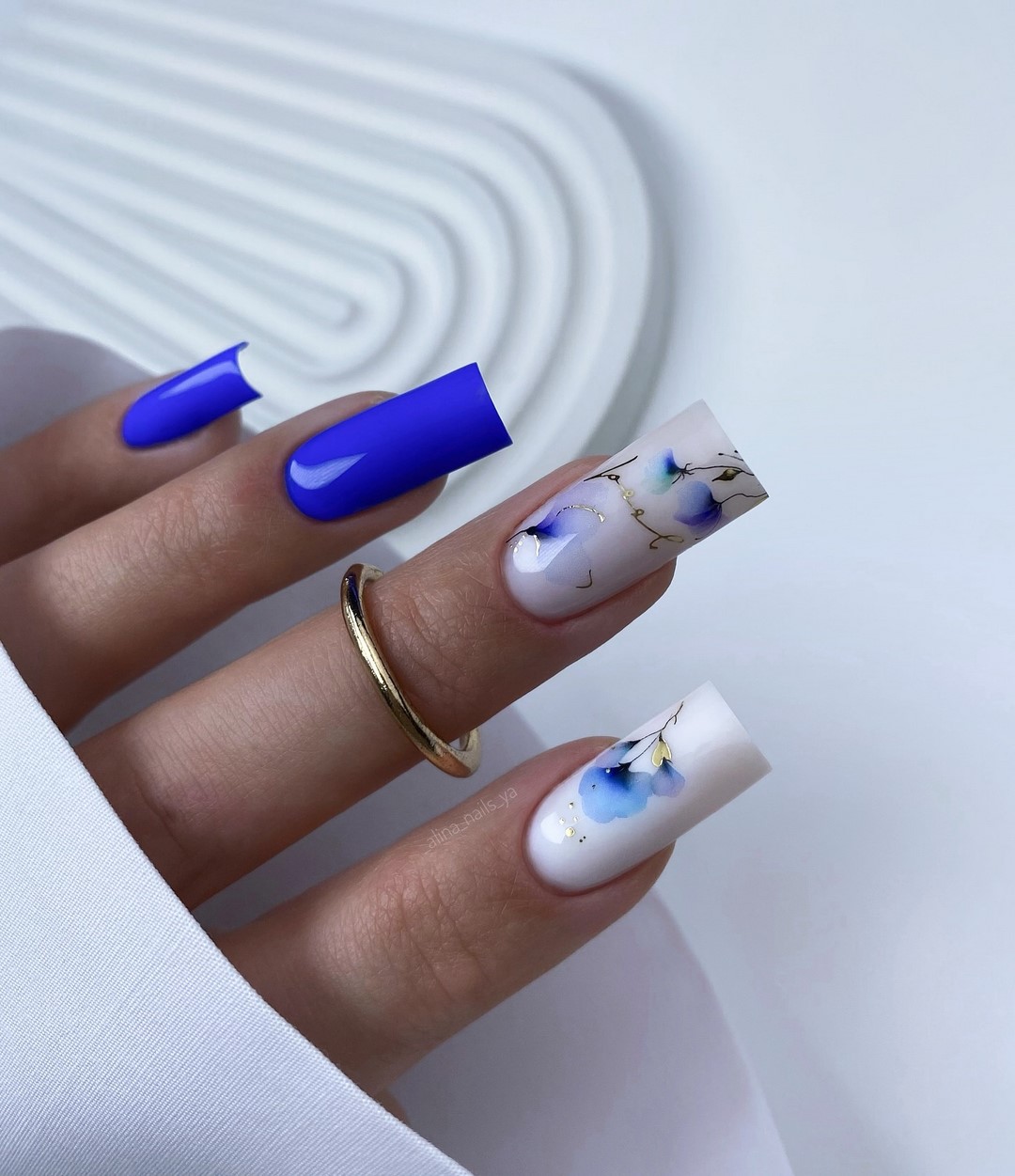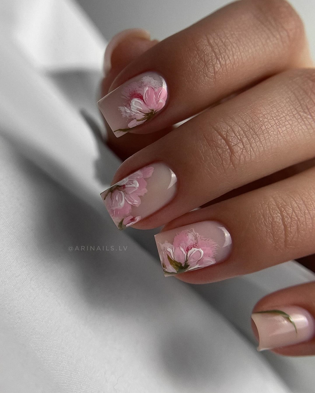 Цветочный маникюр остается фаворитом теплого сезона, добавляя образу нежности и романтики. В тренде как реалистичные рисунки с прорисовкой лепестков и бутонов, так и стилизованные минималистичные цветочные узоры. Популярны объемные 3D-декоры в виде мелких цветков, а также использование сухоцветов под прозрачным покрытием. Цветовая гамма варьируется от пастельных до насыщенных оттенков, подчеркивающих весеннее настроение.