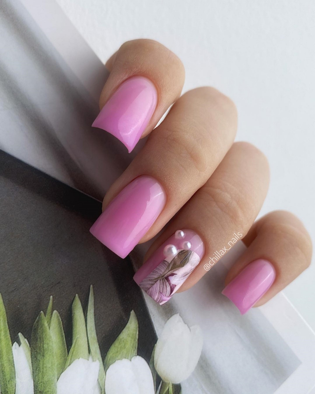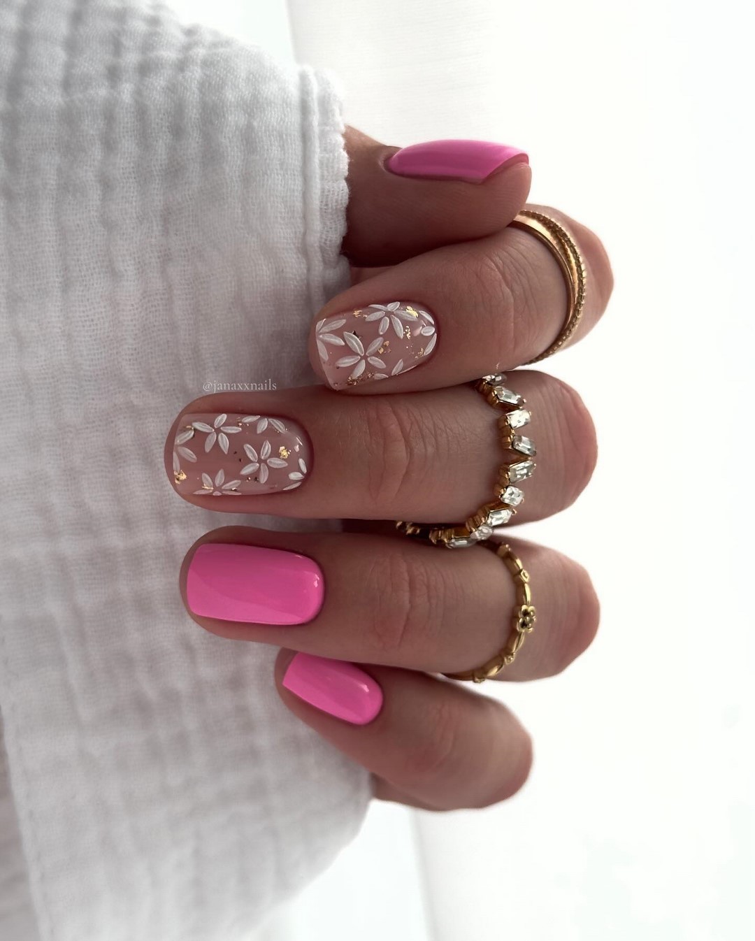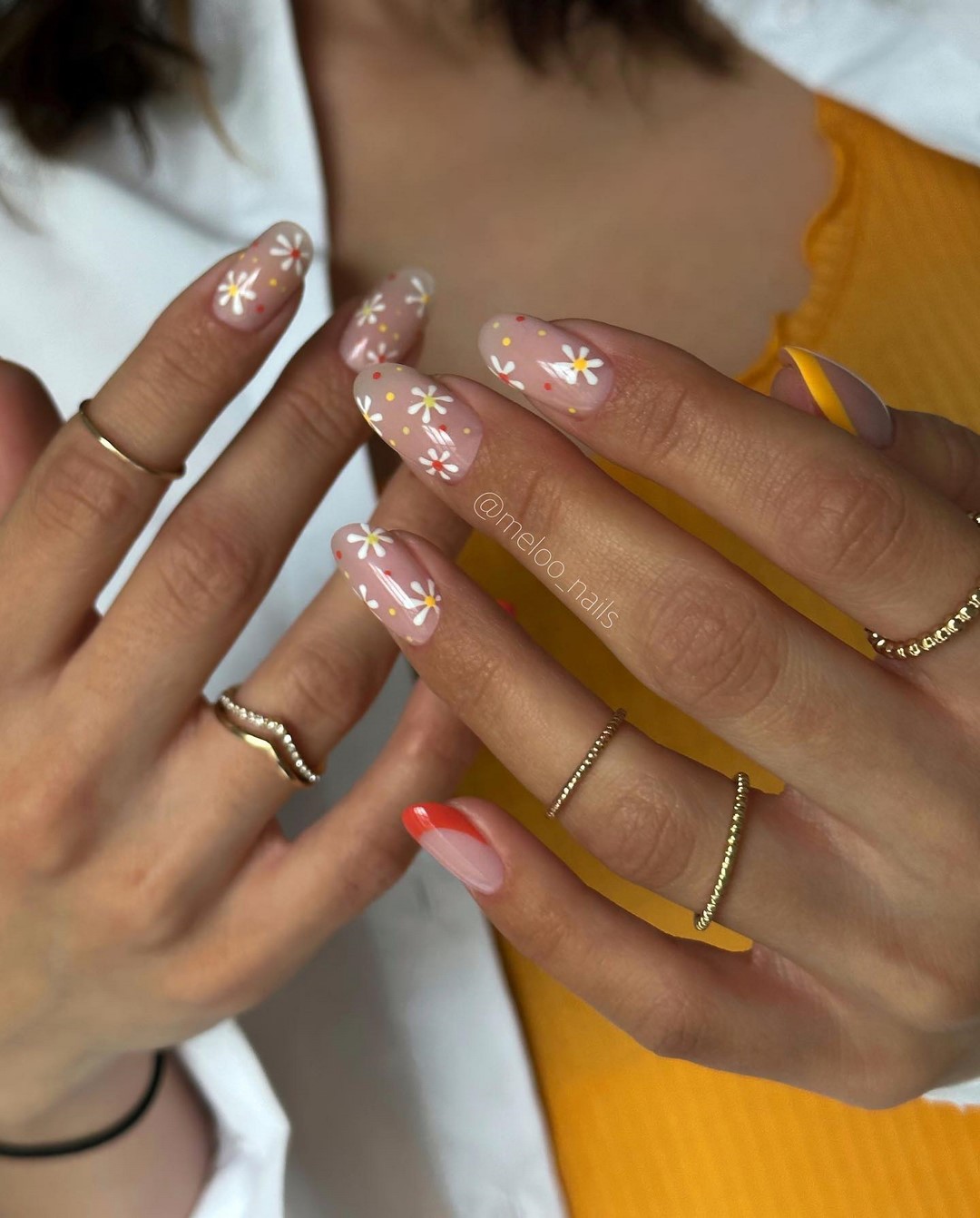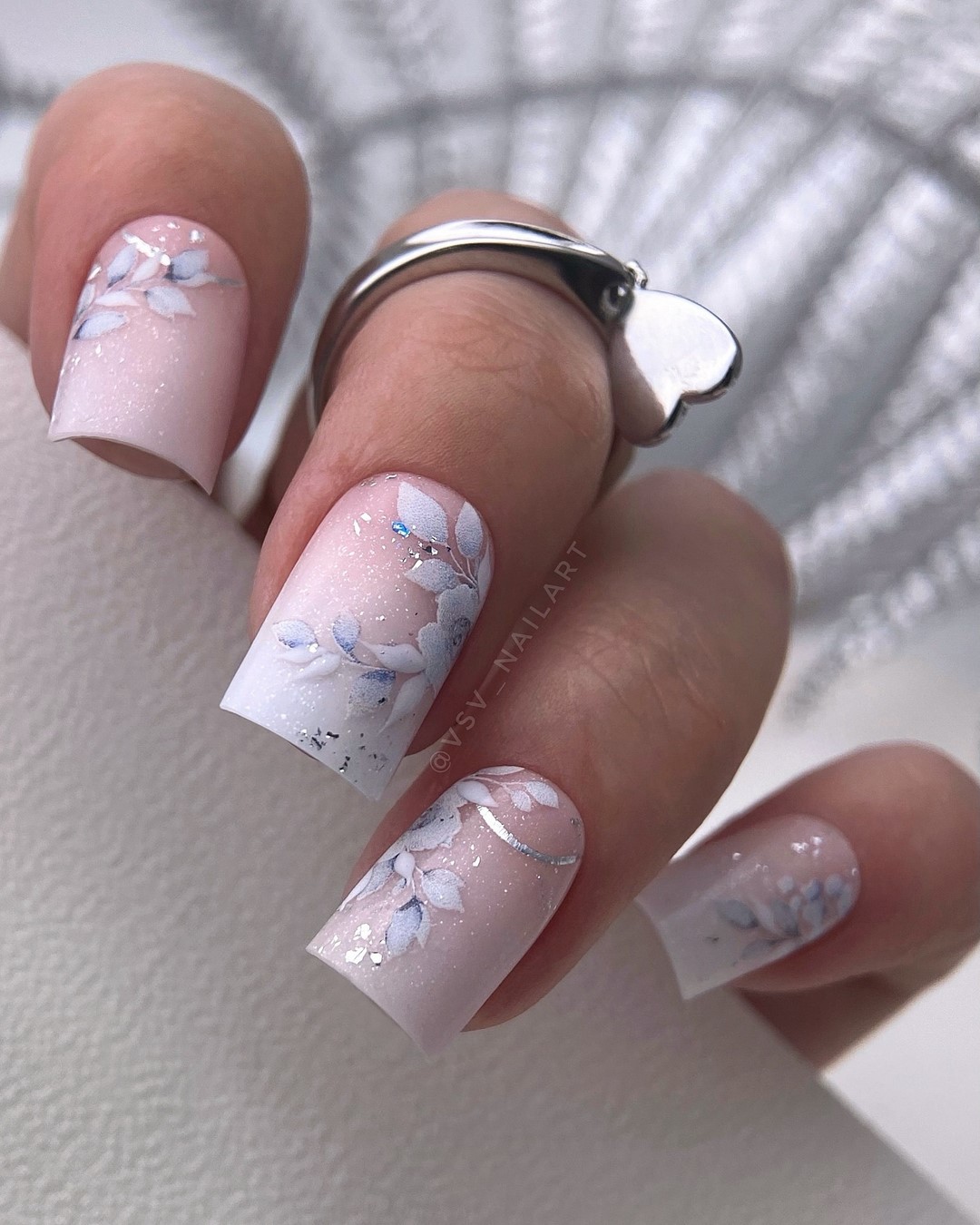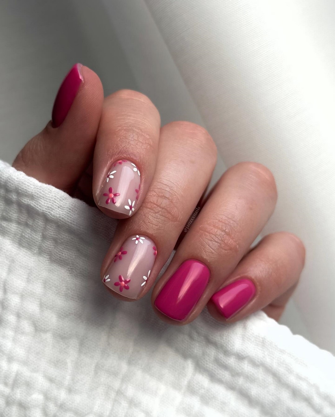 Цветочный маникюр остается фаворитом теплого сезона, добавляя образу нежности и романтики. В тренде как реалистичные рисунки с прорисовкой лепестков и бутонов, так и стилизованные минималистичные цветочные узоры. Популярны объемные 3D-декоры в виде мелких цветков, а также использование сухоцветов под прозрачным покрытием. Цветовая гамма варьируется от пастельных до насыщенных оттенков, подчеркивающих весеннее настроение.