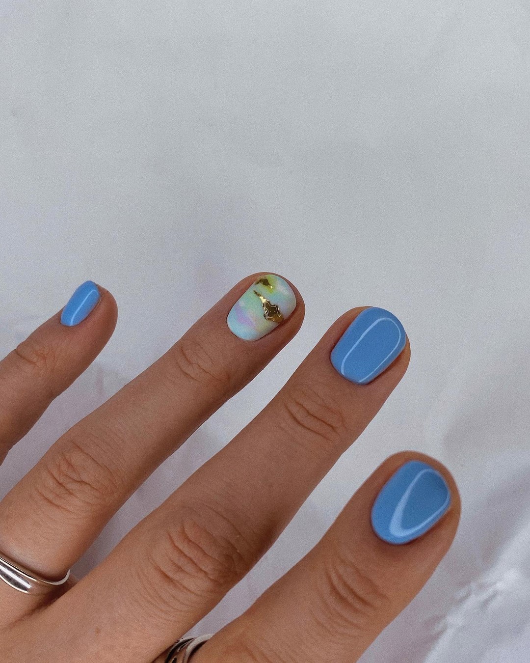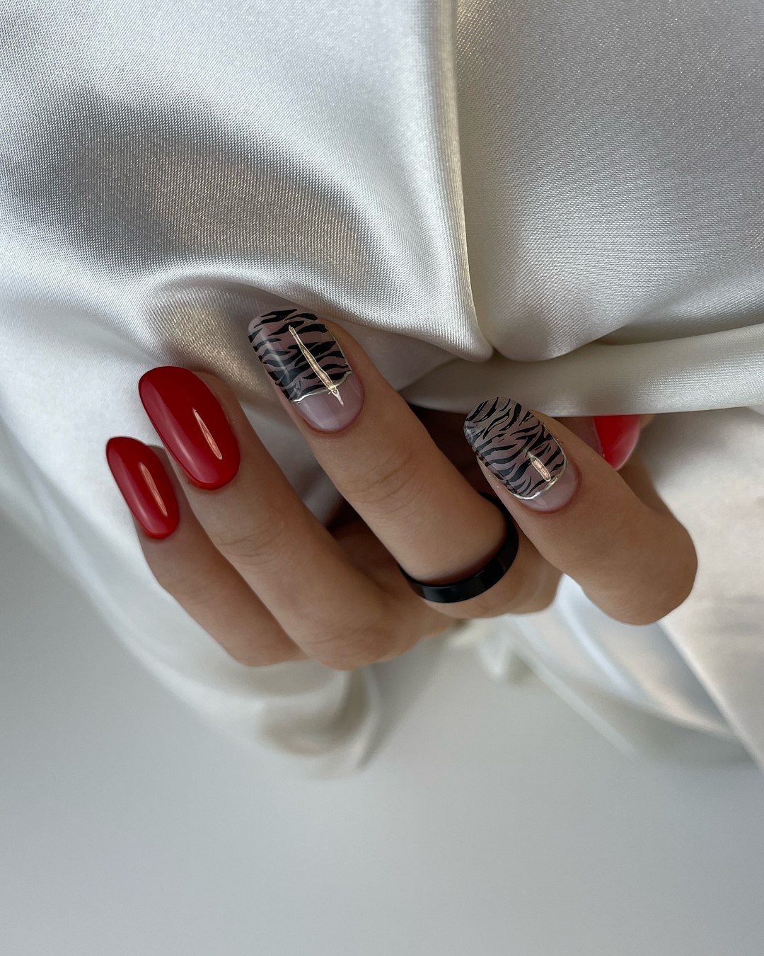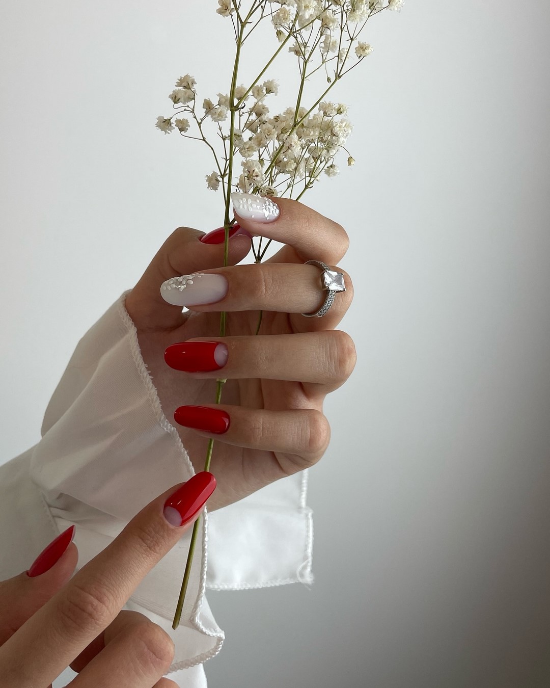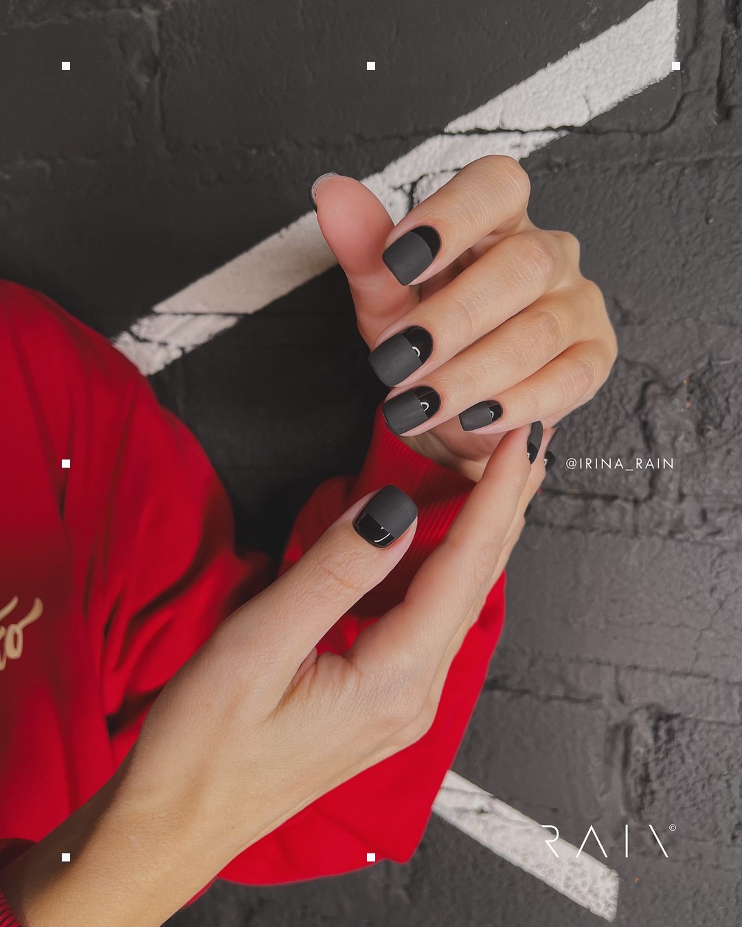 - Необычные текстуры. Матовые и глянцевые покрытия, бархатный эффект, гель-эффект с объемными каплями — сочетание разных фактур делает маникюр более выразительным.