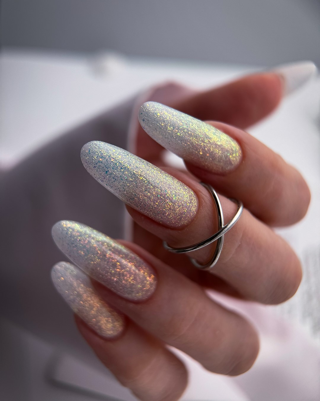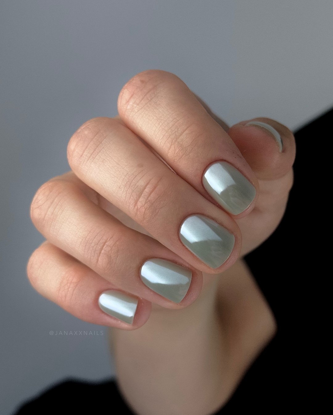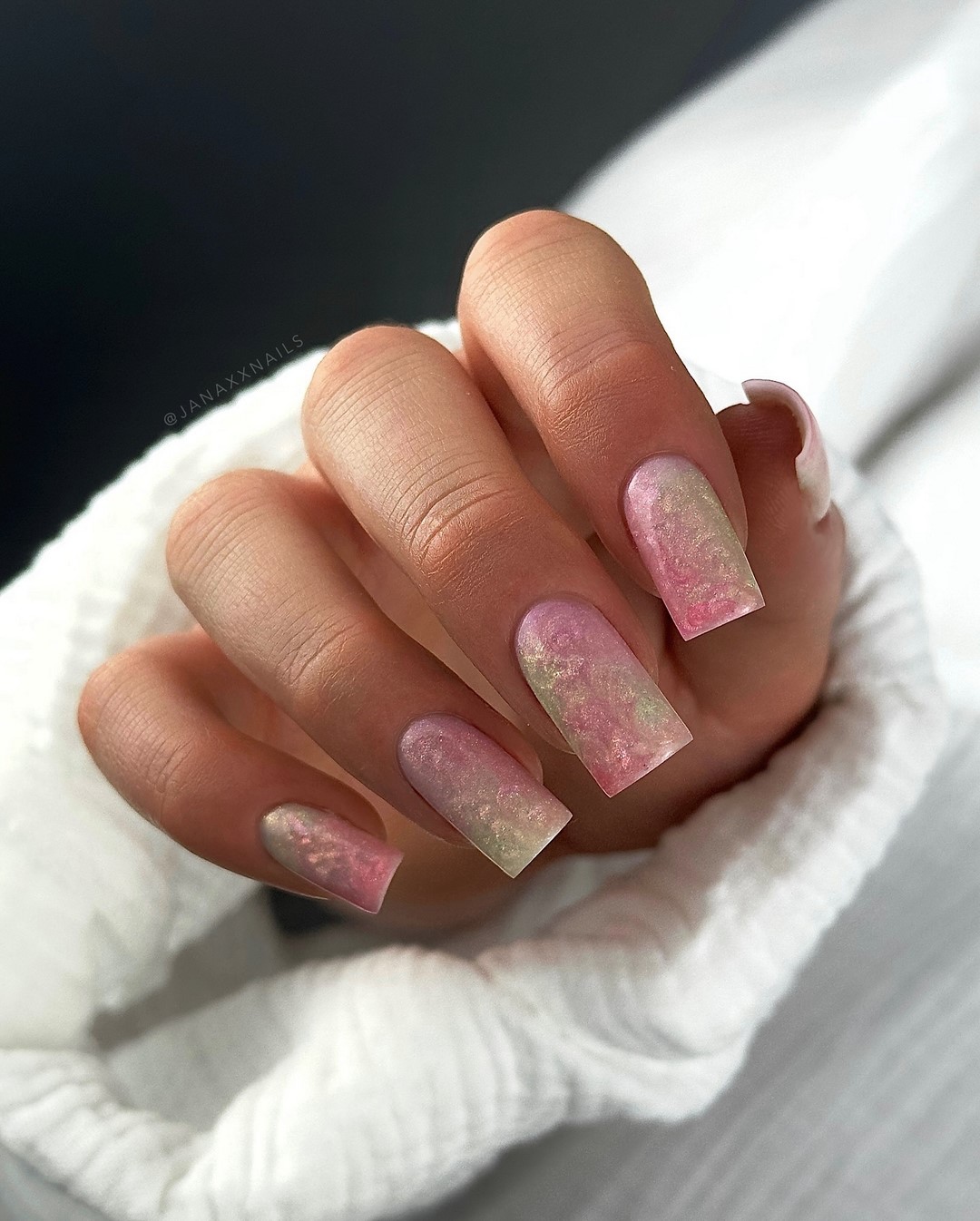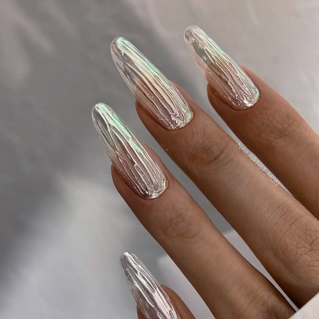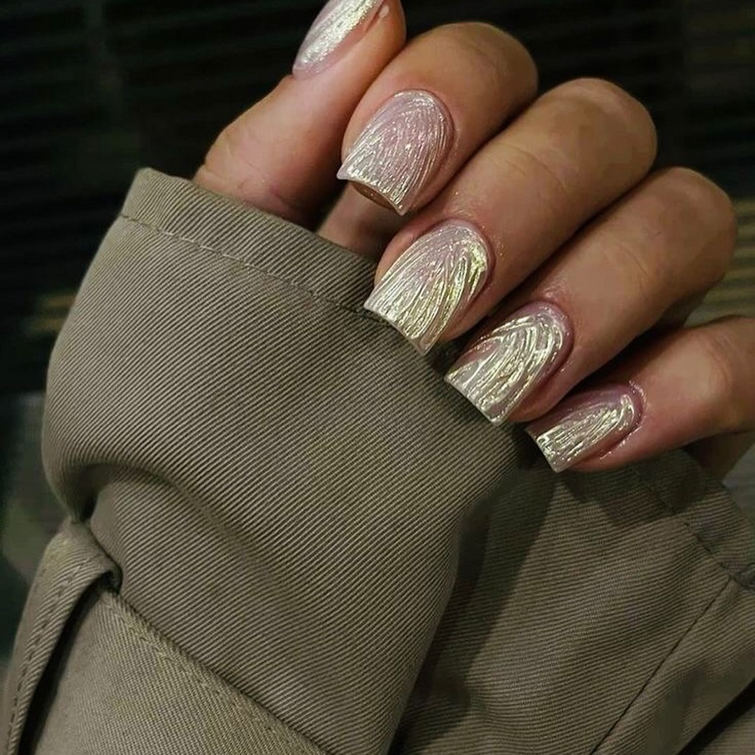 Втирка в сезоне весна-лето 2025 приобретает более мягкие и многогранные оттенки – от перламутрового сияния до голографических переливов. В моде розовый, голубой, золотистый и жемчужный эффекты, создающие деликатный блеск. Такой маникюр хорошо смотрится как на длинных, так и на коротких ногтях, придавая им визуальную гладкость и зеркальное сияние. Втирка может использоваться как на всех ногтях, так и точечно, например, для создания акцента на одном или двух пальцах.