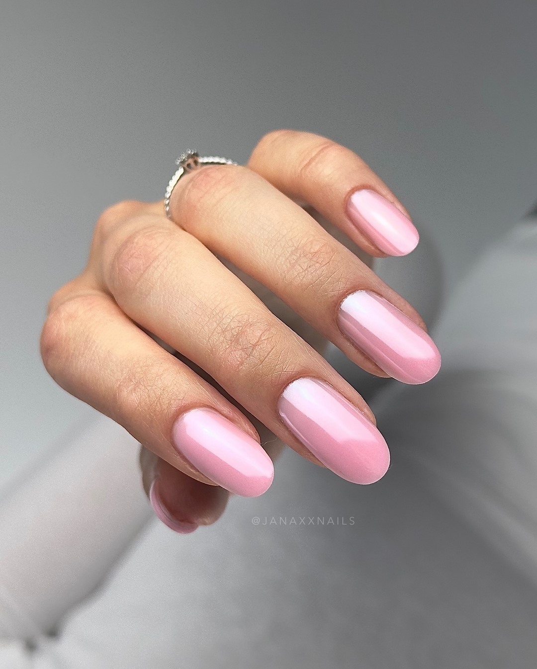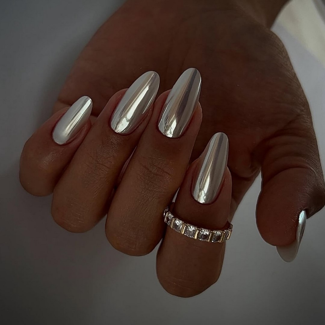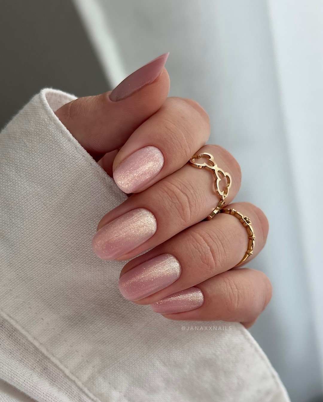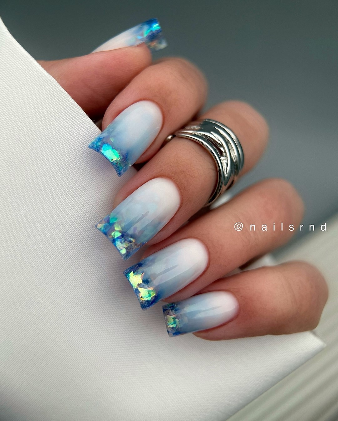 Втирка в сезоне весна-лето 2025 приобретает более мягкие и многогранные оттенки – от перламутрового сияния до голографических переливов. В моде розовый, голубой, золотистый и жемчужный эффекты, создающие деликатный блеск. Такой маникюр хорошо смотрится как на длинных, так и на коротких ногтях, придавая им визуальную гладкость и зеркальное сияние. Втирка может использоваться как на всех ногтях, так и точечно, например, для создания акцента на одном или двух пальцах.