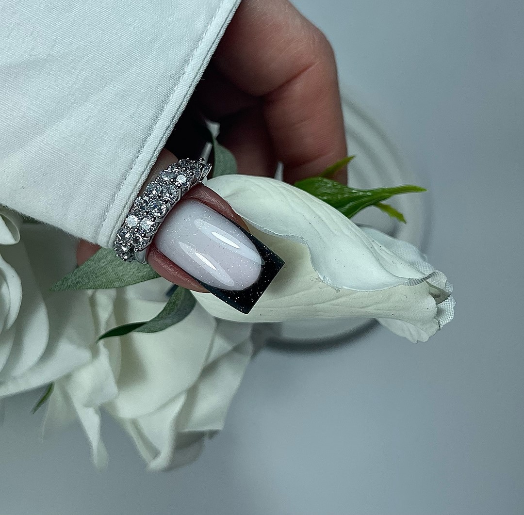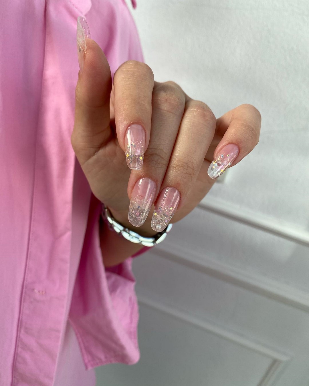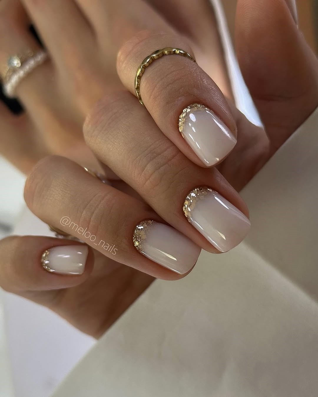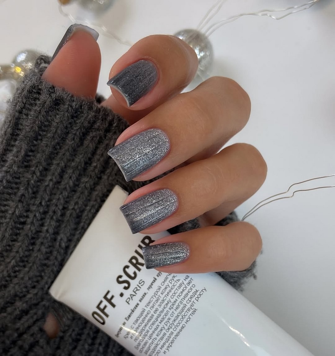 Этот тренд придает ногтям утонченный и сияющий вид, создавая эффект мерцающего обрамления. В моде как классические серебристые и золотистые блестки, так и цветные варианты. Можно делать плавный переход блесток к центру ногтя или оставлять их исключительно у основания. Такой дизайн идеально подходит для вечерних мероприятий, но в умеренной подаче может использоваться и в повседневных образах.