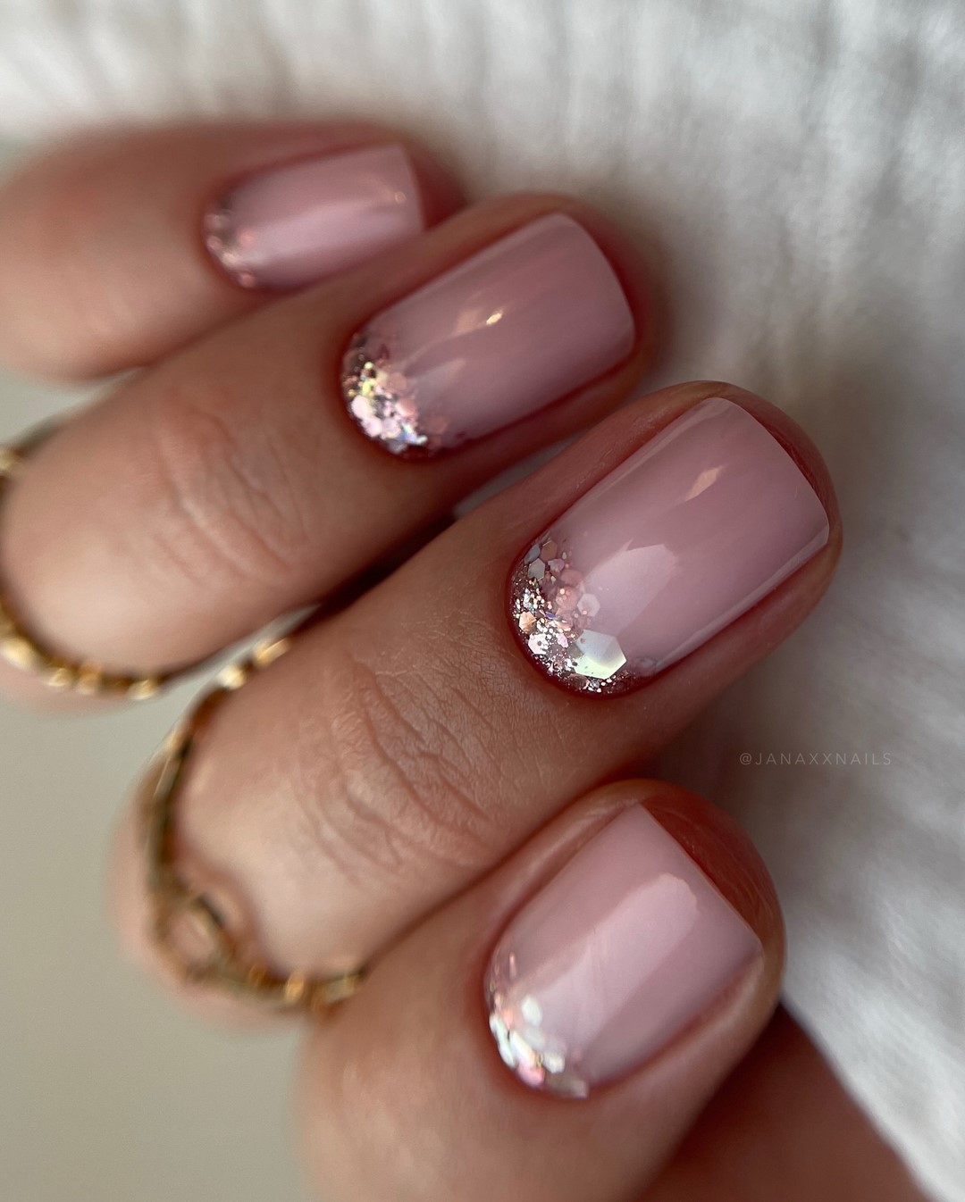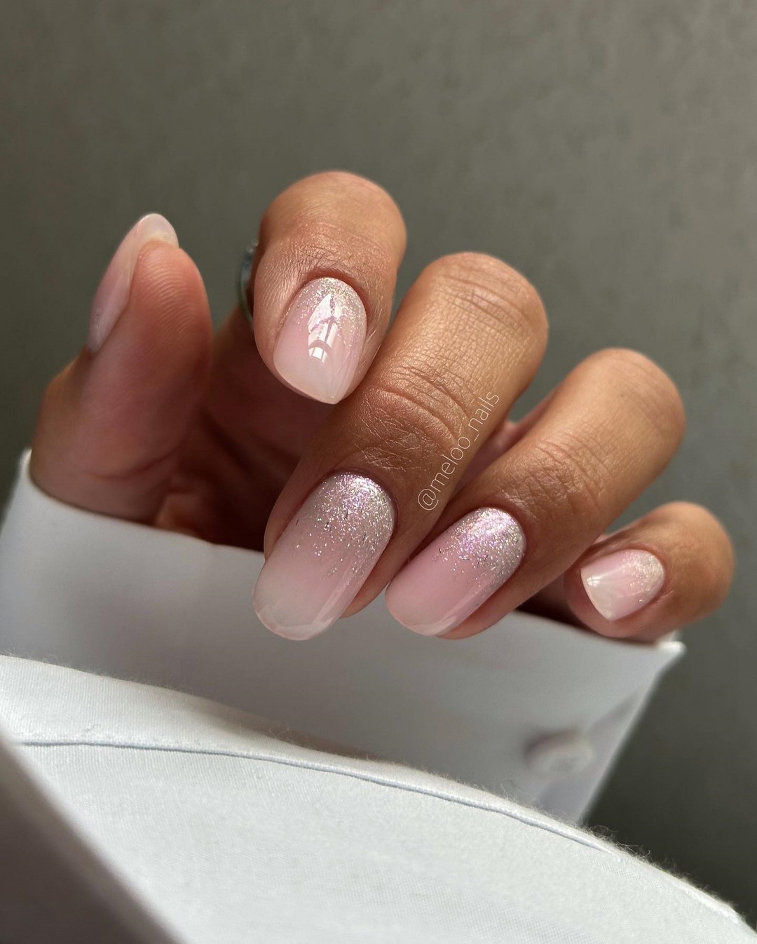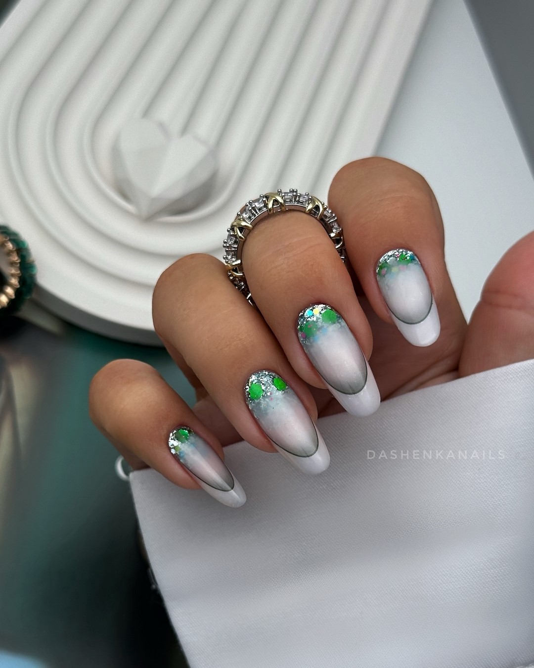 Этот тренд придает ногтям утонченный и сияющий вид, создавая эффект мерцающего обрамления. В моде как классические серебристые и золотистые блестки, так и цветные варианты. Можно делать плавный переход блесток к центру ногтя или оставлять их исключительно у основания. Такой дизайн идеально подходит для вечерних мероприятий, но в умеренной подаче может использоваться и в повседневных образах.